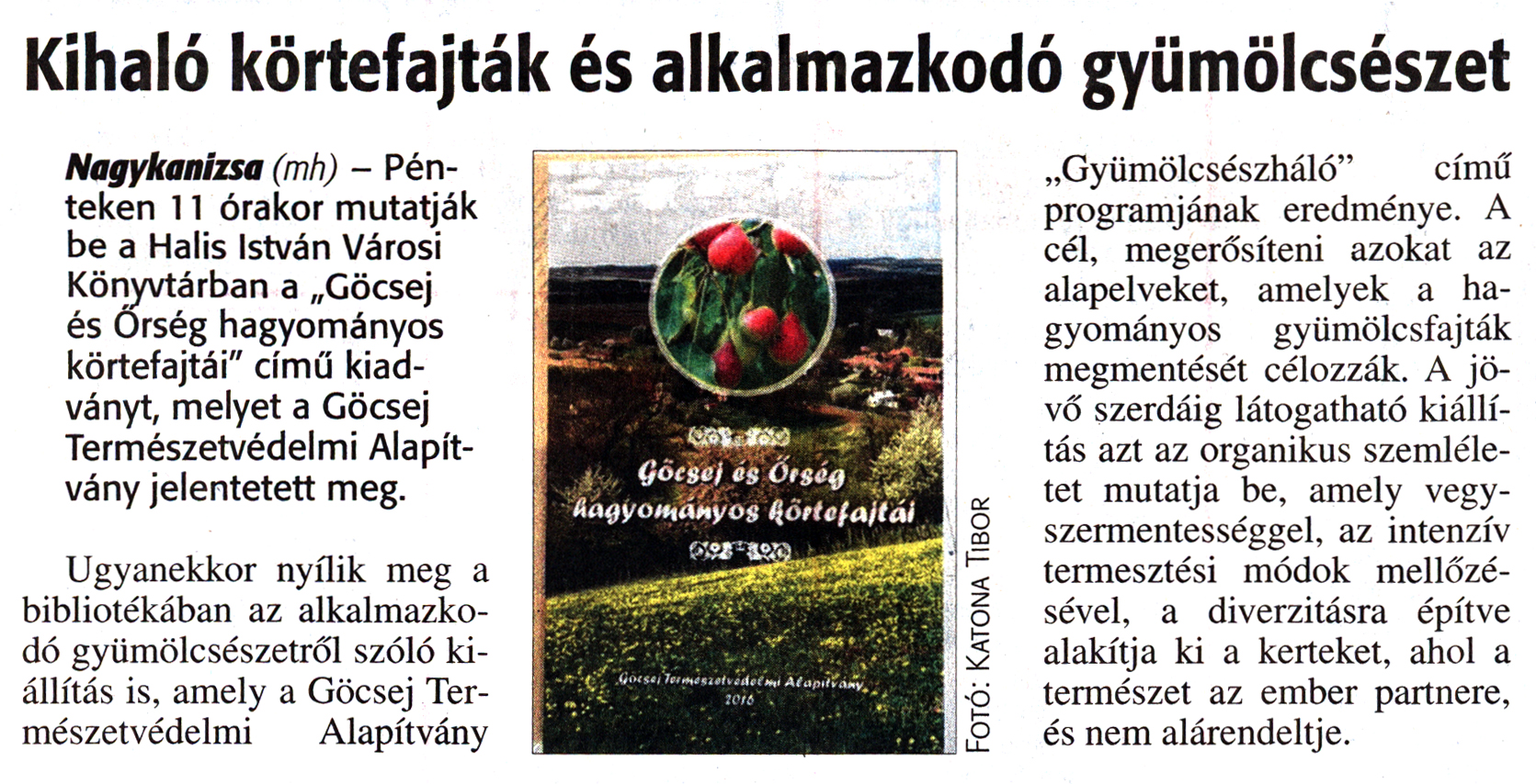 Nyilvános 1658 | 3300 | Zalai Hírlap 2016. június 22. 145. szám 7. oldal | Kihaló körtefajták és alkalmazkodó gyümölcsészet Nagykanizsa (mh) - Pénteken 11 órakor mutatják be a Halis István Városi Könyvtárban a „Göcsej és Őrség hagyományos körtefajtái" című kiadványt, melyet a Göcsej Természetvédelmi Alapítvány jelentetett meg. Ugyanekkor nyílik meg a bibliotékában az alkalmazkodó gyümölcsészetről szóló kiállítás is, amely a Göcsej Természetvédelmi Alapítvány „Gyümölcsészháló" című programjának eredménye. A cél, megerősíteni azokat az alapelveket, amelyek a hagyományos gyümölcsfajták megmentését célozzák. A jövő szerdáig látogatható kiállítás azt az organikus szemléletet mutatja be, amely vegyszermentességgel, az intenzív termesztési módok mellőzésével, a diverzitásra építve alakítja ki a kerteket, ahol a természet az ember partnere, és nem alárendeltje. |