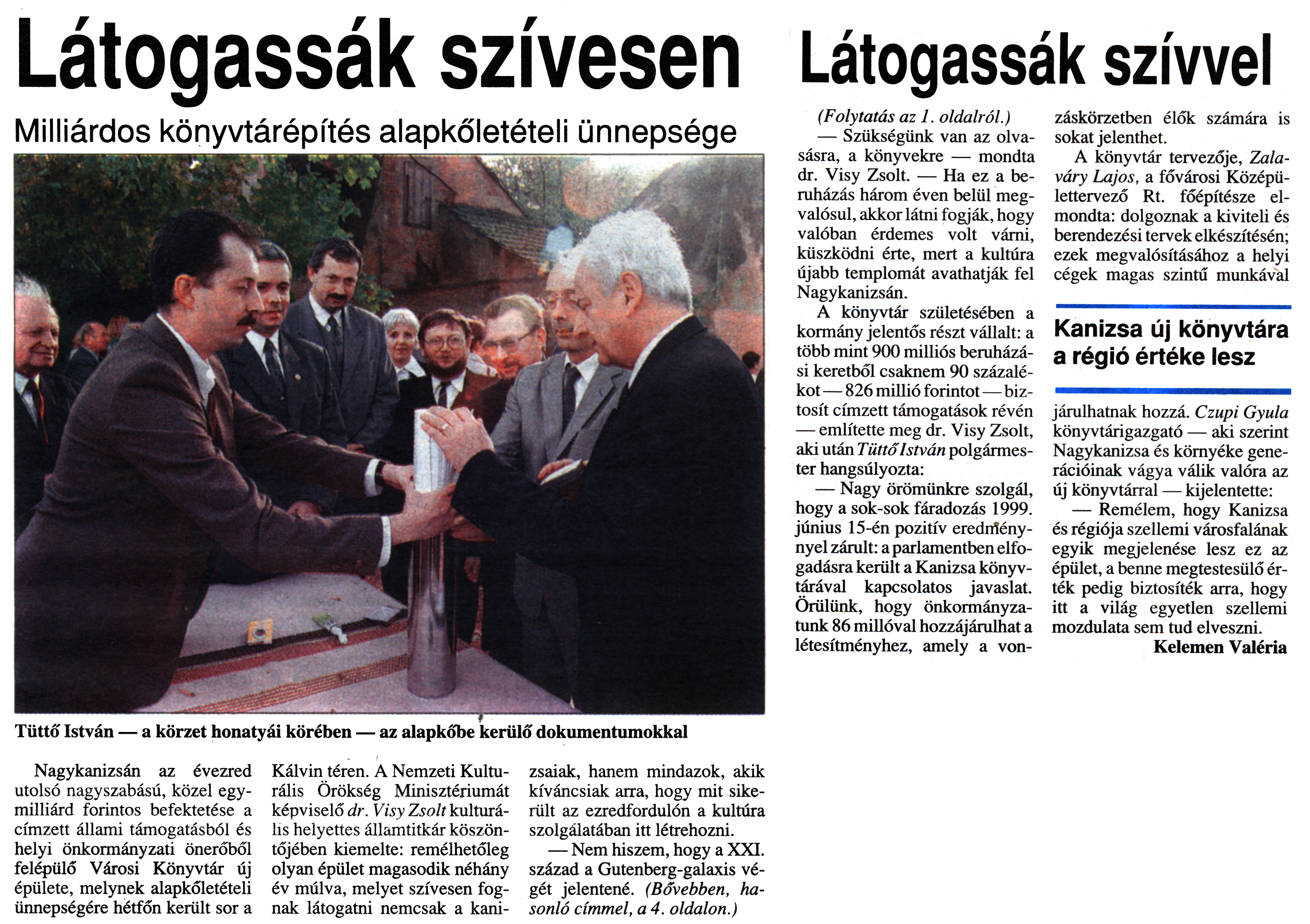 Nyilvános 1403 | 2404 | Zalai Hírlap 1999. október 26. 249. szám 1, 4. oldal - Látogassák szívesen | A cikk szövege: Látogassák szívesen Milliárdos könyvtárépítés alapkőletételi ünnepsége Tüttő István — a körzet honatyái körében — az alapkőbe kerülő dokumentumokkal Nagykanizsán az évezred utolsó nagyszabású, közel egymilliárd forintos befektetése a címzett állami támogatásból és helyi önkormányzati önerőből felépülő Városi Könyvtár új épülete, melynek alapkőletételi ünnepségére hétfőn került sor a Kálvin téren. A Nemzeti Kulturális Örökség Minisztériumát képviselő dr. Visy Zsolt kulturális helyettes államtitkár köszöntőjében kiemelte: remélhetőleg olyan épület magasodik néhány év múlva, melyet szívesen fognak látogatni nemcsak a kanizsaiak, hanem mindazok, akik kíváncsiak arra, hogy mit sikerült az ezredfordulón a kultúra szolgálatában itt létrehozni. — Nem hiszem, hogy a XXI. század a Gutenberg-galaxis végét jelentené. (Bővebben, hasonló címmel, a 4. oldalon.) Látogassák szívvel (Folytatás az 1. oldalról.) — Szükségünk van az olvasásra, a könyvekre — mondta dr. Visy Zsolt. — Ha ez a beruházás három éven belül megvalósul, akkor látni fogják, hogy valóban érdemes volt várni, küszködni érte, mert a kultúra újabb templomát avathatják fel Nagykanizsán. A könyvtár születésében a kormány jelentős részt vállalt: a több mint 900 milliós beruházási keretből csaknem 90 százalékot — 826 millió forintot—biztosít címzett támogatások révén — említette meg dr. Visy Zsolt, aki után Tüttő István polgármester hangsúlyozta: — Nagy örömünkre szolgál, hogy a sok-sok fáradozás 1999. június 15-én pozitív eredménnyel zárult: a parlamentben elfogadásra került a Kanizsa könyvtárával kapcsolatos javaslat. Örülünk, hogy önkormányzatunk 86 millóval hozzájárulhat a létesítményhez, amely a vonzáskörzetben élők számára is sokat jelenthet. A könyvtár tervezője, Zalaváry Lajos, a fővárosi Középülettervező Rt. főépítésze elmondta: dolgoznak a kiviteli és berendezési tervek elkészítésén; ezek megvalósításához a helyi cégek magas szintű munkával járulhatnak hozzá. Czupi Gyula könyvtárigazgató — aki szerint Nagykanizsa és környéke generációinak vágya válik valóra az új könyvtárral — kijelentette: — Remélem, hogy Kanizsa és régiója szellemi városfalának egyik megjelenése lesz ez az épület, a benne megtestesülő érték pedig biztosíték arra, hogy itt a világ egyetlen szellemi mozdulata sem tud elveszni. Kelemen Valéria |