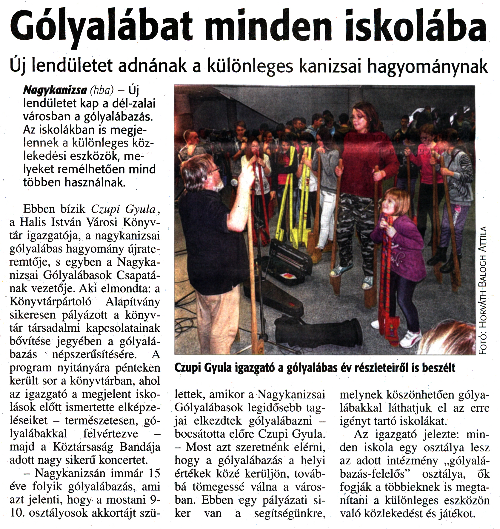 Nyilvános 1669 | 3594 | Zalai Hírlap 2016. november 29. 280. szám 2. oldal - Gólyalábat minden iskolába | Új lendületet adnának a különleges kanizsai hagyománynak Nagykanizsa (hba) - Új lendületet kap a dél-zalai városban a gólyalábazás. Az iskolákban is megjelennek a különleges közlekedési eszközök, melyeket remélhetően mind többen használnak. Ebben bízik Czupi Gyula, a Halis István Városi Könyvtár igazgatója, a nagykanizsai gólyalábas hagyomány újrateremtője, s egyben a Nagykanizsai Gólyalábasok Csapatának vezetője. Aki elmondta: a Könyvtárpártoló Alapítvány sikeresen pályázott a könyvtár társadalmi kapcsolatainak bővítése jegyében a gólyalábazás népszerűsítésére. A program nyitányára pénteken került sor a könyvtárban, ahol az igazgató a megjelent iskolások előtt ismertette elképzeléseiket - természetesen, gólyalábakkal felvértezve - majd a Köztársaság Bandája adott nagy sikerű koncertet. - Nagykanizsán immár 15 éve folyik gólyalábazás, ami azt jelenti, hogy a mostani 9-10. osztályosok akkortájt születtek, amikor a Nagykanizsai Gólyalábasok legidősebb tagjai elkezdtek gólyalábazni -bocsátotta előre Czupi Gyula. - Most azt szeretnénk elérni, hogy a gólyalábazás a helyi értékek közé kerüljön, továbbá tömegessé válna a városban. Ebben egy pályázati siker van a segítségünkre, melynek köszönhetően gólyalábakkal láthatjuk el az erre igényt tartó iskolákat. Az igazgató jelezte: minden iskola egy osztálya lesz az adott intézmény „gólyalábazás-felelős" osztálya, ők fogják a többieknek is megtanítani a különleges eszközön való közlekedést és játékot. Gólyalábat minden iskolába Fotó: Horváth-Balogh Attila |