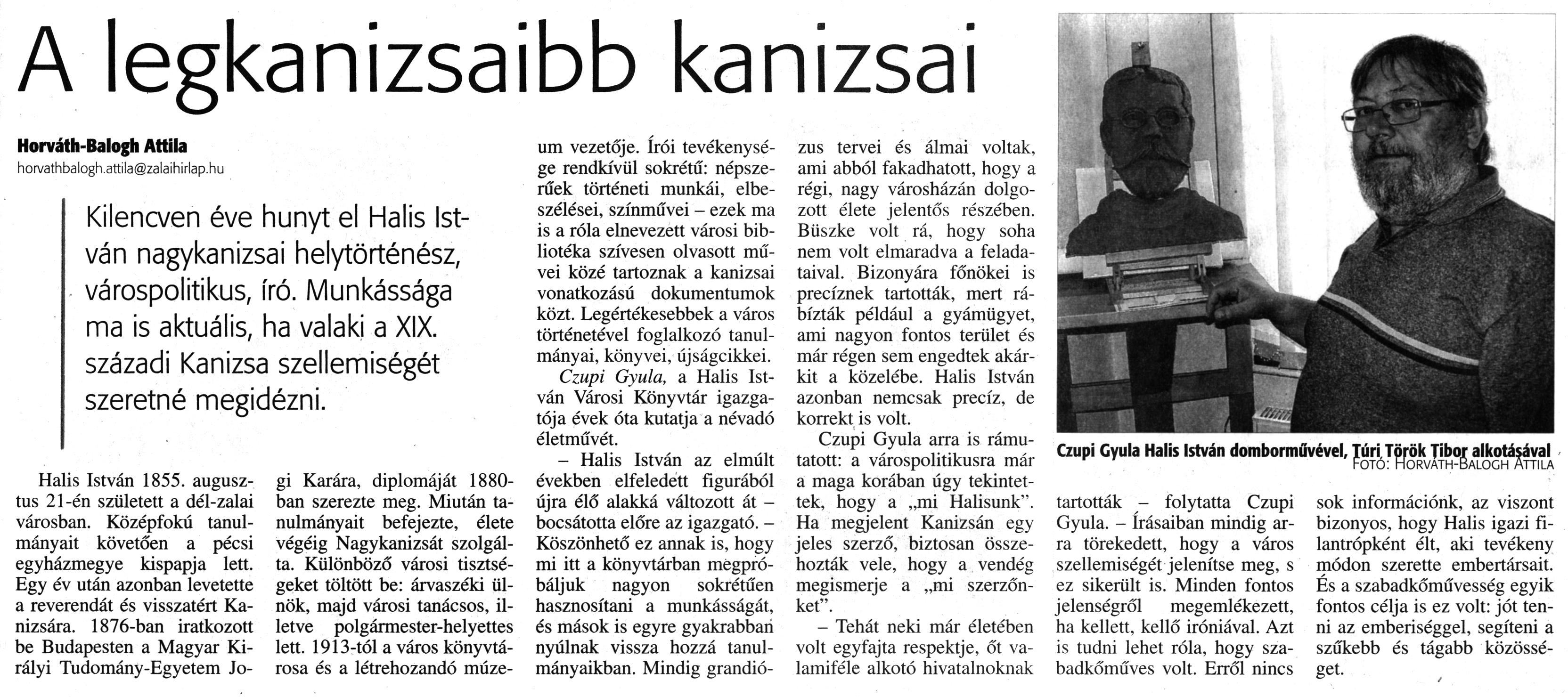 Nyilvános 1745 | 3364 | Zalai Hírlap 2017. április 8. 83. szám 11. oldal - A legkanizsaibb kanizsai | A legkanizsaibb kanizsai Horváth-Balogh Attila horvathbalogh.attila@zalaihirlap.hu Kilencven éve hunyt el Halis István nagykanizsai helytörténész, várospolitikus, író. Munkássága ma is aktuális, ha valaki a XIX. századi Kanizsa szellemiségét szeretné megidézni. Halis István 1855. augusztus 21-én született a dél-zalai városban. Középfokú tanulmányait követően a pécsi egyházmegye kispapja lett. Egy év után azonban levetette a reverendát és visszatért Kanizsára. 1876-ban iratkozott be Budapesten a Magyar Királyi Tudomány-Egyetem Jogi Karára, diplomáját 1880-ban szerezte meg. Miután tanulmányait befejezte, élete végéig Nagykanizsát szolgálta. Különböző városi tisztségeket töltött be: árvaszéki ülnök, majd városi tanácsos, illetve polgármester-helyettes lett. 1913-tól a város könyvtárosa és a létrehozandó múze- um vezetője. írói tevékenysége rendkívül sokrétű: népszerűek történeti munkái, elbeszélései, színművei - ezek ma is a róla elnevezett városi bibliotéka szívesen olvasott művei közé tartoznak a kanizsai vonatkozású dokumentumok közt. Legértékesebbek a város történetével foglalkozó tanulmányai, könyvei, újságcikkei. Czupi Gyula, a Halis István Városi Könyvtár igazgatója évek óta kutatja a névadó életművét. - Halis István az elmúlt években elfeledett figurából újra élő alakká változott át -bocsátotta előre az igazgató. -Köszönhető ez annak is, hogy mi itt a könyvtárban megpróbáljuk nagyon sokrétűen hasznosítani a munkásságát, és mások is egyre gyakrabban nyúlnak vissza hozzá tanulmányaikban. Mindig grandiózus tervei és álmai voltak, ami abból fakadhatott, hogy a régi. nagy városházán dolgozott élete jelentős részében. Büszke volt rá, hogy soha nem volt elmaradva a feladataival. Bizonyára főnökei is precíznek tartották, mert rábízták például a gyámügyet, ami nagyon fontos terület és már régen sem engedtek akárkit a közelébe. Halis István azonban nemcsak precíz, de korrekt is volt. Czupi Gyula arra is rámutatott: a várospolitikusra már a maga korában úgy tekintettek, hogy a „mi Halisunk". Ha megjelent Kanizsán egy jeles szerző, biztosan összehozták vele, hogy a vendég megismerje a „mi szerzőnket". - Tehát neki már életében volt egyfajta respektje, őt valamiféle alkotó hivatalnoknak tartották - folytatta Czupi Gyula. - írásaiban mindig arra törekedett, hogy a város szellemiségét jelenítse meg, s ez sikerült is. Minden fontos jelenségről megemlékezett, ha kellett, kellő iróniával. Azt is tudni lehet róla, hogy szabadkőműves volt. Erről nincs sok információnk, az viszont bizonyos, hogy Halis igazi filantrópként élt, aki tevékeny módon szerette embertársait. És a szabadkőművesség egyik fontos célja is ez volt: jót tenni az emberiséggel, segíteni a szűkebb és tágabb közösséget. Czupi Gyula Halis István domborművével. Túri Török Tibor alkotásával Fotó: Horvath-Balogh Attila |