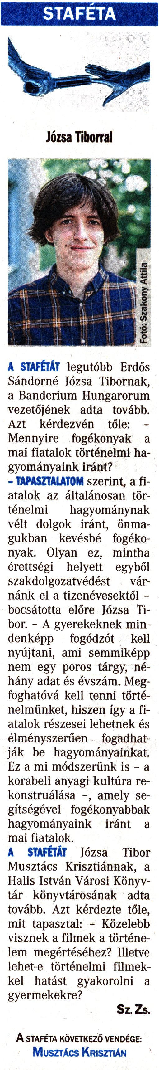 Nyilvános 1790 | 4638 | Vasárnapi Zalai Hírlap 2017. május 20. 20. szám 5. oldal | STAFÉTA A STAFÉTÁT legutóbb Erdős Sándorné Józsa Tibornak, a Banderium Hungarorum vezetőjének adta tovább. Azt kérdezvén tőle: - Mennyire fogékonyak a mai fiatalok történelmi hagyományaink iránt? - TAPASZTALATOM szerint, a fiatalok az általánosan történelmi hagyománynak vélt dolgok iránt, önmagukban kevésbé fogékonyak. Olyan ez, mintha érettségi helyett egyből szakdolgozatvédést várnánk el a tizenévesektől -bocsátotta előre Józsa Tibor. - A gyerekeknek mindenképp fogódzót kell nyújtani, ami semmiképp nem egy poros tárgy, néhány adat és évszám. Megfoghatóvá kell tenni történelmünket, hiszen így a fiatalok részesei lehetnek és élményszerűen fogadhatják be hagyományainkat. Ez a mi módszerünk is - a korabeli anyagi kultúra rekonstruálása -, amely segítségével fogékonyabbak hagyományaink iránt a mai fiatalok. A STAFÉTÁT Józsa Tibor Musztács Krisztiánnak, a Halis István Városi Könyvtár könyvtárosának adta tovább. Azt kérdezte tőle, mit tapasztal: - Közelebb visznek a filmek a történelem megértéséhez? Illetve lehet-e történelmi filmekkel hatást gyakorolni a gyermekekre? Sz. Zs. A STAFÉTA KÖVETKEZŐ VENDÉGE: Musztács Krisztián |