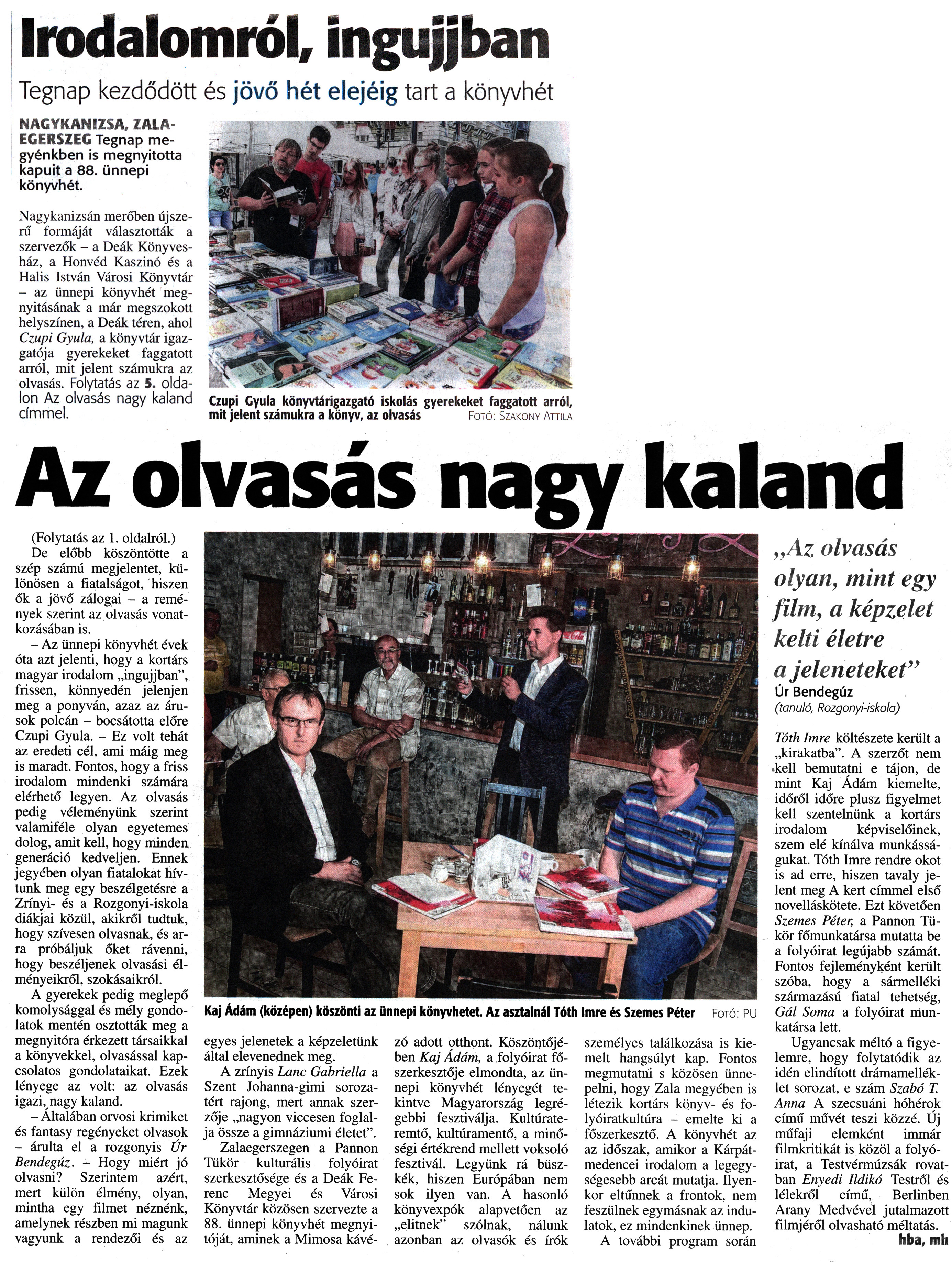 Nyilvános 1651 | 3964 | Zalai Hírlap 2017. június 9. 132. szám 1, 5. oldal - Ünnepi Könyvhét | Irodalomról, ingujjban Tegnap kezdődött és jövő hét elejéig tart a könyvhét NAGYKANIZSA, ZALAEGERSZEG Tegnap megyénkben is megnyitotta kapuit a 88. ünnepi könyvhét. Nagykanizsán merőben újszerű formáját választották a szervezők - a Deák Könyvesház, a Honvéd Kaszinó és a Halis István Városi Könyvtár - az ünnepi könyvhét megnyitásának a már megszokott helyszínen, a Deák téren, ahol Czupi Gyula, a könyvtár igazgatója gyerekeket faggatott arról, mit jelent számukra az olvasás. Folytatás az 5. oldalon Az olvasás nagy kaland Czupi Gyula könyvtárigazgató iskolás gyerekeket faggatott arról, címmel. mit jelent számukra a könyv, az olvasás Fotó: Szakony Attila Az olvasás nagy kaland (Folytatás az 1. oldalról.) De előbb köszöntötte a szép számú megjelentet, különösen a fiatalságot, hiszen ők a jövő zálogai - a remények szerint az olvasás vonatkozásában is. - Az ünnepi könyvhét évek óta azt jelenti, hogy a kortárs magyar irodalom „ingujjban", frissen, könnyedén jelenjen meg a ponyván, azaz az árusok polcán - bocsátotta előre Czupi Gyula. - Ez volt tehát az eredeti cél, ami máig meg is maradt. Fontos, hogy a friss irodalom mindenki számára elérhető legyen. Az olvasás pedig véleményünk szerint valamiféle olyan egyetemes dolog, amit kell, hogy minden generáció kedveljen. Ennek jegyében olyan fiatalokat hívtunk meg egy beszélgetésre a Zrínyi- és a Rozgonyi-iskola diákjai közül, akikről tudtuk, hogy szívesen olvasnak, és arra próbáljuk őket rávenni, hogy beszéljenek olvasási élményeikről, szokásaikról. A gyerekek pedig meglepő komolysággal és mély gondolatok mentén osztották meg a megnyitóra érkezett társaikkal a könyvekkel, olvasással kapcsolatos gondolataikat. Ezek lényege az volt: az olvasás igazi, nagy kaland. - Általában orvosi krimiket és fantasy regényeket olvasok - árulta el a rozgonyis Úr Bendegúz. - Hogy miért jó olvasni? Szerintem azért, mert külön élmény, olyan, mintha egy filmet néznénk, amelynek részben mi magunk vagyunk a rendezői és az egyes jelenetek a képzeletünk által elevenednek meg. A zrínyis Lanc Gabriella a Szent Johanna-gimi sorozatért rajong, mert annak szerzője „nagyon viccesen foglalja össze a gimnáziumi életet". Zalaegerszegen a Pannon Tükör kulturális folyóirat szerkesztősége és a Deák Ferenc Megyei és Városi Könyvtár közösen szervezte a 88. ünnepi könyvhét megnyitóját, aminek a Mimosa kávézó adott otthont. Köszöntőjében Kaj Ádám, a folyóirat főszerkesztője elmondta, az ünnepi könyvhét lényegét tekintve Magyarország legrégebbi fesztiválja. Kultúrateremtő, kultúramentő, a minőségi értékrend mellett voksoló fesztivál. Legyünk rá büszkék, hiszen Európában nem sok ilyen van. A hasonló könyvexpók alapvetően az „elitnek" szólnak, nálunk azonban az olvasók és írók személyes találkozása is kiemelt hangsúlyt kap. Fontos megmutatni s közösen ünnepelni, hogy Zala megyében is létezik kortárs könyv- és folyóiratkultúra - emelte ki a főszerkesztő. A könyvhét az az időszak, amikor a Kárpátmedencei irodalom a legegységesebb arcát mutatja. Ilyenkor eltűnnek a frontok, nem feszülnek egymásnak az indulatok, ez mindenkinek ünnep. A további program során Tóth Imre költészete került a „kirakatba". A szerzőt nem kell bemutatni e tájon, de mint Kaj Ádám kiemelte, időről időre plusz figyelmet kell szentelnünk a kortárs irodalom képviselőinek, szem elé kínálva munkásságukat. Tóth Imre rendre okot is ad erre, hiszen tavaly jelent meg A kert címmel első novelláskötete. Ezt követően Szemes Péter, a Pannon Tükör főmunkatársa mutatta be a folyóirat legújabb számát. Fontos fejleményként került szóba, hogy a sármelléki származású fiatal tehetség, Gál Soma a folyóirat munkatársa lett. Ugyancsak méltó a figyelemre, hogy folytatódik az idén elindított drámamelléklet sorozat, e szám Szabó T. Anna A szecsuáni hóhérok című művét teszi közzé. Új műfaji elemként immár filmkritikát is közöl a folyóirat, a Testvérmúzsák rovatban Enyedi Ildikó Testről és lélekről című, Berlinben Arany Medvével jutalmazott filmjéről olvasható méltatás. hba, mh |