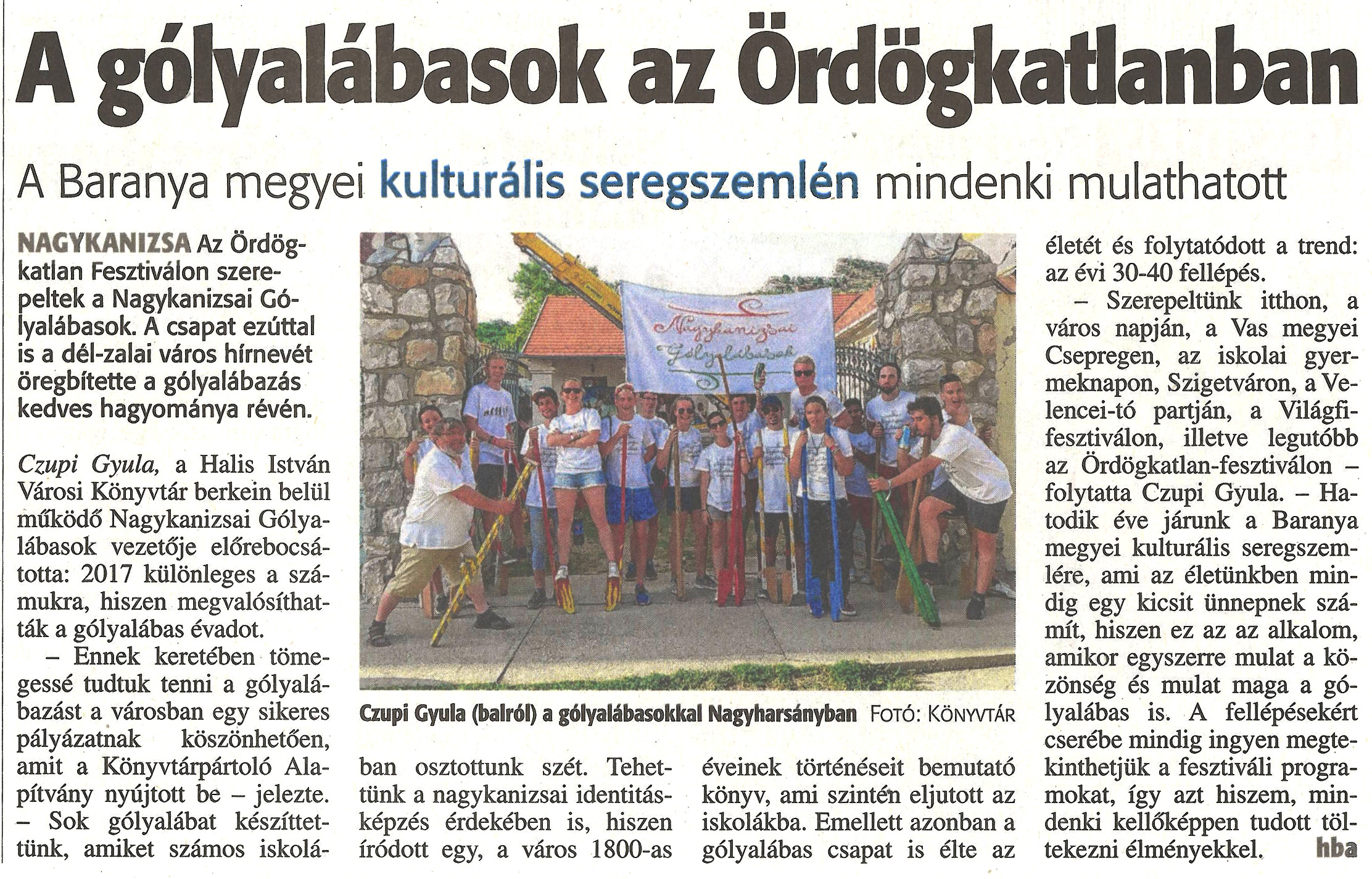 Nyilvános 1279 | 1996 | A gólyalábasok az Ördögkatlanban | A Baranya megyei kulturális seregszemlén mindenki mulathatott NAGYKANIZSA Az Ördög- katlan Fesztiválon szere-peltek a Nagykanizsai Gó-lyalábasok. A csapat ezúttal is a dél-zalai város hírnevét öregbítette a gólyalábazás kedves hagyománya révén. Czupi Gyula, a Halis István Városi Könyvtár berkein belül működő Nagykanizsai Gólya¬lábasok vezetője előrebocsá¬totta: 2017 különleges a szá¬mukra, hiszen megvalósíthat¬ták a gólyalábas évadot. - Ennek keretében töme-gessé tudtuk tenni a gólyalá- bazást a városban egy sikeres pályázatnak köszönhetően, amit a Könyvtárpártoló Ala-pítvány nyújtott be - jelezte. - Sok gólyalábat készíttet-tünk, amiket számos iskolá- Czupi Gyula (balról) a gólyalábasokkal Nagyharsányban FOTÓ: KÖNYVTÁR ban osztottunk szét. Tehet- éveinek történéseit bemutató tünk a nagykanizsai identitás- könyv, ami szintén eljutott az képzés érdekében is, hiszen iskolákba. Emellett azonban a íródott egy, a város 1800-as gólyalábas csapat is élte az életét és folytatódott a trend: az évi 30-40 fellépés. - Szerepeltünk itthon, a város napján, a Vas megyei Csepregen, az iskolai gyer-meknapon, Szigetváron, a Ve¬lencei-tó partján, a Világfi- fesztiválon, illetve legutóbb az Ördögkatlan-fesztiválon - folytatta Czupi Gyula. - Ha-todik éve járunk a Baranya megyei kulturális seregszem¬lére, ami az életünkben min¬dig egy kicsit ünnepnek szá¬mít, hiszen ez az az alkalom, amikor egyszerre mulat a kö¬zönség és mulat maga a gó¬lyalábas is. A fellépésekért cserébe mindig ingyen megte-kinthetjük a fesztiváli progra¬mokat, így azt hiszem, min¬denki kellőképpen tudott töl¬tekezni élményekkel, hba |