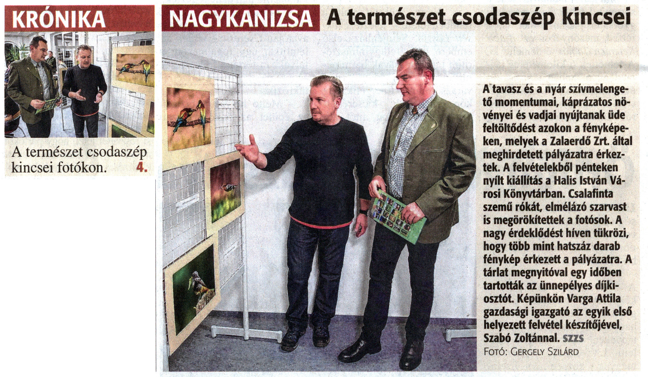 Nyilvános 1578 | 2956 | Zalai Hírlap 2017. december 4. 282. szám 1, 4. oldal | NAGYKANIZSA A természet csodaszép kincsei A természet csodaszép kincsei fotókon. 4. A tavasz és a nyár szívmelengető momentumai, káprázatos növényei és vadjai nyújtanak üde feltöltődést azokon a fényképeken, melyek a Zalaerdő Zrt. által meghirdetett pályázatra érkeztek. A felvételekből pénteken nyílt kiállítás a Halis István Városi Könyvtárban. Csalafinta szemű rókát, elmélázó szarvast is megörökítettek a fotósok. A nagy érdeklődést híven tükrözi, hogy több mint hatszáz darab fénykép érkezett a pályázatra. A tárlat megnyitóval egy időben tartották az ünnepélyes díjkiosztót. Képünkön Varga Attila gazdasági igazgató az egyik első helyezett felvétel készítőjével. Szabó Zoltánnal, szzs Fotó: Gergely Szilárd |