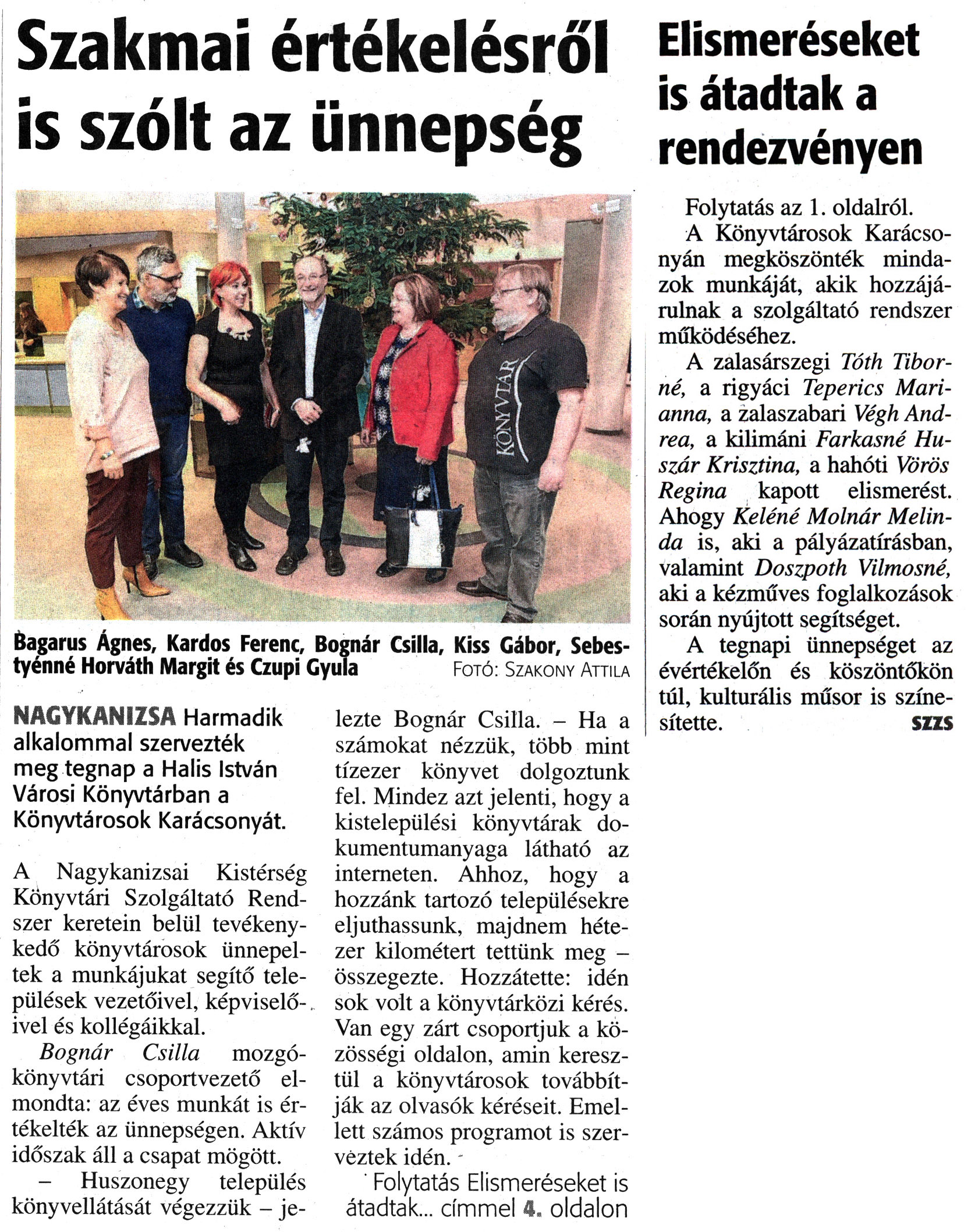 Nyilvános 1607 | 3128 | Zalai Hírlap 2017. december 13. 290. szám 1, 4. oldal | Szakmai értékelésről is szólt az ünnepség NAGYKANIZSA Harmadik alkalommal szervezték meg tegnap a Halis István Városi Könyvtárban a Könyvtárosok Karácsonyát. A Nagykanizsai Kistérség Könyvtári Szolgáltató Rendszer keretein belül tevékenykedő könyvtárosok ünnepeltek a munkájukat segítő települések vezetőivel, képviselőivel és kollégáikkal. Bognár Csilla mozgókönyvtári csoportvezető elmondta: az éves munkát is értékelték az ünnepségen. Aktív időszak áll a csapat mögött. - Huszonegy település könyvellátását végezzük - jelezte Bognár Csilla. - Ha a számokat nézzük, több mint tízezer könyvet dolgoztunk fel. Mindez azt jelenti, hogy a kistelepülési könyvtárak dokumentumanyaga látható az interneten. Ahhoz, hogy a hozzánk tartozó településekre eljuthassunk, majdnem hétezer kilométert tettünk meg - összegezte. Hozzátette: idén sok volt a könyvtárközi kérés. Van egy zárt csoportjuk a közösségi oldalon, amin keresztül a könyvtárosok továbbítják az olvasók kéréseit. Emellett számos programot is szerveztek idén. - Folytatás Elismeréseket is átadtak... címmel 4. oldalon Elismeréseket is átadtak a rendezvényen Folytatás az 1. oldalról. A Könyvtárosok Karácsonyán megköszönték mindazok munkáját, akik hozzájárulnak a szolgáltató rendszer működéséhez. A zalasárszegi Tóth Tibor-né, a rigyáci Teperics Marianna, a zalaszabari Végh Andrea, a kilimáni Farkasné Huszár Krisztina, a hahóti Vörös Regina kapott elismerést. Ahogy Keléné Molnár Melinda is, aki a pályázatírásban, valamint Doszpoth Vilmosné, aki a kézműves foglalkozások során nyújtott segítséget. A tegnapi ünnepséget az évértékelőn és köszöntőkön túl, kulturális műsor is színesítette. SZZS Bagarus Ágnes, Kardos Ferenc, Bognár Csilla, Kiss Gábor, Sebestyénné Horváth Margit és Czupi Gyula Fotó: Szakony Attila |