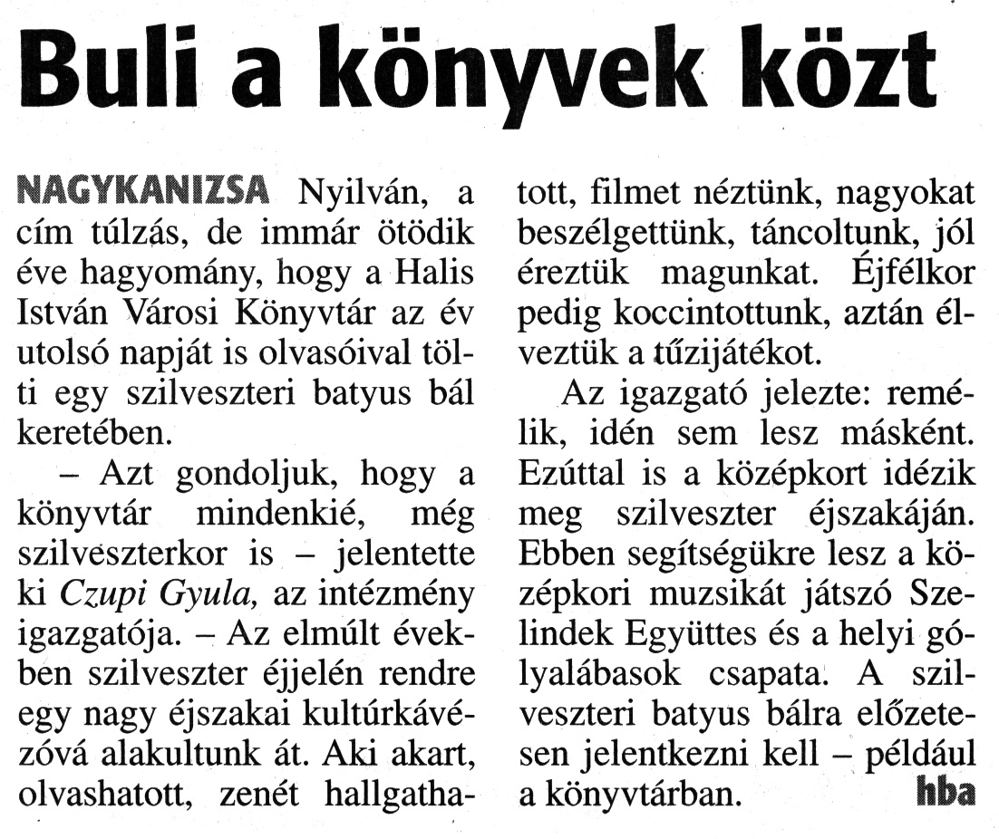 Nyilvános 1522 | 2866 | Zalai Hírlap 2017. december 27. 300. szám 3. oldal | Buli a könyvek közt NAGYKANIZSA Nyilván, a cím túlzás, de immár ötödik éve hagyomány, hogy a Halis István Városi Könyvtár az év utolsó napját is olvasóival tölti egy szilveszteri batyus bál keretében. - Azt gondoljuk, hogy a könyvtár mindenkié, még szilveszterkor is - jelentette ki Czupi Gyula, az intézmény igazgatója. - Az elmúlt években szilveszter éjjelén rendre egy nagy éjszakai kultúrkávézóvá alakultunk át. Aki akart, olvashatott, zenét hallgathatott, filmet néztünk, nagyokat beszélgettünk, táncoltunk, jól éreztük magunkat. Éjfélkor pedig koccintottunk, aztán élveztük a tűzijátékot. Az igazgató jelezte: remélik, idén sem lesz másként. Ezúttal is a középkort idézik meg szilveszter éjszakáján. Ebben segítségükre lesz a középkori muzsikát játszó Szelindek Együttes és a helyi gólyalábasok csapata. A szilveszteri batyus bálra előzetesen jelentkezni kell - például a könyvtárban. hba |