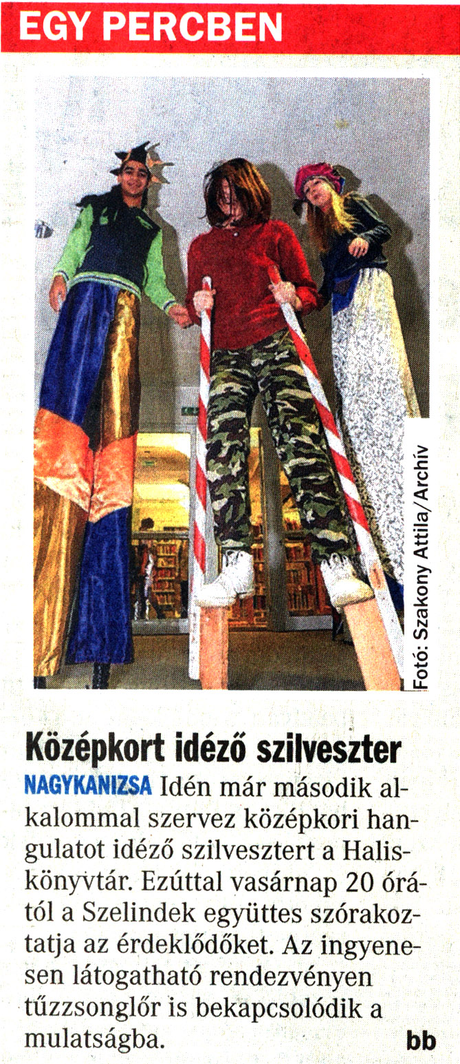 Nyilvános 1625 | 2953 | Vasárnapi Zalai Hírlap 2017. december 30. 52. szám 1. oldal | EGY PERCBEN Középkort idéző szilveszter NAGYKANIZSA Idén már második alkalommal szervez középkori hangulatot idéző szilvesztert a Halis-könyvtár. Ezúttal vasárnap 20 órától a Szelindek együttes szórakoztatja az érdeklődőket. Az ingyenesen látogatható rendezvényen tűzzsonglőr is bekapcsolódik a mulatságba. bb |