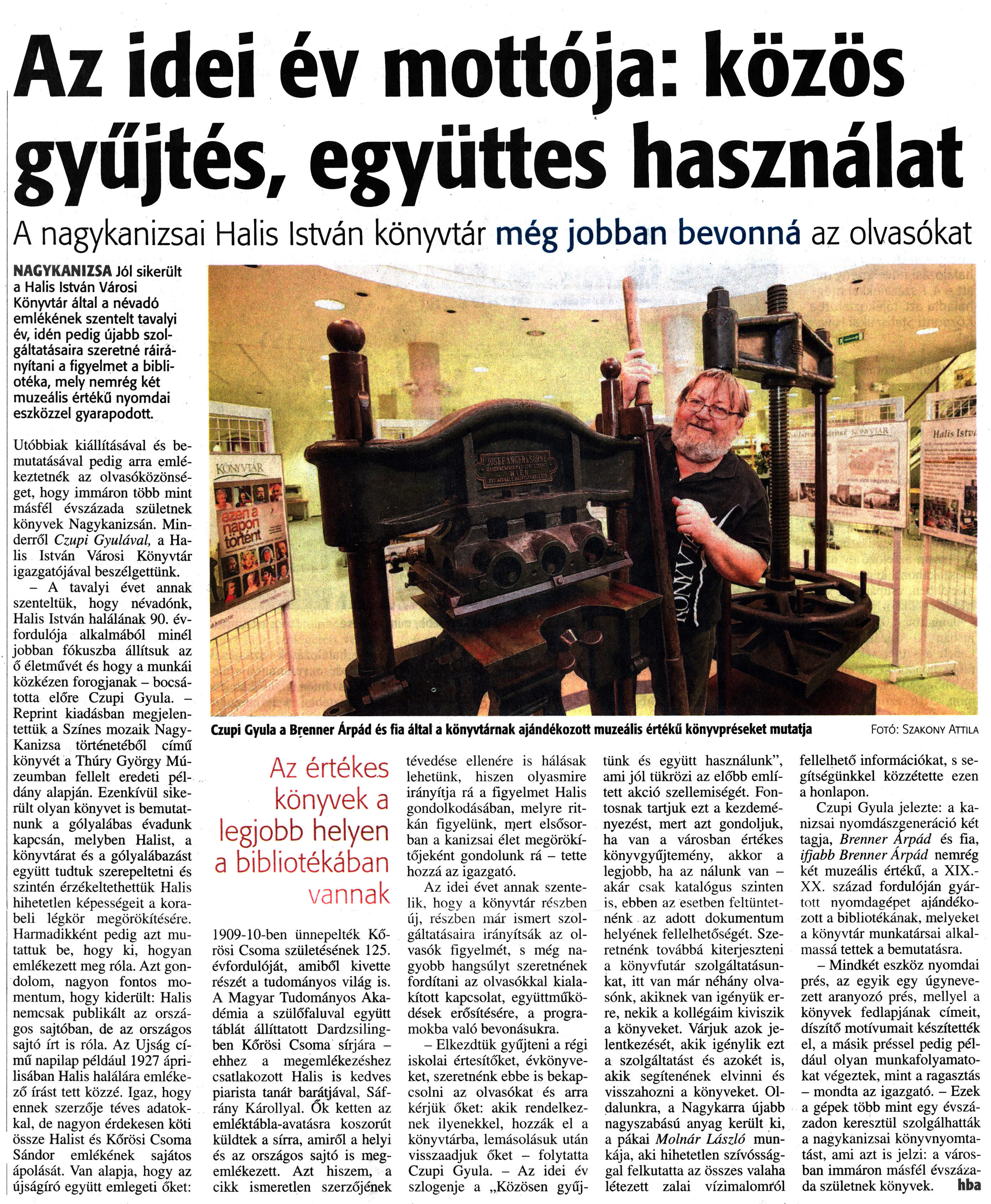 Nyilvános 1641 | 3367 | Zalai Hírlap 2018. január 29. 24. szám 6. oldal - Az idei év mottója | Az idei év mottója: közös gyűjtés, együttes használat A nagykanizsai Halis István könyvtár még jobban bevonná az olvasókat Czupi Gyula a Brenner Árpád és fia által a könyvtárnak ajándékozott muzeális értékű könyvpréseket mutatja Fotó: Szakony Attila NAGYKANIZSA Jól sikerült a Halis István Városi Könyvtár által a névadó emlékének szentelt tavalyi év, idén pedig újabb szolgáltatásaira szeretné ráirányítani a figyelmet a bibliotéka, mely nemrég két muzeális értékű nyomdai eszközzel gyarapodott. Utóbbiak kiállításával és bemutatásával pedig arra emlékeztetnék az olvasóközönséget, hogy immáron több mint másfél évszázada születnek könyvek Nagykanizsán. Minderről Czupi Gyulával, a Halis István Városi Könyvtár igazgatójával beszélgettünk. - A tavalyi évet annak szenteltük, hogy névadónk, Halis István halálának 90. évfordulója alkalmából minél jobban fókuszba állítsuk az ő életművét és hogy a munkái közkézen forogjanak - bocsátotta előre Czupi Gyula. -Reprint kiadásban megjelentettük a Színes mozaik Nagy-Kanizsa történetéből című könyvét a Thúry György Múzeumban fellelt eredeti példány alapján. Ezenkívül sikerült olyan könyvet is bemutatnunk a gólyalábas évadunk kapcsán, melyben Halist, a könyvtárat és a gólyalábazást együtt tudtuk szerepeltetni és szintén érzékeltethettük Halis hihetetlen képességeit a korabeli légkör megörökítésére. Harmadikként pedig azt mutattuk be, hogy ki, hogyan emlékezett meg róla. Azt gondolom, nagyon fontos momentum, hogy kiderült: Halis nemcsak publikált az országos sajtóban, de az országos sajtó írt is róla. Az Újság című napilap például 1927 áprilisában Halis halálára emlékező írást tett közzé. Igaz, hogy ennek szerzője téves adatokkal, de nagyon érdekesen köti össze Halist és Kőrösi Csoma Sándor emlékének sajátos ápolását. Van alapja, hogy az újságíró együtt emlegeti őket: Az értékes könyvek a legjobb helyen a bibliotékában vannak 1909-10-ben ünnepelték Kőrösi Csoma születésének 125. évfordulóját, amiből kivette részét a tudományos világ is. A Magyar Tudományos Akadémia a szülőfaluval együtt táblát állíttatott Dardzsiling-ben Kőrösi Csoma sírjára -ehhez a megemlékezéshez csatlakozott Halis is kedves piarista tanát barátjával, Sáfrány Károllyal. Ők ketten az emléktábla-avatásra koszorút küldtek a sírra, amiről a helyi és az országos sajtó is megemlékezett. Azt hiszem, a cikk ismeretlen szerzőjének tévedése ellenére is hálásak lehetünk, hiszen olyasmire irányítja rá a figyelmet Halis gondolkodásában, melyre ritkán figyelünk, mert elsősorban a kanizsai élet megörökítőjeként gondolunk rá - tette hozzá az igazgató. Az idei évet annak szentelik, hogy a könyvtár részben új, részben már ismert szolgáltatásaira irányítsák az olvasók figyelmét, s még nagyobb hangsúlyt szeretnének fordítani az olvasókkal kialakított kapcsolat, együttműködések erősítésére, a programokba való bevonásukra. - Elkezdtük gyűjteni a régi iskolai értesítőket, évkönyveket, szeretnénk ebbe is bekapcsolni az olvasókat és arra kérjük őket: akik rendelkeznek ilyenekkel, hozzák el a könyvtárba, lemásolásuk után visszaadjuk őket - folytatta Czupi Gyula. - Az idei év szlogenje a „Közösen gyűjtünk és együtt használunk", ami jól tükrözi az előbb említett akció szellemiségét. Fontosnak tartjuk ezt a kezdeményezést, mert azt gondoljuk, ha van a városban értékes könyvgyűjtemény, akkor a legjobb, ha az nálunk van -akár csak katalógus szinten is, ebben az esetben feltüntetnénk az adott dokumentum helyének fellelhetőségét. Szeretnénk továbbá kiterjeszteni a könyvfutár szolgáltatásunkat, itt van már néhány olvasónk, akiknek van igényük erre, nekik a kollégáim kiviszik a könyveket. Várjuk azok jelentkezését, akik igénylik ezt a szolgáltatást és azokét is, akik segítenének elvinni és visszahozni a könyveket. Oldalunkra, a Nagykarra újabb nagyszabású anyag került ki, a pákai Molnár László munkája, aki hihetetlen szívóssággal felkutatta az összes valaha létezett zalai vízimalomról fellelhető információkat, s segítségünkkel közzétette ezen a honlapon. Czupi Gyula jelezte: a kanizsai nyomdászgeneráció két tagja, Brenner Árpád és fia, ifjabb Brenner Árpád nemrég két muzeális értékű, a XIX.-XX. század fordulóján gyártott nyomdagépet ajándékozott a bibliotékának, melyeket a könyvtár munkatársai alkalmassá tettek a bemutatásra. - Mindkét eszköz nyomdai prés, az egyik egy úgynevezett aranyozó prés, mellyel a könyvek fedlapjának címeit, díszítő motívumait készítették el, a másik préssel pedig például olyan munkafolyamatokat végeztek, mint a ragasztás - mondta az igazgató. - Ezek a gépek több mint egy évszázadon keresztül szolgálhatták a nagykanizsai könyvnyomtatást, ami azt is jelzi: a városban immáron másfél évszázada születnek könyvek. hba |