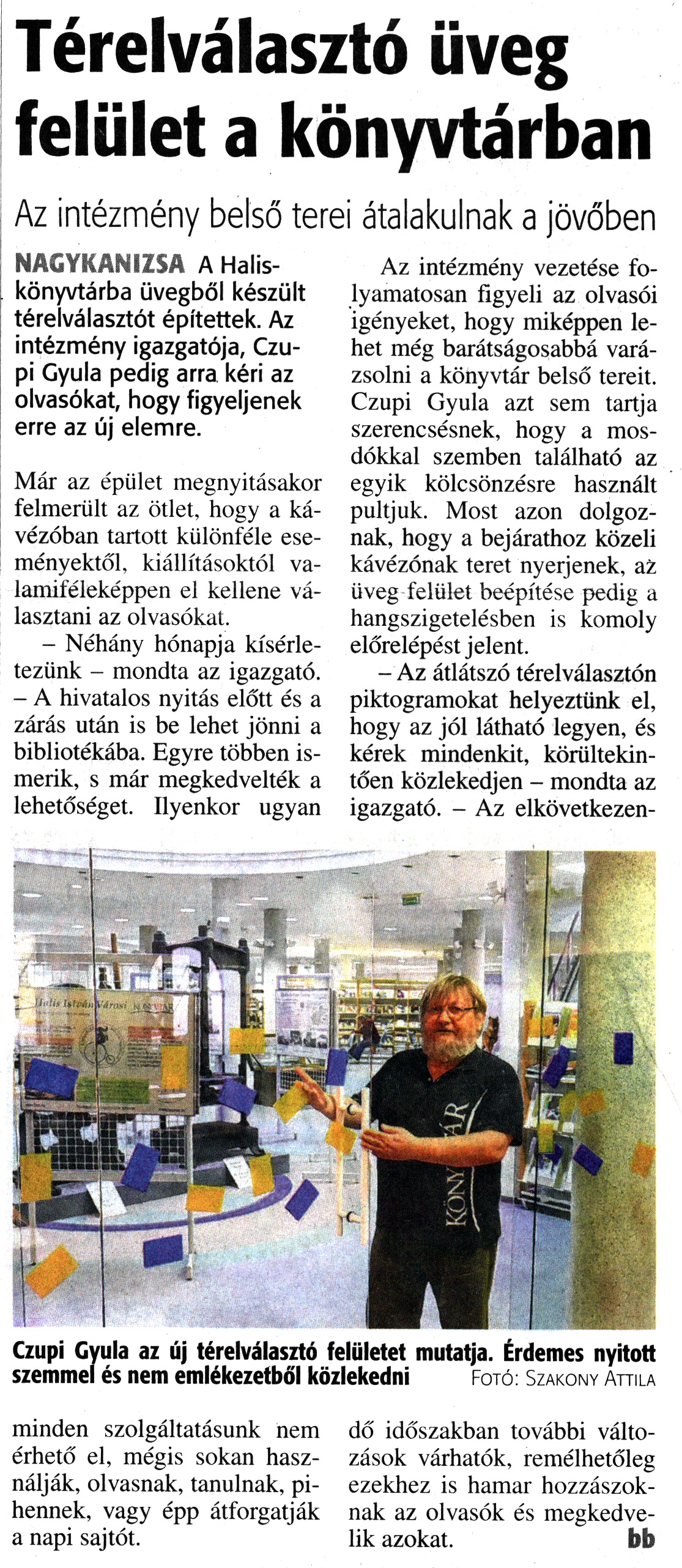Nyilvános 4212 | 2886 | Zalai Hírlap 2018. február 13. 37. szám 3. oldal | Térelválasztó üveg felület a könyvtárban Az intézmény belső terei átalakulnak a jövőben Czupi Gyula az új térelválasztó felületet mutatja. Érdemes nyitott szemmel és nem emlékezetből közlekedni Fotó: Szakony Attila NAGYKANIZSA A Halis-könyvtárba üvegből készült térelválasztót építettek. Az intézmény igazgatója, Czupi Gyula pedig arra kéri az olvasókat, hogy figyeljenek erre az új elemre. Már az épület megnyitásakor felmerült az ötlet, hogy a kávézóban tartott különféle eseményektől, kiállításoktól valamiféleképpen el kellene választani az olvasókat. - Néhány hónapja kísérletezünk - mondta az igazgató. - A hivatalos nyitás előtt és a zárás után is be lehet jönni a bibliotékába. Egyre többen ismerik, s már megkedvelték a lehetőséget. Ilyenkor ugyan minden szolgáltatásunk nem érhető el, mégis sokan használják, olvasnak, tanulnak, pihennek, vagy épp átforgatják a napi sajtót. Az intézmény vezetése folyamatosan figyeli az olvasói igényeket, hogy miképpen lehet még barátságosabbá varázsolni a könyvtár belső tereit. Czupi Gyula azt sem tartja szerencsésnek, hogy a mosdókkal szemben található az egyik kölcsönzésre használt pultjuk. Most azon dolgoznak, hogy a bejárathoz közeli kávézónak teret nyerjenek, az üveg felület beépítése pedig a hangszigetelésben is komoly előrelépést jelent. - Az átlátszó térelválasztón piktogramokat helyeztünk el, hogy az jól látható legyen, és kérek mindenkit, körültekintően közlekedjen - mondta az igazgató. - Az elkövetkezendő időszakban további változások várhatók, remélhetőleg ezekhez is hamar hozzászoknak az olvasók és megkedvelik azokat. bb |