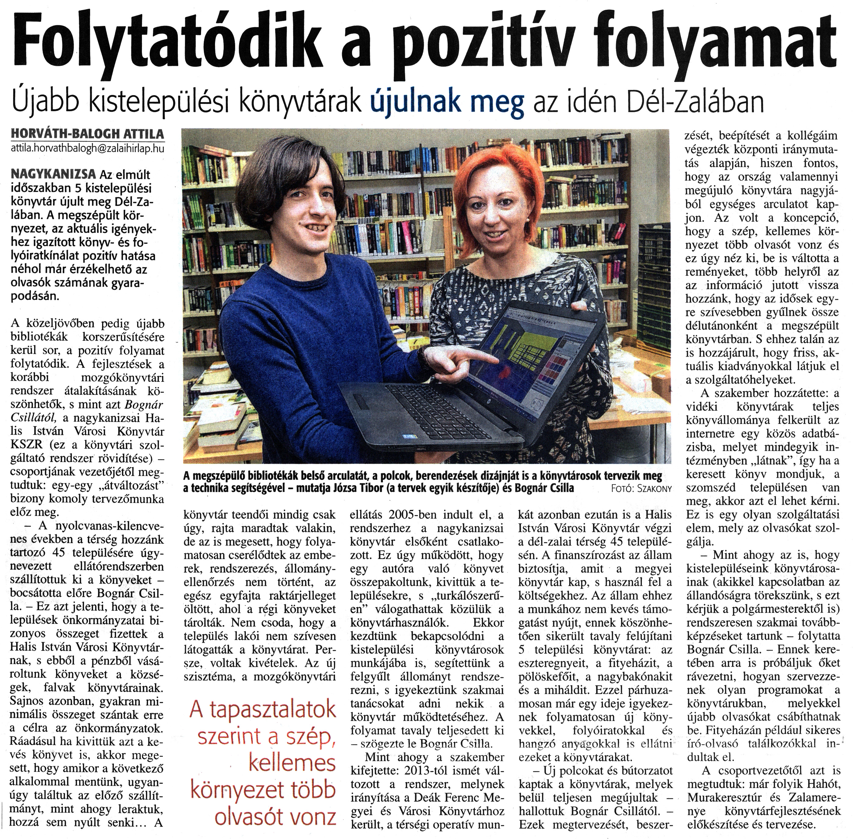 Nyilvános 1438 | 2828 | Zalai Hírlap 2018. február 15. 39. szám 6. oldal | Folytatódik a pozitív folyamat Újabb kistelepülési könyvtárak újulnak meg az idén Dél-Zalában A megszépülő bibliotékák belső arculatát, a polcok, berendezések dizájnját is a könyvtárosok tervezik meg a technika segítségével - mutatja Józsa Tibor (a tervek egyik készítője) és Bognár Csilla Fotó: Szakony HORVÁTH-BALOGH ATTILA attila.horvathbalogh@zalaihirlap.hu NAGYKANIZSA Az elmúlt időszakban 5 kistelepülési könyvtár újult meg Dél-Zalában. A megszépült környezet, az aktuális igényekhez igazított könyv- és folyóiratkínálat pozitív hatása néhol már érzékelhető az olvasók számának gyarapodásán. A közeljövőben pedig újabb bibliotékák korszerűsítésére kerül sor, a pozitív folyamat folytatódik. A fejlesztések a korábbi mozgókönyvtári rendszer átalakításának köszönhetők, s mint azt Bognár Csillától, a nagykanizsai Ha-lis István Városi Könyvtár KSZR (ez a könyvtári szolgáltató rendszer rövidítése) -csoportjának vezetőjétől megtudtuk: egy-egy „átváltozást" bizony komoly tervezőmunka előz meg. - A nyolcvanas-kilencvenes években a térség hozzánk tartozó 45 településére úgynevezett ellátórendszerben szállítottuk ki a könyveket -bocsátotta előre Bognár Csilla. - Ez azt jelenti, hogy a települések önkormányzatai bizonyos összeget fizettek a Halis István Városi Könyvtárnak, s ebből a pénzből vásároltunk könyveket a községek, falvak könyvtárainak. Sajnos azonban, gyakran minimális összeget szántak erre a célra az önkormányzatok. Ráadásul ha kivittük azt a kevés könyvet is, akkor megesett, hogy amikor a következő alkalommal mentünk, ugyanúgy találtuk az előző szállítmányt, mint ahogy leraktuk, hozzá sem nyúlt senki... A könyvtár teendői mindig csak úgy, rajta maradtak valakin, de az is megesett, hogy folyamatosan cserélődtek az emberek, rendszerezés, állományellenőrzés nem történt, az egész egyfajta raktárjelleget öltött, ahol a régi könyveket tárolták. Nem csoda, hogy a település lakói nem szívesen látogatták a könyvtárat. Persze, voltak kivételek. Az új szisztéma, a mozgókönyvtári A tapasztalatok szerint a szép, kellemes környezet több olvasót vonz ellátás 2005-ben indult el, a rendszerhez a nagykanizsai könyvtár elsőként csatlakozott. Ez úgy működött, hogy egy autóra való könyvet összepakoltunk, kivittük a településekre, s „turkálószerűen" válogathattak közülük a könyvtárhasználók. Ekkor kezdtünk bekapcsolódni a kistelepülési könyvtárosok munkájába is, segítettünk a felgyűlt állományt rendszerezni, s igyekeztünk szakmai tanácsokat adni nekik a könyvtár működtetéséhez. A folyamat tavaly teljesedett ki - szögezte le Bognár Csilla. Mint ahogy a szakember kifejtette: 2013-tól ismét változott a rendszer, melynek irányítása a Deák Ferenc Megyei és Városi Könyvtárhoz került, a térségi operatív mun- kát azonban ezután is a Halis István Városi Könyvtár végzi a dél-zalai térség 45 településén. A finanszírozást az állam biztosítja, amit a megyei könyvtár kap, s használ fel a költségekhez. Az állam ehhez a munkához nem kevés támogatást nyújt, ennek köszönhetően sikerült tavaly felújítani 5 települési könyvtárat: az eszteregnyeit, a fityeházit, a pölöskefőit, a nagybakónakit és a miháldit. Ezzel párhuzamosan már egy ideje igyekeznek folyamatosan új könyvekkel, folyóiratokkal és hangzó anyagokkal is ellátni ezeket a könyvtárakat. - Új polcokat és bútorzatot kaptak a könyvtárak, melyek belül teljesen megújultak -hallottuk Bognár Csillától. - Ezek megtervezését, beszerzését, beépítését a kollégáim végezték központi iránymutatás alapján, hiszen fontos, hogy az ország valamennyi megújuló könyvtára nagyjából egységes arculatot kapjon. Az volt a koncepció, hogy a szép, kellemes környezet több olvasót vonz és ez úgy néz ki, be is váltotta a reményeket, több helyről az az információ jutott vissza hozzánk, hogy az idősek egyre szívesebben gyűlnek össze délutánonként a megszépült könyvtárban. S ehhez talán az is hozzájárult, hogy friss, aktuális kiadványokkal látjuk el a szolgáltatóhelyeket. A szakember hozzátette: a vidéki könyvtárak teljes könyvállománya felkerült az internetre egy közös adatbázisba, melyet mindegyik intézményben „látnak", így ha a keresett könyv mondjuk, a szomszéd településen van meg, akkor azt el lehet kérni. Ez is egy olyan szolgáltatási elem, mely az olvasókat szolgálja. - Mint ahogy az is, hogy kistelepüléseink könyvtárosainak (akikkel kapcsolatban az állandóságra törekszünk, s ezt kérjük a polgármesterektől is) rendszeresen szakmai továbbképzéseket tartunk - folytatta Bognár Csilla. - Ennek keretében arra is próbáljuk őket rávezetni, hogyan szervezzenek olyan programokat a könyvtárukban, melyekkel újabb olvasókat csábíthatnak be. Fityeházán például sikeres író-olvasó találkozókkal indultak el. A csoportvezetőtől azt is megtudtuk: már folyik Hahót, Murakeresztúr és Zalamerenye könyvtárfejlesztésének előkészítése és tervezése. |