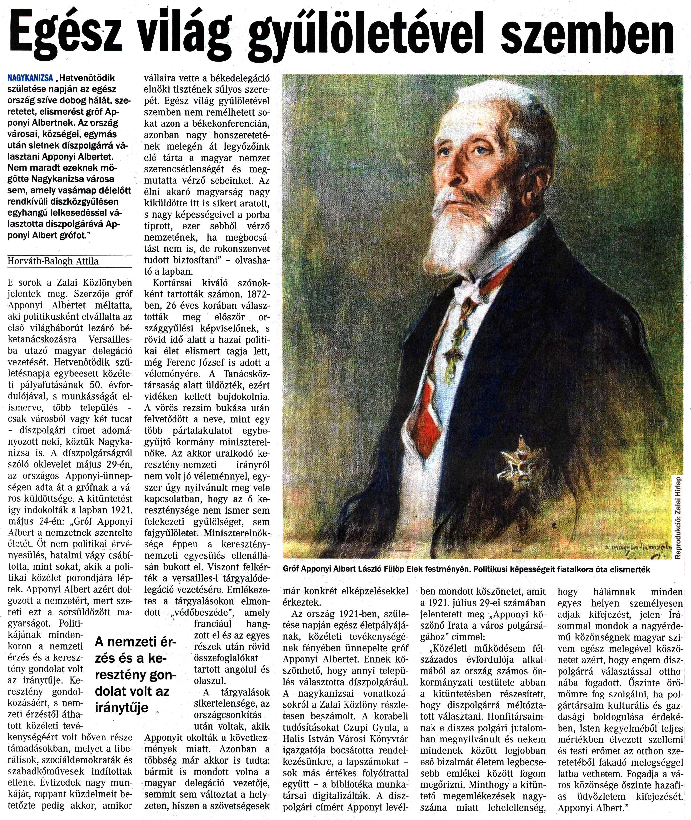 Nyilvános 1600 | 3046 | Vasárnapi Zalai Hírlap 2018. június 23. 25. szám 5. oldal | Egész világ gyűlöletével szemben Gróf Apponyi Albert László Fülöp Elek festményén. Politikusi képességeit fiatalkora óta elismerték NAGYKANIZSA „Hetvenötödik születése napján az egész ország szíve dobog hálát, szeretetet, elismerést gróf Apponyi Albertnek. Az ország városai, községei, egymás után sietnek díszpolgárrá választani Apponyi Albertet. Nem maradt ezeknek mögötte Nagykanizsa városa sem, amely vasárnap délelőtt rendkívüli díszközgyűlésen egyhangú lelkesedéssel választotta díszpolgárává Apponyi Albert grófot." Horváth-Balogh Attila_ E sorok a Zalai Közlönyben jelentek meg. Szerzője gróf Apponyi Albertet méltatta, aki politikusként elvállalta az első világháborút lezáró béketanácskozásra Versailles-ba utazó magyar delegáció vezetését. Hetvenötödik születésnapja egybeesett közéleti pályafutásának 50. évfordulójával, s munkásságát elismerve, több település -csak városból vagy két tucat - díszpolgári címet adományozott neki, köztük Nagykanizsa is. A díszpolgárságról szóló oklevelet május 29-én, az országos Apponyi-ünnep-ségen adta át a grófnak a város küldöttsége. A kitüntetést így indokolták a lapban 1921. május 24-én: „Gróf Apponyi Albert a nemzetnek szentelte életét. Őt nem politikai érvényesülés, hatalmi vágy csábította, mint sokat, akik a politikai közélet porondjára léptek. Apponyi Albert azért dolgozott a nemzetért, mert szereti ezt a sorsüldözött magyarságot. Politikájának mindenkoron a nemzeti érzés és a keresztény gondolat volt az iránytűje. Keresztény gondolkozásáért, s nemzeti érzéstől áthatott közéleti tevékenységéért volt bőven része támadásokban, melyet a liberálisok, szociáldemokraták és szabadkőművesek indítottak ellene. Évtizedek nagy munkáját, roppant küzdelmeit betetőzte pedig akkor, amikor vállaira vette a békedelegáció elnöki tisztének súlyos szerepét. Egész világ gyűlöletével szemben nem remélhetett sokat azon a békekonferencián, azonban nagy honszeretetének melegén át legyőzőink elé tárta a magyar nemzet szerencsétlenségét és megmutatta vérző sebeinket. Az élni akaró magyarság nagy kiküldötte itt is sikert aratott, s nagy képességeivel a porba tiprott, ezer sebből vérző nemzetének, ha megbocsátást nem is, de rokonszenvet tudott biztosítani" - olvasható a lapban. Kortársai kiváló szónokként tartották számon. 1872-ben, 26 éves korában választották meg először országgyűlési képviselőnek, s rövid idő alatt a hazai politikai élet elismert tagja lett, még Ferenc József is adott a véleményére. A Tanácsköztársaság alatt üldözték, ezért vidéken kellett bujdokolnia. A vörös rezsim bukása után felvetődött a neve, mint egy több pártalakulatot egybe-gyűjtő kormány miniszterelnöke. Az akkor uralkodó keresztény-nemzeti irányról nem volt jó véleménnyel, egyszer úgy nyilvánult meg vele kapcsolatban, hogy az ő kereszténysége nem ismer sem felekezeti gyűlölséget, sem fajgyűlöletet. Miniszterelnöksége éppen a kereszténynemzeti egyesülés ellenállásán bukott el. Viszont felkérték a versailles-i tárgyalódelegáció vezetésére. Emlékezetes a tárgyalásokon elmondott „védőbeszéde", amely franciául hangzott el és az egyes részek után rövid összefoglalókat tartott angolul és olaszul. A tárgyalások sikertelensége, az országcsonkítás után voltak, akik Apponyit okolták a következmények miatt. Azonban a többség már akkor is tudta: bármit is mondott volna a magyar delegáció vezetője, semmit sem változtat a helyzeten, hiszen a szövetségesek már konkrét elképzelésekkel érkeztek. Az ország 1921-ben, születése napján egész életpályájának, közéleti tevékenységének fényében ünnepelte gróf Apponyi Albertet. Ennek köszönhető, hogy annyi település választotta díszpolgárául. A nagykanizsai vonatkozásokról a Zalai Közlöny részletesen beszámolt. A korabeli tudósításokat Czupi Gyula, a Halis István Városi Könyvtár igazgatója bocsátotta rendelkezésünkre, a lapszámokat -sok más értékes folyóirattal együtt - a bibliotéka munkatársai digitalizálták. A díszpolgári címért Apponyi levél- ben mondott köszönetet, amit a 1921. július 29-ei számában jelentetett meg „Apponyi köszönő Irata a város polgárságához" címmel: „Közéleti működésem félszázados évfordulója alkalmából az ország számos önkormányzati testülete abban a kitüntetésben részesített, hogy díszpolgárrá méltóztatott választani. Honfitársaimnak e diszes polgári jutalomban megnyilvánult és nekem mindenek között legjobban eső bizalmát életem legbecsesebb emlékei között fogom megőrizni. Minthogy a kitüntető megemlékezések nagyszáma miatt lehelellenség, hogy hálámnak minden egyes helyen személyesen adjak kifejezést, jelen írásommal mondok a nagyérdemű közönségnek magyar szivem egész melegével köszönetet azért, hogy engem díszpolgárrá választással otthonába fogadott. Őszinte örömömre fog szolgálni, ha polgártársaim kulturális és gazdasági boldogulása érdekében, Isten kegyelméből teljes mértékben élvezett szellemi és testi erőmet az otthon szeretetéből fakadó melegséggel latba vethetem. Fogadja a város közönsége őszinte hazafias üdvözletem kifejezését. Apponyi Albert." A nemzeti érzés és a keresztény gondolat volt az iránytűje . |
