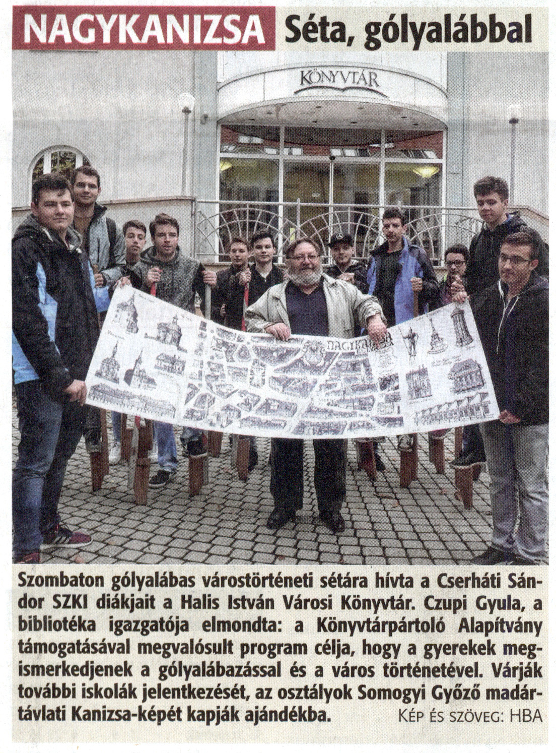 Nyilvános 1506 | 2520 | Zalai Hírlap 2018. november 12. 262. szám 16. oldal - Séta, gólyalábbal | NAGYKANIZSA Séta, gólyalábbal Szombaton gólyalábas várostörténeti sétára hívta a Cserháti Sándor SZKI diákjait a Halis István Városi Könyvtár. Czupi Gyula, a bibliotéka igazgatója elmondta: a Könyvtárpártoló Alapítvány támogatásával megvalósult program célja, hogy a gyerekek megismerkedjenek a gólyalábazással és a város történetével. Várják további iskolák jelentkezését, az osztályok Somogyi Győző madártávlati Kanizsa-képét kapják ajándékba. kép és szöveg: MBA |