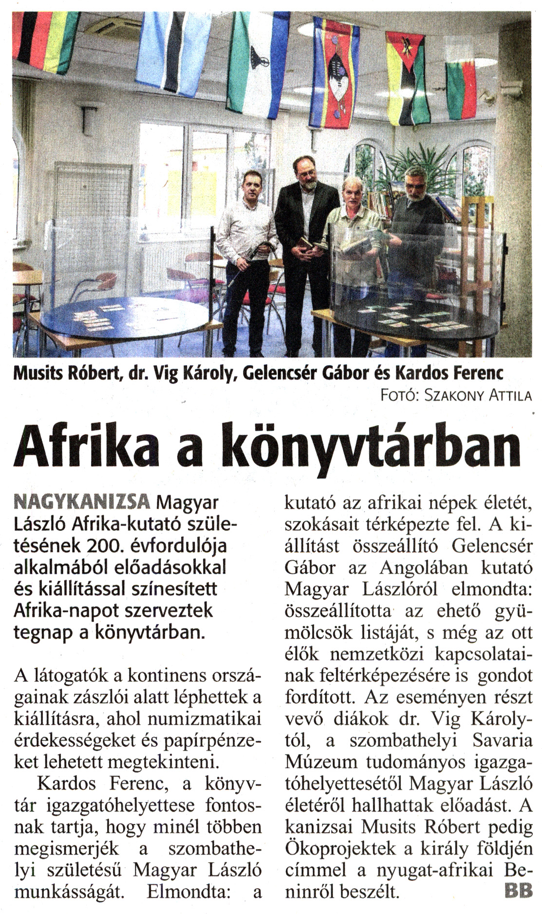 Nyilvános 1503 | 2541 | Zalai Hírlap 2018. november 14. 264. szám 4. oldal - Afrika a könyvtárban | Musits Róbert, dr. Vig Károly, Gelencsér Gábor és Kardos Ferenc Fotó: Szakony Attila Afrika a könyvtárban NAGYKANIZSA Magyar László Afrika-kutató születésének 200. évfordulója alkalmából előadásokkal és kiállítással színesített Afrika-napot szerveztek tegnap a könyvtárban. A látogatók a kontinens országainak zászlói alatt léphettek a kiállításra, ahol numizmatikai érdekességeket és papírpénzeket lehetett megtekinteni. Kardos Ferenc, a könyvtár igazgatóhelyettese fontosnak tartja, hogy minél többen megismerjék a szombathelyi születésű Magyar László munkásságát. Elmondta: a kutató az afrikai népek életét, szokásait térképezte fel. A kiállítást összeállító Gelencsér Gábor az Angolában kutató Magyar Lászlóról elmondta: összeállította az ehető gyümölcsök listáját, s még az ott élők nemzetközi kapcsolatainak feltérképezésére is gondot fordított. Az eseményen részt vevő diákok dr. Vig Károlytól, a szombathelyi Savaria Múzeum tudományos igazgatóhelyettesétől Magyar László életéről hallhattak előadást. A kanizsai Musits Róbert pedig Ökoprojektek a király földjén címmel a nyugat-afrikai Beninről beszélt. BB |