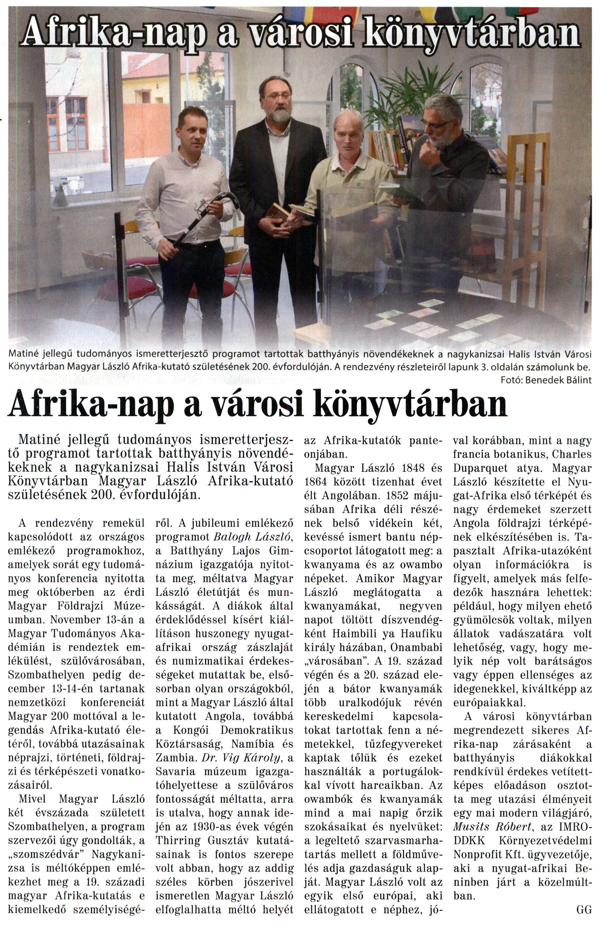 Nyilvános 1587 | 2725 | Nagykanizsai Maraton 2018. november 16. 45. szám 1, 3. oldal | Matiné jellegű tudományos ismeretterjesztő programot tartottak batthyányis növendékeknek a nagykanizsai Halis István Városi Könyvtárban Magyar László Afrika-kutató születésének 200. évfordulóján. A rendezvény részleteiről lapunk 3. oldalán számolunk be. Fotó: Benedek Bálint Afrika-nap a városi könyvtárban Matiné jellegű tudományos ismeretterjesztő programot tartottak batthyányis növendékeknek a nagykanizsai Halis István Városi Könyvtárban Magyar László Afrika-kutató születésének 200. évfordulóján. A rendezvény remekül kapcsolódott az országos emlékező programokhoz, amelyek sorát egy tudományos konferencia nyitotta meg októberben az érdi Magyar Földrajzi Múzeumban. November 13-án a Magyar Tudományos Akadémián is rendeztek emlékülést, szülővárosában, Szombathelyen pedig december 13-14-én tartanak nemzetközi konferenciát Magyar 200 mottóval a legendás Afrika-kutató életéről, továbbá utazásainak néprajzi, történeti, földrajzi és térképészeti vonatkozásairól. Mivel Magyar László két évszázada született Szombathelyen, a program szervezői úgy gondolták, a „szomszédvár" Nagykanizsa is méltóképpen emlékezhet meg a 19. századi magyar Afrika-kutatás e kiemelkedő személyiségéről. A jubileumi emlékező programot Balogh László, a Batthyány Lajos Gimnázium igazgatója nyitotta meg, méltatva Magyar László életútját és munkásságát. A diákok által érdeklődéssel kísért kiállításon huszonegy nyugatafrikai ország zászlaját és numizmatikai érdekességeket mutattak be, elsősorban olyan országokból, mint a Magyar László által kutatott Angola, továbbá a Kongói Demokratikus Köztársaság, Namíbia és Zambia. Dr. Víg Károly, a Savaria múzeum igazgatóhelyettese a szülőváros fontosságát méltatta, arra is utalva, hogy annak idején az 1930-as évek végén Thirring Gusztáv kutatásainak is fontos szerepe volt abban, hogy az addig széles körben jószerivel ismeretlen Magyar László elfoglalhatta méltó helyét az Afrika-kutatók panteonjában. Magyar László 1848 és 1864 között tizenhat évet élt Angolában. 1852 májusában Afrika déli részének belső vidékein két, kevéssé ismert bantu népcsoportot látogatott meg: a kwanyama és az owambo népeket. Amikor Magyar László meglátogatta a kwanyamákat, negyven napot töltött díszvendégként Haimbili ya Haufiku király házában, Onambabi „városában". A 19. század végén és a 20. század elején a bátor kwanyamák több uralkodójuk révén kereskedelmi kapcsolatokat tartottak fenn a németekkel, tűzfegyvereket kaptak tőlük és ezeket használták a portugálokkal vívott harcaikban. Az owambók és kwanyamák mind a mai napig őrzik szokásaikat és nyelvüket: a legeltető szarvasmarhatartás mellett a földművelés adja gazdaságuk alapját. Magyar László volt az egyik első európai, aki ellátogatott e néphez, jó- val korábban, mint a nagy francia botanikus, Charles Duparquet atya. Magyar László készítette el Nyugat-Afrika első térképét és nagy érdemeket szerzett Angola földrajzi térképének elkészítésében is. Tapasztalt Afrika-utazóként olyan információkra is figyelt, amelyek más felfedezők hasznára lehettek: például, hogy milyen ehető gyümölcsök voltak, milyen állatok vadászatára volt lehetőség, vagy, hogy melyik nép volt barátságos vagy éppen ellenséges az idegenekkel, kiváltképp az európaiakkal. A városi könyvtárban megrendezett sikeres Afrika-nap zárásaként a batthyányis diákokkal rendkívül érdekes vetítettképes előadáson osztotta meg utazási élményeit egy mai modern világjáró, Musits Róbert, az IMRO-DDKK Környezetvédelmi Nonprofit Kft. ügyvezetője, aki a nyugat-afrikai Beninben járt a közelmúltban. GG |