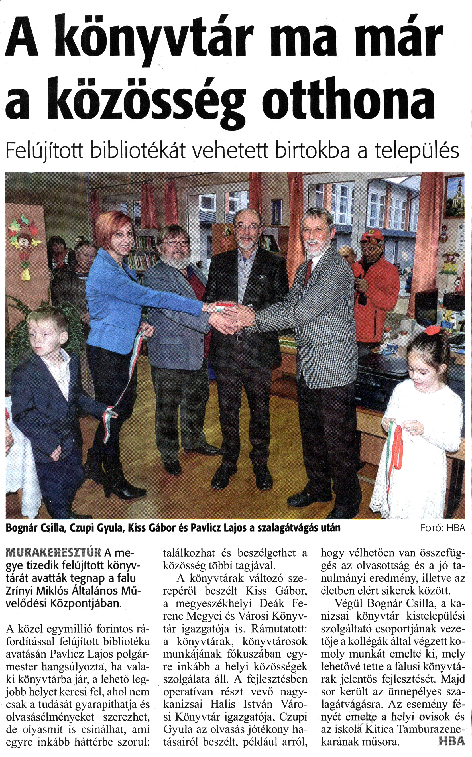 Nyilvános 1529 | 2543 | Zalai Hírlap 2018. december 22. 297. szám 16. oldal | A könyvtár ma már a közösség otthona Felújított bibliotékát vehetett birtokba a település Bognár Csilla, Czupi Gyula, Kiss Gábor és Pavlicz Lajos a szalagátvágás után Fotó: hba MURAKERESZTÚR A megye tizedik felújított könyvtárát avatták tegnap a falu Zrínyi Miklós Általános Művelődési Központjában. A közel egymillió forintos ráfordítással felújított bibliotéka avatásán Pavlicz Lajos polgármester hangsúlyozta, ha valaki könyvtárba jár, a lehető legjobb helyet keresi fel, ahol nem csak a tudását gyarapíthatja és olvasásélményeket szerezhet, de olyasmit is csinálhat, ami egyre inkább háttérbe szorul: találkozhat és beszélgethet a közösség többi tagjával. A könyvtárak változó szerepéről beszélt Kiss Gábor, a megyeszékhelyi Deák Ferenc Megyei és Városi Könyvtár igazgatója is. Rámutatott: a könyvtárak, könyvtárosok munkájának fókuszában egyre inkább a helyi közösségek szolgálata áll. A fejlesztésben operatívan részt vevő nagykanizsai Halis István Városi Könyvtár igazgatója, Czupi Gyula az olvasás jótékony hatásairól beszélt, például arról, hogy vélhetően van összefüggés az olvasottság és a jó tanulmányi eredmény, illetve az életben elért sikerek között. Végül Bognár Csilla, a kanizsai könyvtár kistelepülési szolgáltató csoportjának vezetője a kollégák által végzett komoly munkát emelte ki, mely lehetővé tette a falusi könyvtárak jelentős fejlesztését. Majd sor került az ünnepélyes szalagátvágásra. Az esemény fényét emelte a helyi ovisok és az iskola Kitica Tamburazene-karának műsora. HBA |