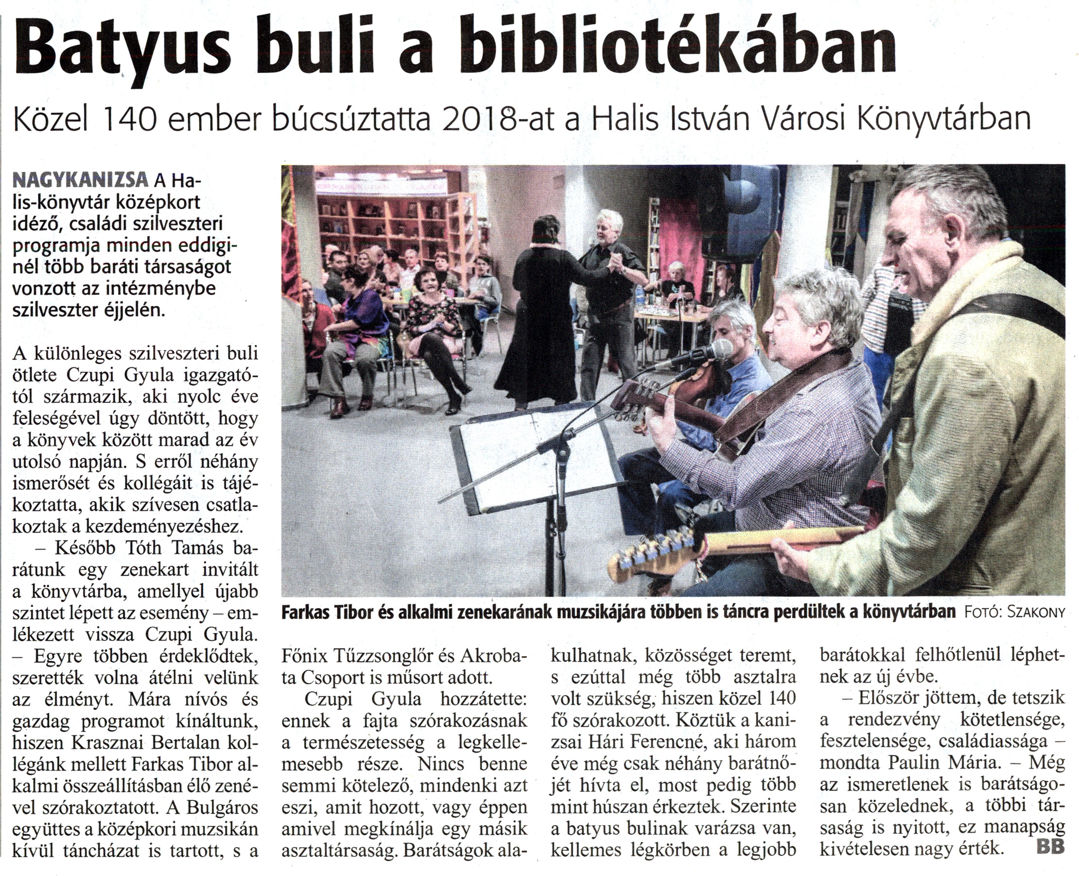 Nyilvános 1549 | 4903 | Zalai Hírlap 2019. január 2. 1. szám 3. oldal | Batyus buli a bibliotékában Közel 140 ember búcsúztatta 2018-at a Halis István Városi Könyvtárban Farkas Tibor és alkalmi zenekarának muzsikájára többen is táncra perdültek a könyvtárban Fotó: Szakony NAGYKANIZSA A Halis-könyvtár középkort idéző, családi szilveszteri programja minden eddiginél több baráti társaságot vonzott az intézménybe szilveszter éjjelén. A különleges szilveszteri buli ötlete Czupi Gyula igazgatótól származik, aki nyolc éve feleségével úgy döntött, hogy a könyvek között marad az év utolsó napján. S erről néhány ismerősét és kollégáit is tájékoztatta, akik szívesen csatlakoztak a kezdeményezéshez. - Később Tóth Tamás barátunk egy zenekart invitált a könyvtárba, amellyel újabb szintet lépett az esemény - emlékezett vissza Czupi Gyula. - Egyre többen érdeklődtek, szerették volna átélni velünk az élményt. Mára nívós és gazdag programot kínáltunk, hiszen Krasznai Bertalan kollégánk mellett Farkas Tibor alkalmi összeállításban élő zenével szórakoztatott. A Bulgáros együttes a középkori muzsikán kívül táncházat is tartott, s a Főnix Tűzzsonglőr és Akrobata Csoport is műsort adott. Czupi Gyula hozzátette: ennek a fajta szórakozásnak a természetesség a legkellemesebb része. Nincs benne semmi kötelező, mindenki azt eszi, amit hozott, vagy éppen amivel megkínálja egy másik asztaltársaság. Barátságok alakulhatnak, közösséget teremt, s ezúttal még több asztalra volt szükség, hiszen közel 140 fő szórakozott. Köztük a kanizsai Hári Ferencné, aki három éve még csak néhány barátnőjét hívta el, most pedig több mint húszan érkeztek. Szerinte a batyus bulinak varázsa van, kellemes légkörben a legjobb barátokkal felhőtlenül léphetnek az új évbe. - Először jöttem, de tetszik a rendezvény kötetlensége, fesztelensége, családiassága -mondta Paulin Mária. - Még az ismeretlenek is barátságosan közelednek, a többi társaság is nyitott, ez manapság kivételesen nagy érték. BB |