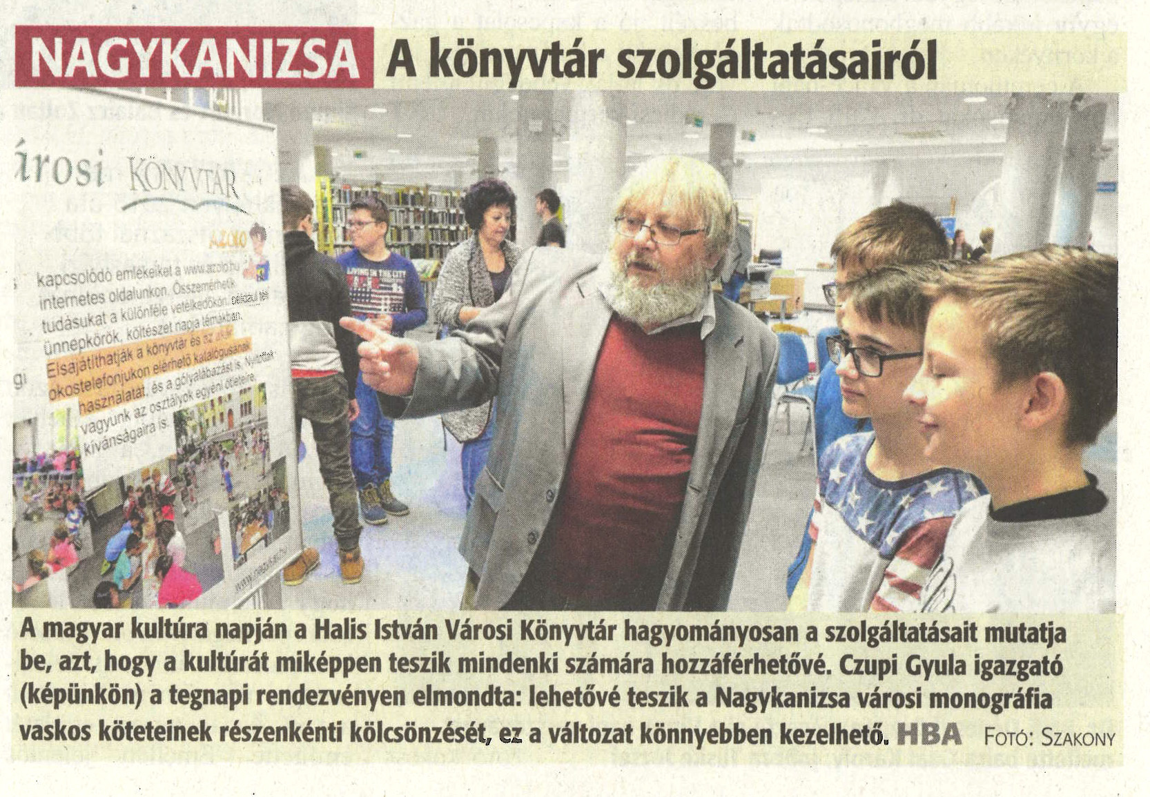 Nyilvános 1473 | 2802 | Zalai Hírlap 2019. január 23. 19. szám 4. oldal - A könyvtár szolgáltatásairól | A magyar kultúra napján a Halis István Városi Könyvtár hagyományosan a szolgáltatásait mutatja be, azt, hogy a kultúrát miképpen teszik mindenki számára hozzáférhetővé. Czupi Gyula igazgató (képünkön) a tegnapi rendezvényen elmondta: lehetővé teszik a Nagykanizsa városi monográfia köteteinek részenkénti kölcsönzését, ez a változat könnyebben kezelhető. |