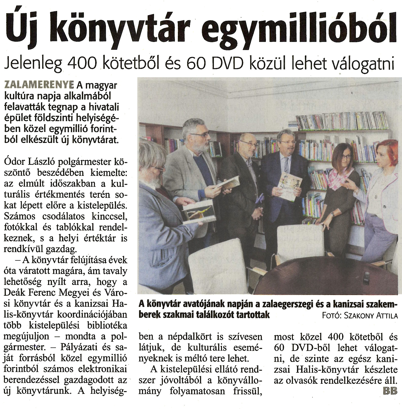 Nyilvános 1540 | 3139 | Zalai Hírlap 2019. január 23. 19. szám 16. oldal - Új könyvtár egymillióból | Jelenleg 400 kötetből és 60 DVD közül lehet válogatni Zalamerenye A magyar kultúra napja alkalmából felavatták tegnap a hivatali épület földszinti helyiségében közel egymillió forintból elkészült új könyvtárat. Ódor László polgármester köszöntő beszédében kiemelte: az elmúlt időszakban a kulturális értékmentés terén sokat lépett előre a kistelepülés. Számos csodálatos kinccsel, fotókkal és tablókkal rendelkeznek, s a helyi értéktár is rendkívül gazdag. - A könyvtár felújítása évek óta váratott magára, ám tavaly lehetőség nyílt arra, hogy a Deák Ferenc Megyei és Városi könyvtár és a kanizsai Halis-könyvtár koordinációjában több kistelepülési bibliotéka megújuljon - mondta a polgármester. - Pályázati és saját forrásból közel egymillió forintból számos elektronikai berendezéssel gazdagodott az új könyvtárunk. A helyiségben a népdalkört is szívesen látjuk, de kulturális eseményeknek is méltó tere lehet. A kistelepülési ellátó rendszer jóvoltából a könyvtárállomány folyamatosan frissül, most közel 400 kötetből és 60 DVD-ből lehet válogatni, de szinte az egész kanizsai Halis-könyvtár készlete az olvasók rendelkezésére áll. BB A könyvtár avatójának napján a zalaegerszegi és a kanizsai szakemberek szakmai találkozót tartottak Fotó: Szakony Attila |