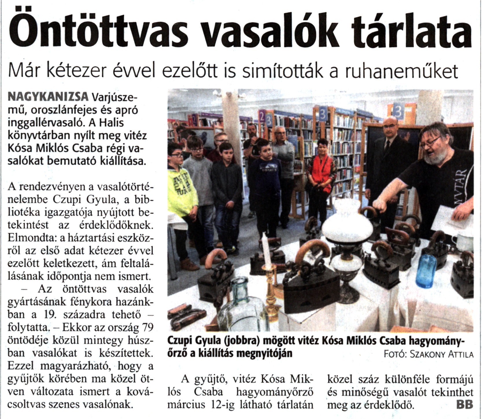 Nyilvános 1642 | 2747 | Zalai Hírlap 2019. február 14. 38. szám 16. oldal | Öntöttvas vasalók tárlata Már kétezer évvel ezelőtt is simították a ruhaneműket NAGYKANIZSA Varjúszemű, oroszlánfejes és apró inggallérvasaló. A Halis könyvtárban nyílt meg vitéz Kósa Miklós Csaba régi vasalókat bemutató kiállítása. A rendezvényen a vasalótörténelembe Czupi Gyula, a bibliotéka igazgatója nyújtott betekintést az érdeklődőknek. Elmondta: a háztartási eszközről az első adat kétezer évvel ezelőtt keletkezett, ám feltalálásának időpontja nem ismert. - Az öntöttvas vasalók gyártásának fénykora hazánkban a 19. századra tehető -folytatta. - Ekkor az ország 79 öntödéje közül mintegy húszban vasalókat is készítettek. Ezzel magyarázható, hogy a gyűjtők körében ma közel ötven változata ismert a kovácsoltvas szenes vasalónak. A gyűjtő, vitéz Kósa Miklós Csaba hagyományőrző március 12-ig látható tárlatán közel száz különféle formájú és minőségű vasalót tekinthet meg az érdeklődő. BB Czupi Gyula (jobbra) mögött vitéz Kósa Miklós Csaba hagyományőrző a kiállítás megnyitóján Fotó: Szakony Attila |