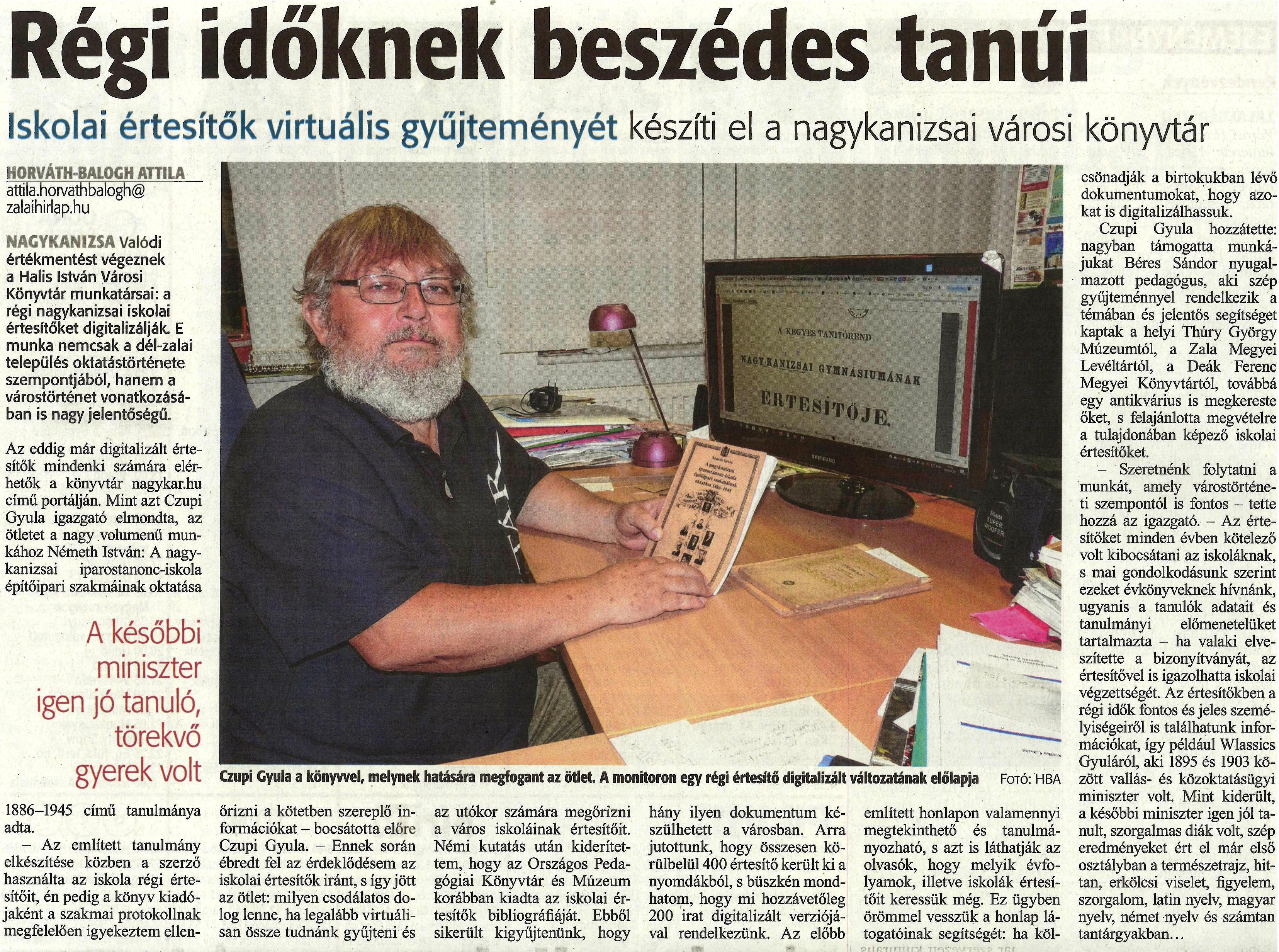 Nyilvános 1208 | 2209 | Régi időknek beszédes tanúi | Iskolai értesítők virtuális gyűjteményét készíti el a nagykanizsai városi könyvtár HORVÁTH-BALOGH ATTILA attila.horvathbalogh@zalaihirlap.hu NAGYKANIZSA Valódi értékmentést végeznek a Halis István Városi Könyvtár munkatársai: a régi nagykanizsai iskolai értesítőket digitalizálják. E munka nemcsak a dél-zalai település oktatástörténete szempontjából, hanem a várostörténet vonatkozásában is nagy jelentőségű. Az eddig már digitalizált értesítők mindenki számára elérhetők a könyvtár nagykar.hu című portálján. Mint azt Czupi Gyula igazgató elmondta, az ötletet a nagy volumenű munkához Németh István: A nagykanizsai iparostanonc-iskola építőipari szakmáinak oktatása - A későbbi miniszter igen jó tanuló, törekvő gyerek volt - 1886-1945 című tanulmánya adta. -Az említett tanulmány elkészítése közben a szerző használta az iskola régi értesítőit, én pedig a könyv kiadójaként a szakmai protokollnak megfelelően igyekeztem ellenőrizni a kötetben szereplő információkat - bocsátotta előre Czupi Gyula. - Ennek során ébredt fel az érdeklődésem az iskolai értesítők iránt, s így jött az ötlet: milyen csodálatos dolog lenne, ha legalább virtuálisan össze tudnánk gyűjteni és az utókor számára megőrizni a város iskoláinak értesítőit. Némi kutatás után kiderítettem, hogy az Országos Pedagógiai Könyvtár és Múzeum korábban kiadta az iskolai értesítők bibliográfiáját. Ebből sikerült kigyűjtenünk, hogy hány ilyen dokumentum készülhetett a városban. Arra jutottunk, hogy összesen körülbelül 400 értesítő került ki a nyomdákból, s büszkén mondhatom, hogy mi hozzávetőleg 200 irat digitalizált verziójával rendelkezünk. Az előbb említett honlapon valamennyi megtekinthető és tanulmányozható, s azt is láthatják az olvasók, hogy melyik évfolyamok, illetve iskolák értesítőit keressük még. Ez ügyben örömmel vesszük a honlap látogatóinak segítségét: ha kölcsönadják a birtokukban lévő dokumentumokat, hogy azokat is digitalizálhassuk. Czupi Gyula hozzátette: nagyban támogatta munkájukat Béres Sándor nyugalmazott pedagógus, aki szép gyűjteménnyel rendelkezik a témában és jelentős segítséget kaptak a helyi Thúry György Múzeumtól, a Zala Megyei Levéltártól, a Deák Ferenc Megyei Könyvtártól, továbbá egy antikvárius is megkereste őket, s felajánlotta megvételre a tulajdonában képező iskolai értesítőket. - Szeretnénk folytatni a munkát, amely várostörténeti szempontéi is fontos - tette hozzá az igazgató. - Az értesítőket minden évben kötelező volt kibocsátani az iskoláknak, s mai gondolkodásunk szerint ezeket évkönyveknek hívnánk, ugyanis a tanulók adatait és tanulmányi előmenetelüket tartalmazta - ha valaki elveszítette a bizonyítványát, az értesítővel is igazolhatta iskolai végzettségét. Az értesítőkben a régi idők fontos és jeles személyiségeiről is találhatunk információkat, így például Wlassics Gyuláról, aki 1895 és 1903 között vallás- és közoktatásügyi miniszter volt. Mint kiderült, a későbbi miniszter igen jól tanult, szorgalmas diák volt, szép eredményeket ért el már első osztályban a természetrajz, hittan, erkölcsi viselet, figyelem, szorgalom, latin nyelv, magyar nyelv, német nyelv és számtan tantárgyakban... Czupi Gyula a könyvvel, melynek hatására megfogant az ötlet. A monitoron egy régi értesítő digitalizált változatának előlapja Fotó: HBA |