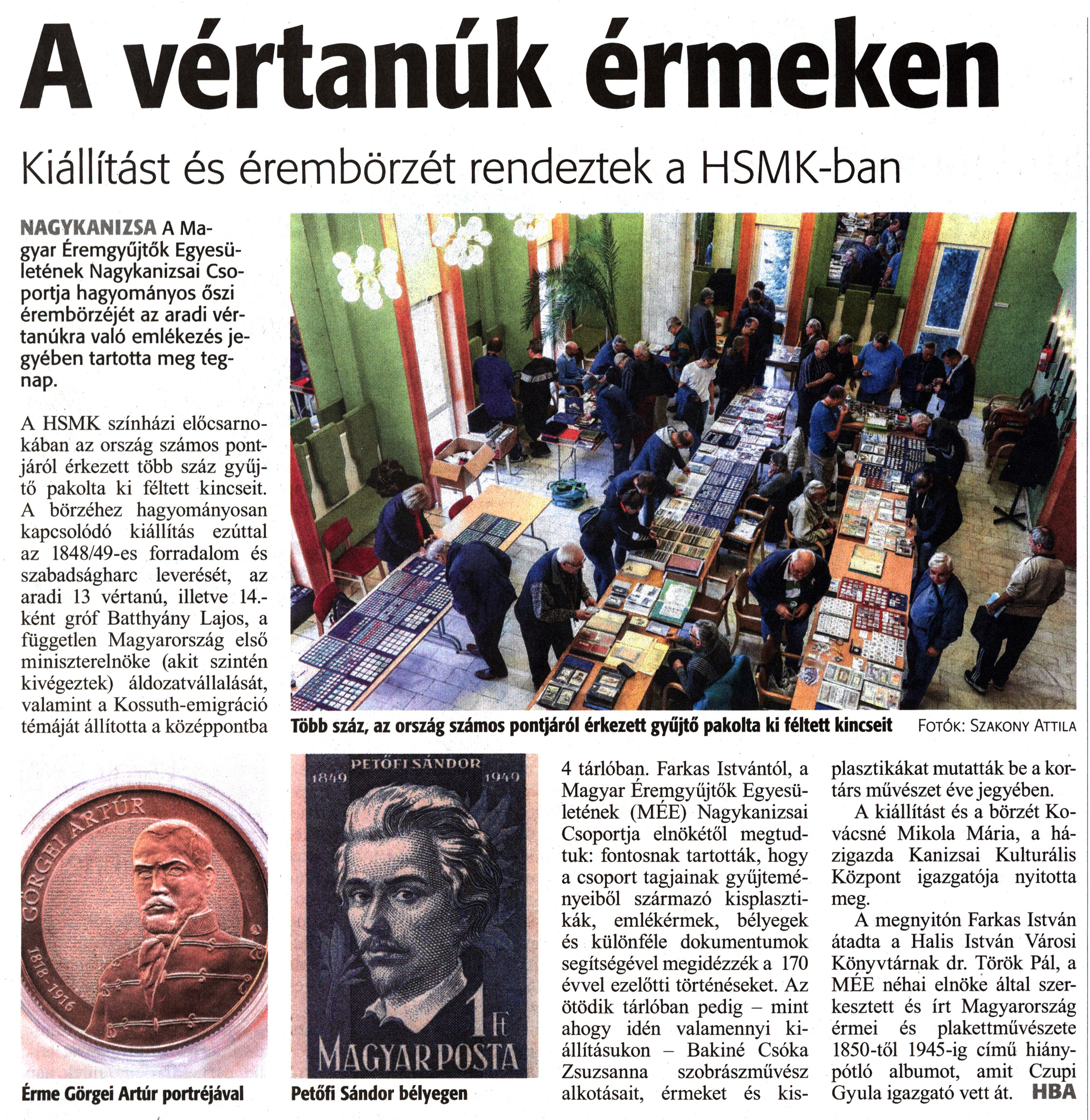 Nyilvános 1281 | 1992 | Zalai Hírlap 2019. november 4. 255. szám 3. oldal - A vértanúk érmeken | A vértanúk érmeken Kiállítást és érembörzét rendeztek a HSMK-ban NAGYKANIZSA A Magyar Éremgyűjtők Egyesületének Nagykanizsai Csoportja hagyományos őszi érembörzéjét az aradi vértanúkra való emlékezés jegyében tartotta meg tegnap. A HSMK színházi előcsarnokában az ország számos pontjáról érkezett több száz gyűjtő pakolta ki féltett kincseit. A börzéhez hagyományosan kapcsolódó kiállítás ezúttal az 1848/49-es forradalom és szabadságharc leverését, az aradi 13 vértanú, illetve 14.-ként gróf Batthyány Lajos, a független Magyarország első miniszterelnöke (akit szintén kivégeztek) áldozatvállalását, valamint a Kossuth-emigráció témáját állította a középpontba 4 tárlóban. Farkas Istvántól, a Magyar Éremgyüjtők Egyesületének (MÉE) Nagykanizsai Csoportja elnökétől megtudtuk: fontosnak tartották, hogy a csoport tagjainak gyűjteményeiből származó kisplasztikák, emlékérmek, bélyegek és különféle dokumentumok segítségével megidézzék a 170 évvel ezelőtti történéseket. Az ötödik tárlóban pedig - mint ahogy idén valamennyi kiállításukon - Bakiné Csóka Zsuzsanna szobrászművész alkotásait, érmeket és kisplasztikákat mutatták be a kortárs művészet éve jegyében. A kiállítást és a börzét Kovácsné Mikola Mária, a házigazda Kanizsai Kulturális Központ igazgatója nyitotta meg. A megnyitón Farkas István átadta a Halis István Városi Könyvtárnak dr. Török Pál, a MÉE néhai elnöke által szerkesztett és írt Magyarország érmei és plakettművészete 1850-től 1945-ig című hiánypótló albumot, amit Czupi Gyula igazgató vett át. HBA Érme Görgei Artúr portréjával Petőfi Sándor bélyegen Több száz, az ország számos pontjáról érkezett gyűjtő pakolta ki féltett kincseit Fotók: Szakony Attila |
