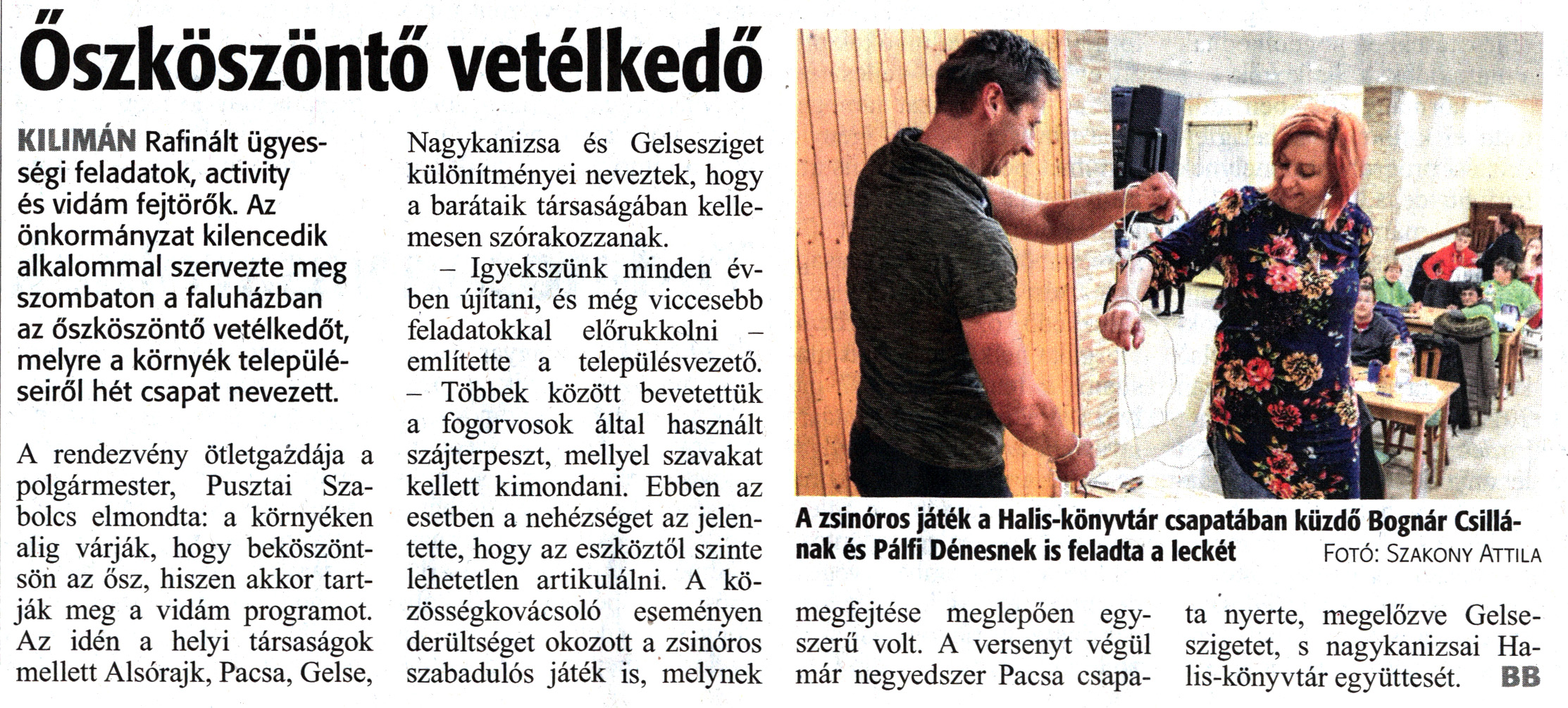 Nyilvános 1368 | 2363 | Zalai Hírlap 2019. november 18. 267. szám 6. oldal | Őszköszöntő vetélkedő KILIMÁN Rafinált ügyességi feladatok, activity és vidám fejtörők. Az önkormányzat kilencedik alkalommal szervezte meg szombaton a faluházban az őszköszöntő vetélkedőt, melyre a környék településeiről hét csapat nevezett. A rendezvény ötletgazdája a polgármester, Pusztai Szabolcs elmondta: a környéken alig várják, hogy beköszöntsön az ősz, hiszen akkor tartják meg a vidám programot. Az idén a helyi társaságok mellett Alsórajk, Pacsa, Gelse, Nagykanizsa és Gelsesziget különítményei neveztek, hogy a barátaik társaságában kellemesen szórakozzanak. - Igyekszünk minden évben újítani, és még viccesebb feladatokkal előrukkolni -említette a településvezető. - Többek között bevetettük a fogorvosok által használt szájterpeszt, mellyel szavakat kellett kimondani. Ebben az esetben a nehézséget az jelentette, hogy az eszköztől szinte lehetetlen artikulálni. A közösségkovácsoló eseményen derültséget okozott a zsinóros szabadulós játék is, melynek megfejtése meglepően egyszerű volt. A versenyt végül már negyedszer Pacsa csapata nyerte, megelőzve Gelseszigetet, s nagykanizsai Halis-könyvtár együttesét. BB A zsinóros játék a Halis-könyvtár csapatában küzdő Bognár Csillának és Pálfi Dénesnek is feladta a leckét Fotó: Szakony Attila |