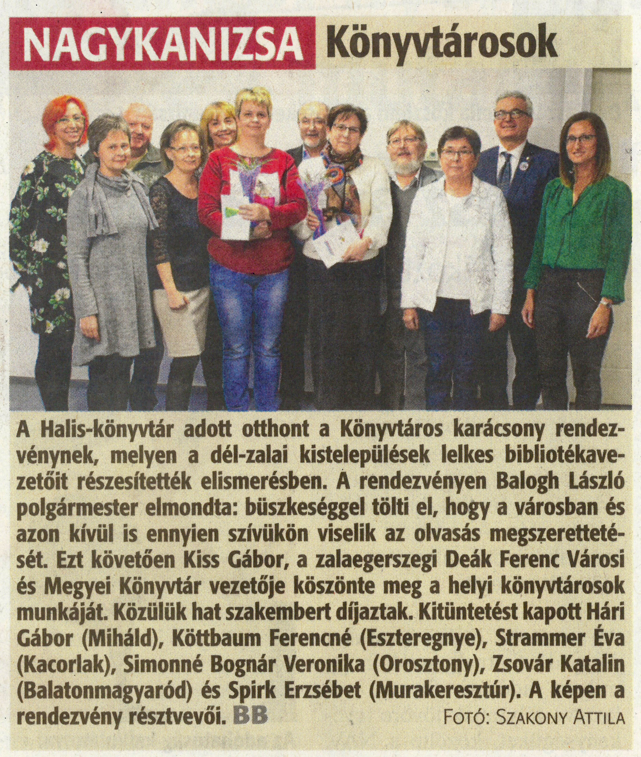Nyilvános 1323 | 1974 | Zalai Hírlap 2019. december 11. 287.sz. 3.old. - NAGYKANIZSA Könyvtárosok | A Halis-könyvtár adott otthont a Könyvtáros karácsony rendezvénynek, melyen a dél-zalai kistelepülések lelkes bibliotékavezetőit részesítették elismerésben. A rendezvényen Balogh László polgármester elmondta: büszkeséggel tölti el, hogy a városban és azon kívül is ennyien szívükön viselik az olvasás megszerettetését. Ezt követően Kiss Gábor, a zalaegerszegi Deák Ferenc Városi és Megyei Könyvtár vezetője köszönte meg a helyi könyvtárosok munkáját. Közülük hat szakembert díjaztak. Kitüntetést kapott Hári Gábor (Miháld), Köttbaum Ferencné (Eszteregnye), Strammer Éva (Kacorlak), Simonné Bognár Veronika (Orosztony), Zsovár Katalin (Balatonmagyaród) és Spirk Erzsébet (Murakeresztúr). A képen a rendezvény résztvevői. FOTÓ: SZAKONY ATTILA |
