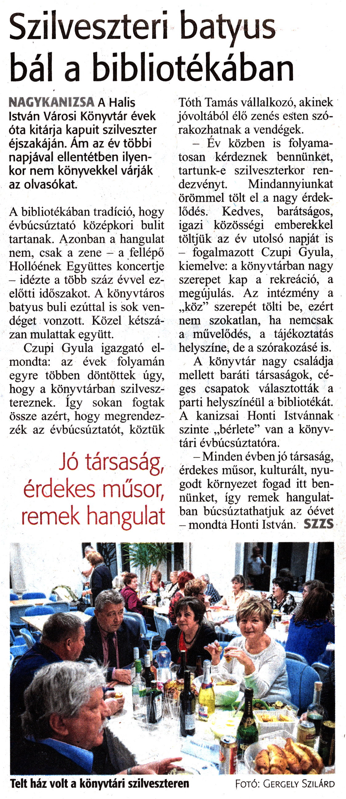 Nyilvános 1416 | 4636 | Zalai Hírlap 2020. január 2. 1. szám 4. oldal | Szilveszteri bátyus bál a bibliotékában NAGYKANIZSA A Halis István Városi Könyvtár évek óta kitárja kapuit szilveszter éjszakáján. Ám az év többi napjával ellentétben ilyenkor nem könyvekkel várják az olvasókat. A bibliotékában tradíció, hogy évbúcsúztató középkori bulit tartanak. Azonban a hangulat nem, csak a zene - a fellépő Hollóének Együttes koncertje - idézte a több száz évvel ezelőtti időszakot. A könyvtáros bátyus buli ezúttal is sok vendéget vonzott. Közel kétszázan mulattak együtt. Czupi Gyula igazgató elmondta: az évek folyamán egyre többen döntöttek úgy, hogy a könyvtárban szilvesztereznek. így sokan fogtak össze azért, hogy megrendezzék az évbúcsúztatót, köztük Tóth Tamás vállalkozó, akinek jóvoltából élő zenés esten szórakozhatnak a vendégek. - Év közben is folyamatosan kérdeznek bennünket, tartunk-e szilveszterkor rendezvényt. Mindannyiunkat örömmel tölt el a nagy érdeklődés. Kedves, barátságos, igazi közösségi emberekkel töltjük az év utolsó napját is - fogalmazott Czupi Gyula, kiemelve: a könyvtárban nagy szerepet kap a rekreáció, a megújulás. Az intézmény a „köz" szerepét tölti be, ezért nem szokatlan, ha nemcsak a művelődés, a tájékoztatás helyszíne, de a szórakozásé is. A könyvtár nagy családja mellett baráti társaságok, céges csapatok választották a parti helyszínéül a bibliotékát. A kanizsai Honti Istvánnak szinte „bérlete" van a könyvtári évbúcsúztatóra. - Minden évben jó társaság, érdekes műsor, kulturált, nyugodt környezet fogad itt bennünket, így remek hangulatban búcsúztathatjuk az óévet - mondta Honti István. SZZS Telt ház volt a könyvtári szilveszteren Fotó: Gergely Szilárd |