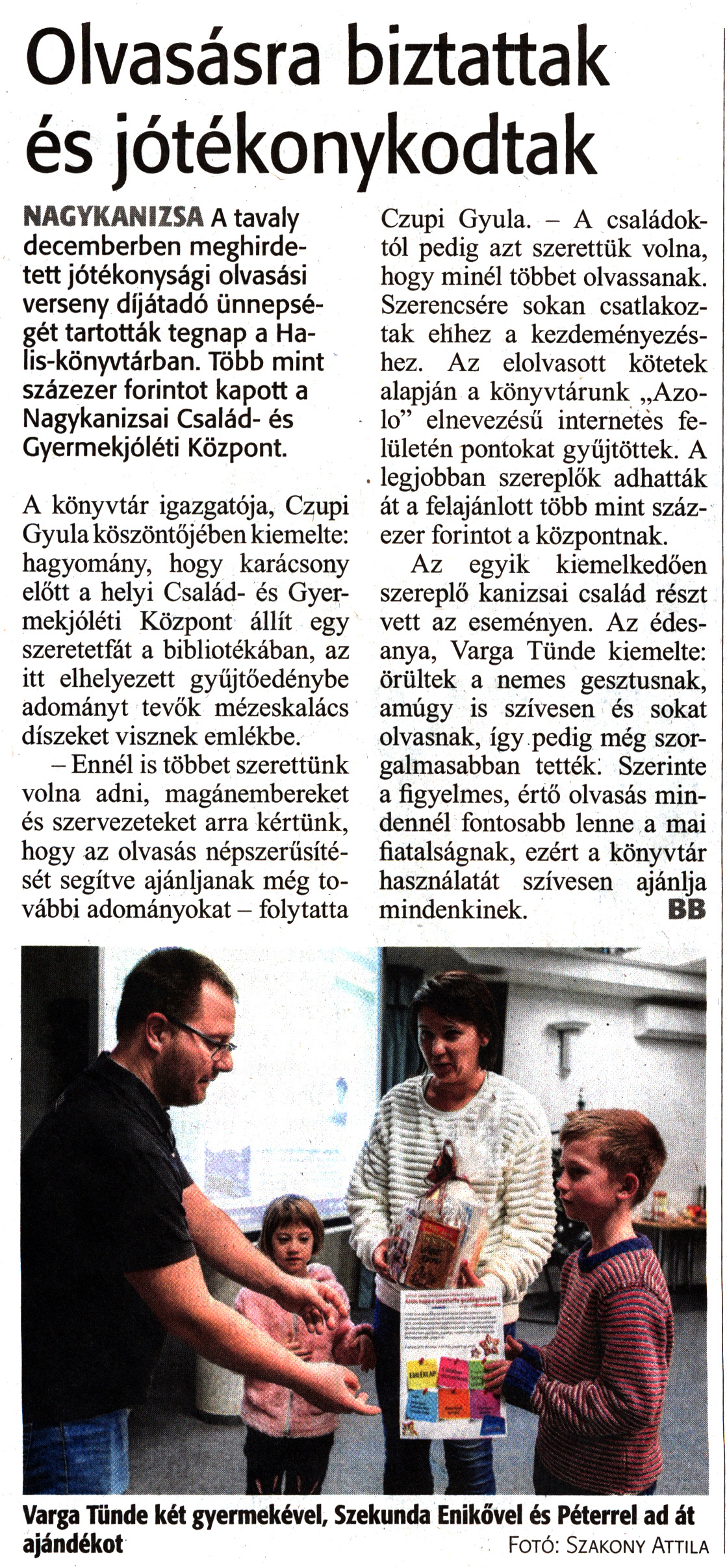 Nyilvános 1425 | 2518 | Zalai Hírlap 2020. január 7. 5. szám 4. oldal | Olvasásra biztattak és jótékonykodtak NAGYKANIZSA A tavaly decemberben meghirdetett jótékonysági olvasási verseny díjátadó ünnepségét tartották tegnap a Halis-könyvtárban. Több mint százezer forintot kapott a Nagykanizsai Család- és Gyermekjóléti Központ. A könyvtár igazgatója, Czupi Gyula köszöntőjében kiemelte: hagyomány, hogy karácsony előtt a helyi Család- és Gyermekjóléti Központ állít egy szeretetfát a bibliotékában, az itt elhelyezett gyűjtőedénybe adományt tevők mézeskalács díszeket visznek emlékbe. - Ennél is többet szerettünk volna adni, magánembereket és szervezeteket arra kértünk, hogy az olvasás népszerűsítését segítve ajánljanak még további adományokat - folytatta Czupi Gyula. - A családoktól pedig azt szerettük volna, hogy minél többet olvassanak. Szerencsére sokan csatlakoztak ehhez a kezdeményezéshez. Az elolvasott kötetek alapján a könyvtárunk „Azolo" elnevezésű internetes felületén pontokat gyűjtöttek. A legjobban szereplők adhatták át a felajánlott több mint százezer forintot a központnak. Az egyik kiemelkedően szereplő kanizsai család részt vett az eseményen. Az édesanya, Varga Tünde kiemelte: örültek a nemes gesztusnak, amúgy is szívesen és sokat olvasnak, így pedig még szorgalmasabban tették: Szerinte a figyelmes, értő olvasás mindennél fontosabb lenne a mai fiatalságnak, ezért a könyvtár használatát szívesen ajánlja mindenkinek. BB Varga Tünde két gyermekével, Szekunda Enikővel és Péterrel ad át ajándékot Fotó: Szakony Attila |