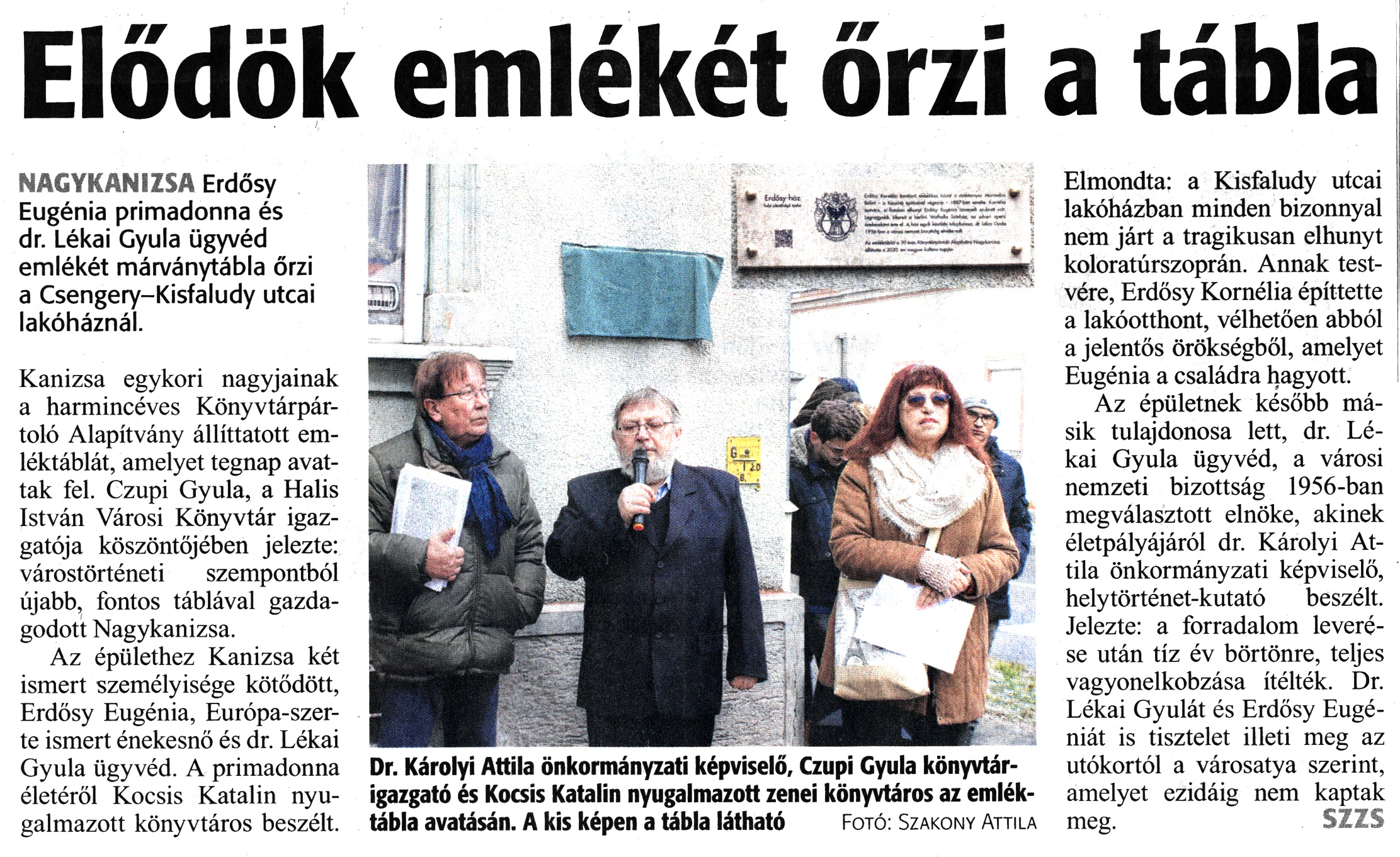 Nyilvános 1372 | 2424 | Zalai Hírlap 2020. január 23. 19. szám 3. oldal | Elődök emlékét őrzi a tábla NAGYKANIZSA Erdősy Eugénia primadonna és dr. Lékai Gyula ügyvéd emlékét márványtábla őrzi a Csengery-Kisfaludy utcai lakóháznál. Kanizsa egykori nagyjainak a harmincéves Könyvtárpártoló Alapítvány állíttatott emléktáblát, amelyet tegnap avattak fel. Czupi Gyula, a Halis István Városi Könyvtár igazgatója köszöntőjében jelezte: várostörténeti szempontból újabb, fontos táblával gazdagodott Nagykanizsa. Az épülethez Kanizsa két ismert személyisége kötődött, Erdősy Eugénia, Európa-szerte ismert énekesnő és dr. Lékai Gyula ügyvéd. A primadonna életéről Kocsis Katalin nyugalmazott könyvtáros beszélt. Elmondta: a Kisfaludy utcai lakóházban minden bizonnyal nem járt a tragikusan elhunyt koloratúrszoprán. Annak testvére, Erdősy Kornélia építtette a lakóotthont, vélhetően abból a jelentős örökségből, amelyet Eugénia a családra hagyott. Az épületnek később másik tulajdonosa lett, dr. Lékai Gyula ügyvéd, a városi nemzeti bizottság 1956-ban megválasztott elnöke, akinek életpályájáról dr. Károlyi Attila önkormányzati képviselő, helytörténet-kutató beszélt. Jelezte: a forradalom leverése után tíz év börtönre, teljes vagyonelkobzása ítélték. Dr. Lékai Gyulát és Erdősy Eugéniát is tisztelet illeti meg az utókortól a városatya szerint, amelyet ezidáig nem kaptak meg. SZZS Dr. Károlyi Attila önkormányzati képviselő, Czupi Gyula könyvtárigazgató és Kocsis Katalin nyugalmazott zenei könyvtáros az emléktábla avatásán. A kis képen a tábla látható Fotó: Szakony Attila |