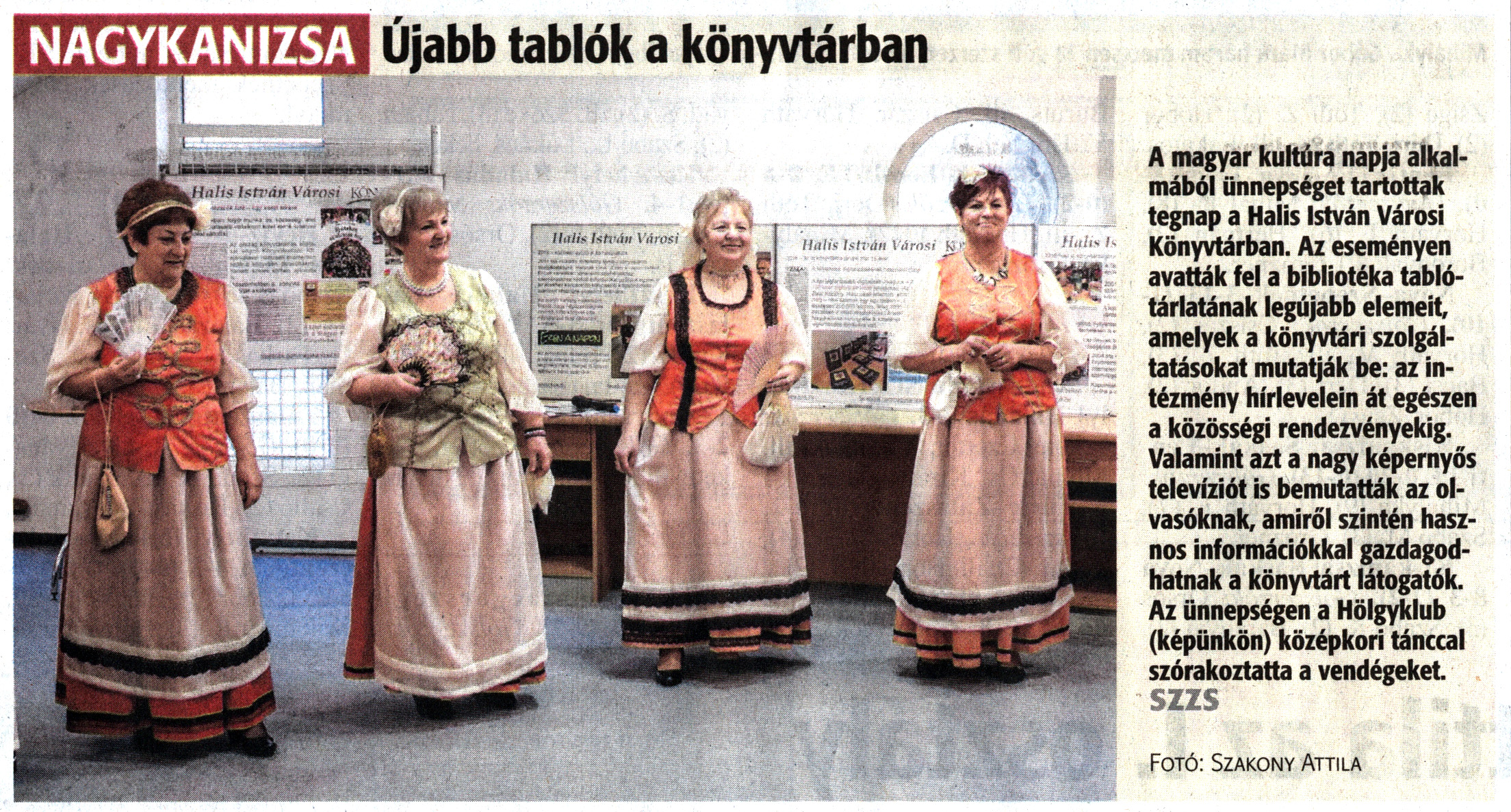 Nyilvános 1375 | 2370 | Zalai Hírlap 2020. január 23. 19. szám 16. oldal | Újabb tablók a könyvtárban A magyar kultúra napja alkalmából ünnepséget tartottak tegnap a Halis István Városi Könyvtárban. Az eseményen avatták fel a bibliotéka tablótárlatának legújabb elemeit, amelyek a könyvtári szolgáltatásokat mutatják be: az intézmény hírlevelein át egészen a közösségi rendezvényekig. Valamint azt a nagy képernyős televíziót is bemutatták az olvasóknak, amiről szintén hasznos információkkal gazdagodhatnak a könyvtárt látogatók. Az ünnepségen a Hölgyklub (képünkön) középkori tánccal szórakoztatta a vendégeket. szzs Fotó: Szakony Attila |