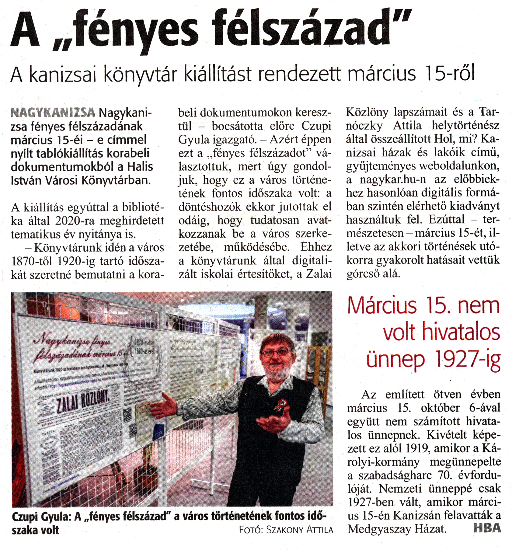 Nyilvános 1261 | 1945 | Zalai Hírlap 2020. március 14. 63. szám 7. oldal | A „fényes félszázad" A kanizsai könyvtár kiállítást rendezett március 15-ről NAGYKANIZSA Nagykanizsa fényes félszázadának március 15-éi - e címmel nyílt tablókiállítás korabeli dokumentumokból a Halis István Városi Könyvtárban. A kiállítás egyúttal a bibliotéka által 2020-ra meghirdetett tematikus év nyitánya is. - Könyvtárunk idén a város 1870-től 1920-ig tartó időszakát szeretné bemutatni a korabeli dokumentumokon keresztül - bocsátotta előre Czupi Gyula igazgató. - Azért éppen ezt a „fényes félszázadot" választottuk, mert úgy gondoljuk, hogy ez a város történetének fontos időszaka volt: a döntéshozók ekkor jutottak el odáig, hogy tudatosan avatkozzanak be a város szerkezetébe, működésébe. Ehhez a könyvtárunk által digitalizált iskolai értesítőket, a Zalai Közlöny lapszámait és a Tarnóczky Attila helytörténész által összeállított Hol, mi? Kanizsai házak és lakóik című, gyűjteményes weboldalunkon, a nagykar.hu-n az előbbiekhez hasonlóan digitális formában szintén elérhető kiadványt használtuk fel. Ezúttal - természetesen - március 15-ét, illetve az akkori történések utókorra gyakorolt hatásait vettük górcső alá. Az említett ötven évben március 15. október 6-ával együtt nem számított hivatalos ünnepnek. Kivételt képezett ez alól 1919, amikor a Károlyi-kormány megünnepelte a szabadságharc 70. évfordulóját. Nemzeti ünneppé csak 1927-ben vált, amikor március 15-én Kanizsán felavatták a Medgyaszay Házat. HBA Czupi Gyula: A „fényes félszázad" a város történetének fontos időszaka volt Fotó: Szakony Attila |