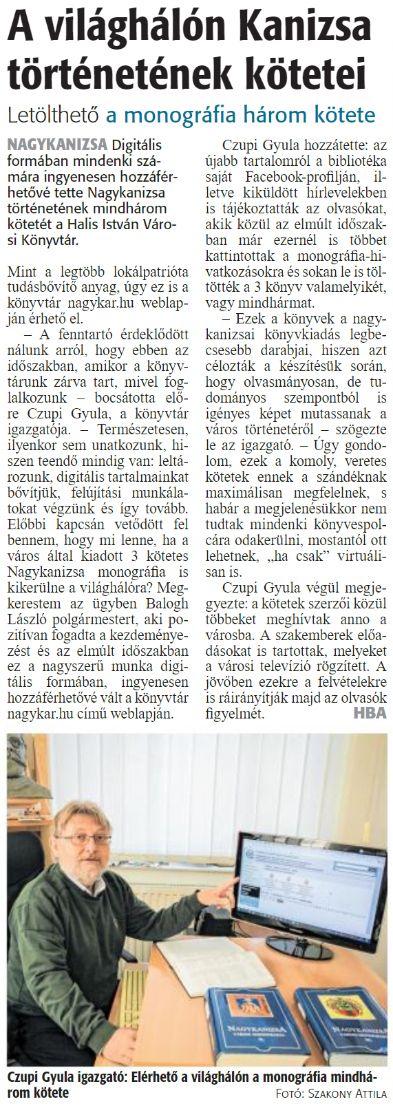 Nyilvános 1903 | 2071 | Zalai Hírlap 2020. április 27. 98. szám 3. oldal | A világhálón Kanizsa történetének kötetei Letölthető a monográfia három kötete NAGYKANIZSA Digitális formában mindenki számára ingyenesen hozzáférhetővé tette Nagykanizsa történetének mindhárom kötetét a Halis István Városi Könyvtár. Mint a legtöbb lokálpatrióta tudásbővítő anyag, úgy ez is a könyvtár nagykar.hu weblapján érhető el. - A fenntartó érdeklődött nálunk arról, hogy ebben az időszakban, amikor a könyvtárunk zárva tart, mivel foglalkozunk - bocsátotta előre Czupi Gyula, a könyvtár igazgatója. - Természetesen, ilyenkor sem unatkozunk, hiszen teendő mindig van: leltározunk, digitális tartalmainkat bővítjük, felújítási munkálatokat végzünk és így tovább. Előbbi kapcsán vetődött fel bennem, hogy mi lenne, ha a város által kiadott 3 kötetes Nagykanizsa monográfia is kikerülne a világhálóra? Megkerestem az ügyben Balogh László polgármestert, aki pozitívan fogadta a kezdeményezést és az elmúlt időszakban ez a nagyszerű munka digitális formában, ingyenesen hozzáférhetővé vált a könyvtár nagykar.hu című weblapján. Czupi Gyula hozzátette: az újabb tartalomról a bibliotéka saját Facebook-profilján, illetve kiküldött hírlevelekben is tájékoztatták az olvasókat, akik közül az elmúlt időszakban már ezernél is többet kattintottak a monográfia-hivatkozásokra és sokan le is töltötték a 3 könyv valamelyikét, vagy mindhármat. - Ezek a könyvek a nagykanizsai könyvkiadás legbecsesebb darabjai, hiszen azt célozták a készítésük során, hogy olvasmányosan, de tudományos szempontból is igényes képet mutassanak a város történetéről - szögezte le az igazgató. - Úgy gondolom, ezek a komoly, veretes kötetek ennek a szándéknak maximálisan megfelelnek, s habár a megjelenésükkor nem tudtak mindenki könyvespolcára odakerülni, mostantól ott lehetnek, „ha csak" virtuálisan is. Czupi Gyula végül megjegyezte: a kötetek szerzői közül többeket meghívtak anno a városba. A szakemberek előadásokat is tartottak, melyeket a városi televízió rögzített. A jövőben ezekre a felvételekre is ráirányítják majd az olvasók figyelmét. HBA Czupi Gyula igazgató: Elérhető a világhálón a monográfia mindhárom kötete Fotó: Szakony Attila |
