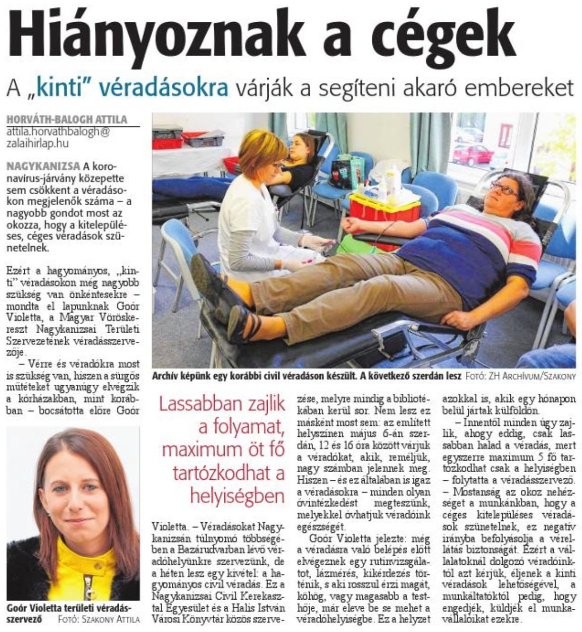 Nyilvános 1318 | 2228 | Zalai Hírlap 2020. május 4. 103. szám 6. oldal | Hiányoznak a cégek A „kinti" véradásokra várják a segíteni akaró embereket Archív képünk egy korábbi civil véradáson készült. A következő szerdán lesz Fotó: ZH Archívum/Szakony HORVÁTH-BALOGH ATTILA attila.horvathbalogh® zalaihirlap.hu NAGYKANIZSA A koronavírus-járvány közepette sem csökkent a véradásokon megjelenők száma - a nagyobb gondot most az okozza, hogy a kitelepüléses, céges véradások szünetelnek. Ezért a hagyományos, „kinti” véradásokon meg nagyobb szükség van önkéntesekre -mondta el lapunknak Goór Violetta, a Magyar Vöröskereszt Nagykanizsai Területi Szervezetének véradásszervezője. - Vérre és véradókra most is szükség van, hiszen a sürgős műtéteket ugyanúgy elvégzik a kórházakban, mint korábban - bocsátotta előre Goór Violetta - Véradásokat Nagykanizsán túlnyomó többségében a Bazárudvarban lévő véradóhelyünkre szervezünk, de a heten lesz egy kivétel: a hagyományos civil véradás. Ez a Nagykanizsai Civil Kerekasztal Egyesület és a Halis István Városi Könyvtár közös szervezése, melyre mindig a bibliotékában kerül sor. Nem lesz ez másként most sem: az említett helyszínen május 6-án szerdán, 12 és 16 óra között várjuk a véradókat, akik, reméljük, nagy számban jelennek meg. Hiszen - és ez általában is igaz a véradásokra - minden olyan óvintézkedést megteszünk, melyekkel óvhatjuk véradóink egészségét. Goór Violetta jelezte: még a véradásra való belépés előtt elvégeznek egy rutinvizsgálatot, lázmérés, kikérdezés történik, s aki rosszul érzi magát, köhög, vagy magasabb a testhője, már eleve be se mehet a véradó-helyiségbe. Ez a helyzet azokkal is, akik egy hónapon belül jártak külföldön - Innentől minden úgy zajlik, ahogy eddig, csak lassabban halad a véradás, mert egyszerre maximum 5 fő tartózkodhat csak a helyiségben - folytatta a véradásszervező. - Mostanság az okoz nehézséget a munkánkban, hogy a céges kitelepüléses véradások szünetelnek, ez negatív irányba befolyásolta a vérellátás biztonságát. Ezért a vállalatoknál dolgozó véradóinktól azt kérjük, éljenek a kinti véradások lehetőségével, a munkáltatóktól pedig, hogy engedjék, küldjek el munkavállalóikat ezekre. |