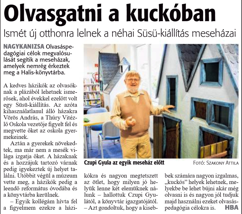 Nyilvános 1365 | 2829 | Zalai Hírlap 2020. június 17. 140. szám 16. oldal | Olvasgatni a kuckóban Ismét új otthonra lelnek a néhai Süsü-kiállítás meseházai NAGYKANIZSA Olvasáspedagógiai célok megvalósulását segítik a meseházak, amelyek nemrég érkeztek meg a Halis-könyvtárba. A kedves házikók az olvasóknak a plázából lehetnek ismerősek, ahol évekkel ezelőtt volt egy Süsü-kiállítás. Az azóta kihasználatlanul álló házakra Vörös András, a Thúry Vitézlő Oskola vezetője figyelt fel és megvette őket az oskola gyermekeinek. Aztán a gyerekek növekedtek, ma már nem a mesék világa izgatja őket. A házaknak és a hozzájuk tartozó várnak pedig igyekeztek új helyet találni. Utóbbit végül a múzeum vette meg, a házikók pedig a leendő református óvodába és a könyvtárba kerülnek. - Egyik kollégám hívta fel a figyelmem ezekre a házikókra és nagyon megtetszett az ötlet, hogy milyen jó helyük lenne két elemüknek nálunk - hallottuk Czupi Gyulától, a könyvtár igazgatójától. - Azt gondoltuk, hogy a kisebbek számára nagyon izgalmas, „kuckós" helyek lehetnek, melyekbe be lehet bújni akár még olvasni is és nagyon jól tudjuk majd használni ezeket olvasáspedagógia célokra is. HBA |