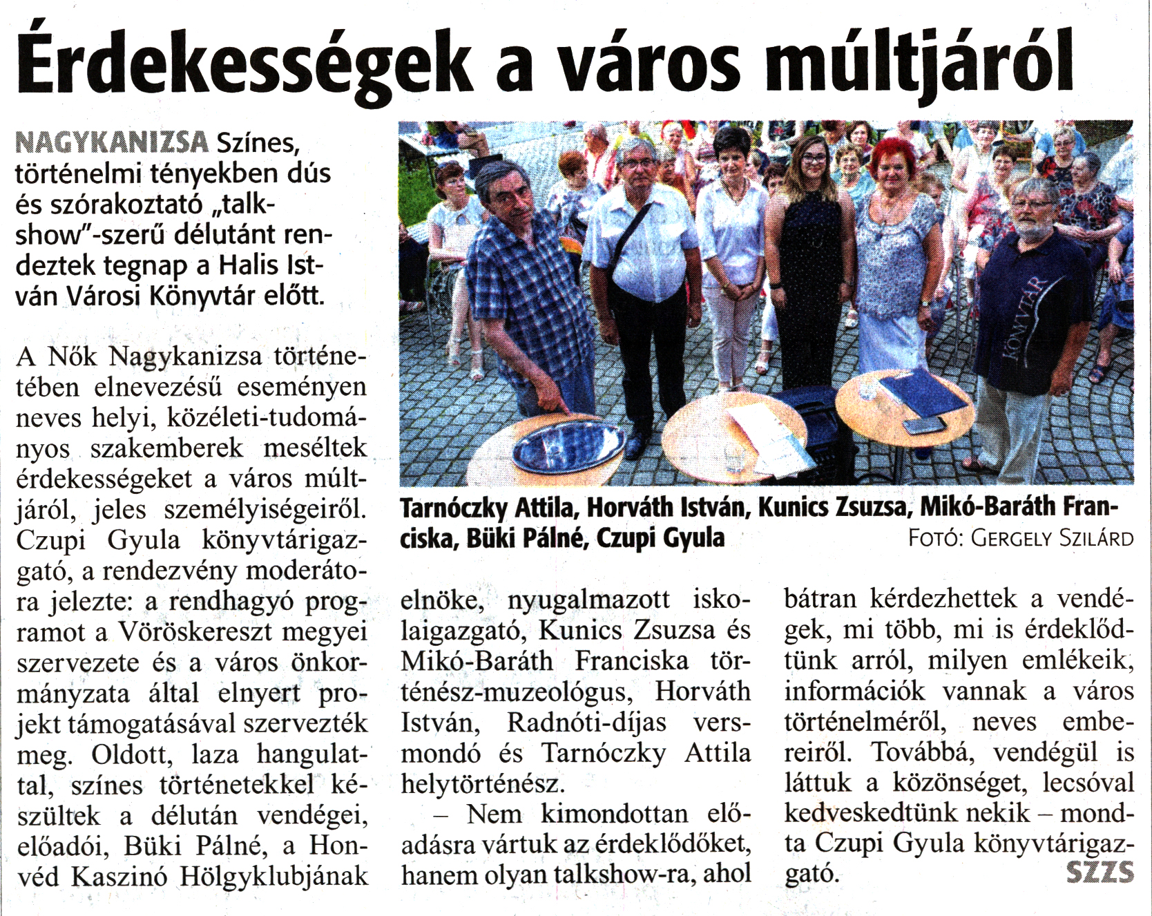 Nyilvános 1285 | 2033 | Zalai Hírlap 2020. július 30. 177. szám 16. oldal | Érdekességek a város múltjáról Tarnóczky Attila, Horváth István, Kunics Zsuzsa, Mikó-Baráth Franciska, Büki Pálné, Czupi Gyula Fotó: Gergely Szilárd NAGYKANIZSA Színes, történelmi tényekben dús és szórakoztató „talk-show"-szerű délutánt rendeztek tegnap a Halis István Városi Könyvtár előtt. A Nők Nagykanizsa történetében elnevezésű eseményen neves helyi, közéleti-tudományos szakemberek meséltek érdekességeket a város múltjáról, jeles személyiségeiről. Czupi Gyula könyvtárigazgató, a rendezvény moderátora jelezte: a rendhagyó programot a Vöröskereszt megyei szervezete és a város önkormányzata által elnyert projekt támogatásával szervezték meg. Oldott, laza hangulattal, színes történetekkel készültek a délután vendégei, előadói, Büki Pálné, a Honvéd Kaszinó Hölgyklubjának elnöke, nyugalmazott iskolaigazgató, Kunics Zsuzsa és Mikó-Baráth Franciska történész-muzeológus, Horváth István, Radnóti-díjas versmondó és Tarnóczky Attila helytörténész. - Nem kimondottan előadásra vártuk az érdeklődőket, hanem olyan talkshow-ra, ahol bátran kérdezhettek a vendégek, mi több, mi is érdeklődtünk arról, milyen emlékeik, információk vannak a város történelméről, neves embereiről. Továbbá, vendégül is láttuk a közönséget, lecsóval kedveskedtünk nekik - mondta Czupi Gyula könyvtárigazgató. szzs |