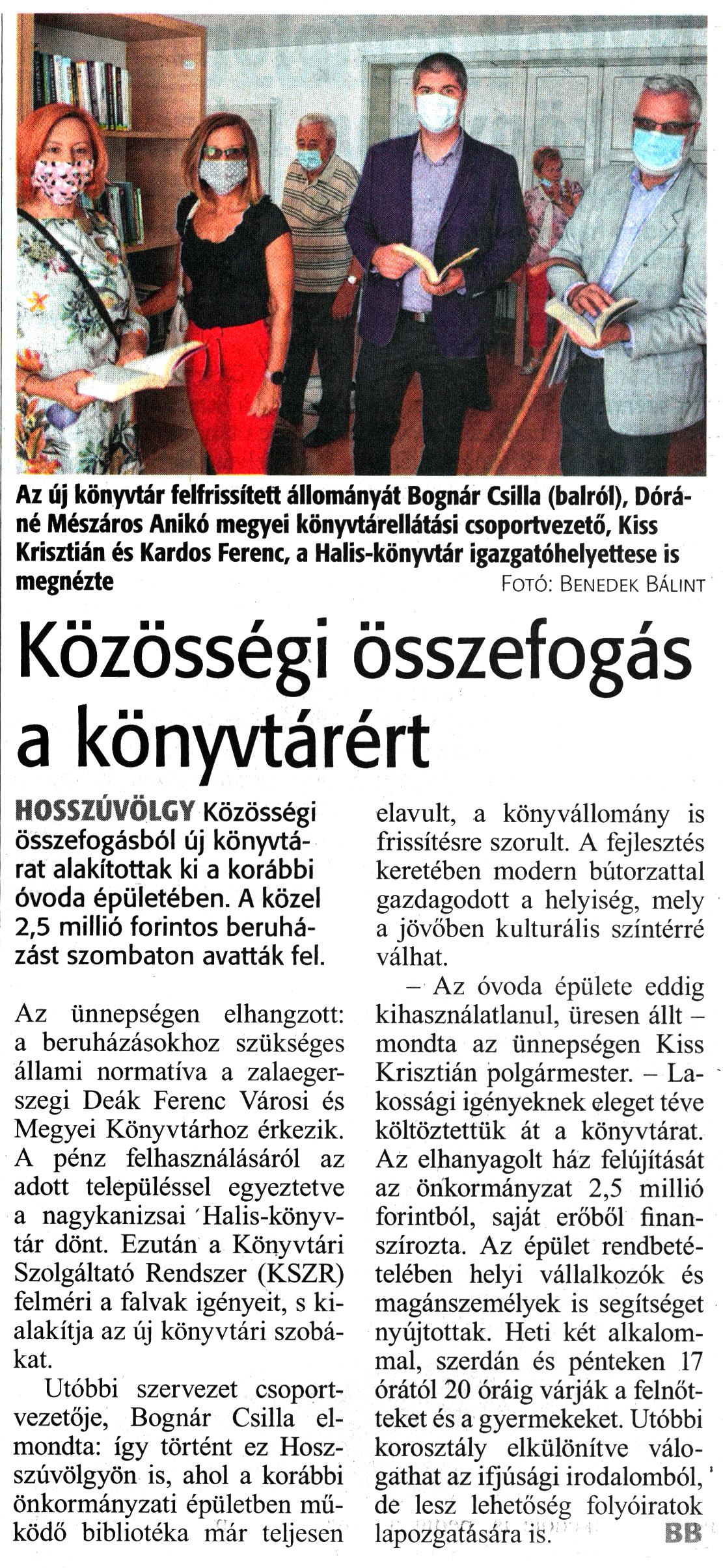 Nyilvános 1166 | 1743 | Zalai Hírlap 2020. szeptember 21. 221. szám 6. oldal | Közösségi összefogás a könyvtárért HOSSZÚVÖLGY Közösségi összefogásból új könyvtárat alakítottak ki a korábbi óvoda épületében. A közel 2,5 millió forintos beruházást szombaton avatták fel. Az ünnepségen elhangzott: a beruházásokhoz szükséges állami normatíva a zalaegerszegi Deák Ferenc Városi és Megyei Könyvtárhoz érkezik. A pénz felhasználásáról az adott településsel egyeztetve a nagykanizsai Halis-könyvtár dönt. Ezután a Könyvtári Szolgáltató Rendszer (KSZR) felméri a falvak igényeit, s kialakítja az új könyvtári szobákat. Utóbbi szervezet csoportvezetője, Bognár Csilla elmondta: így történt ez Hosszúvölgyön is, ahol a korábbi önkormányzati épületben működő bibliotéka már teljesen elavult, a könyvállomány is frissítésre szorult. A fejlesztés keretében modern bútorzattal gazdagodott a helyiség, mely a jövőben kulturális színtérré válhat. - Az óvoda épülete eddig kihasználatlanul, üresen állt -mondta az ünnepségen Kiss Krisztián polgármester. - Lakossági igényeknek eleget téve költöztettük át a könyvtárat. Az elhanyagolt ház felújítását az önkormányzat 2,5 millió forintból, saját erőből finanszírozta. Az épület rendbetételében helyi vállalkozók és magánszemélyek is segítséget nyújtottak. Heti két alkalommal, szerdán és pénteken 17 órától 20 óráig várják a felnőtteket és a gyermekeket. Utóbbi korosztály elkülönítve válogathat az ifjúsági irodalomból, de lesz lehetőség folyóiratok lapozgatására is. BB Az új könyvtár felfrissített állományát Bognár Csilla (balról), Dóráné Mészáros Anikó megyei könyvtárellátási csoportvezető, Kiss Krisztián és Kardos Ferenc, a Halis-könyvtár igazgatóhelyettese is megnézte Fotó: Benedek Bálint |