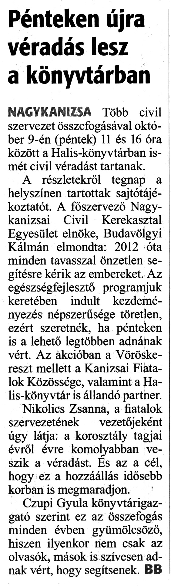 Nyilvános 1365 | 1967 | Zalai Hírlap 2020. október 6. 234. szám 3. oldal | Pénteken újra véradás lesz a könyvtárban NAGYKANIZSA Több civil szervezet összefogásával október 9-én (péntek) 11 és 16 óra között a Halis-könyvtárban ismét civil véradást tartanak. A részletekről tegnap a helyszínen tartottak sajtótájékoztatót. A főszervező Nagykanizsai Civil Kerekasztal Egyesület elnöke, Budavölgyi Kálmán elmondta: 2012 óta minden tavasszal önzetlen segítésre kérik az embereket. Az egészségfejlesztő programjuk keretében indult kezdeményezés népszerűsége töretlen, ezért szeretnék, ha pénteken is a lehető legtöbben adnának vért. Az akcióban a Vöröskereszt mellett a Kanizsai Fiatalok Közössége, valamint a Halis-könyvtár is állandó partner. Nikolics Zsanna, a fiatalok szervezetének vezetőjeként úgy látja: a korosztály tagjai évről évre komolyabban veszik a véradást. És az a cél, hogy ez a hozzáállás idősebb korban is megmaradjon. Czupi Gyula könyvtárigazgató szerint ez az összefogás minden évben gyümölcsöző, hiszen ilyenkor nem csak az olvasók, mások is szívesen adnak vért, hogy segítsenek. BB |