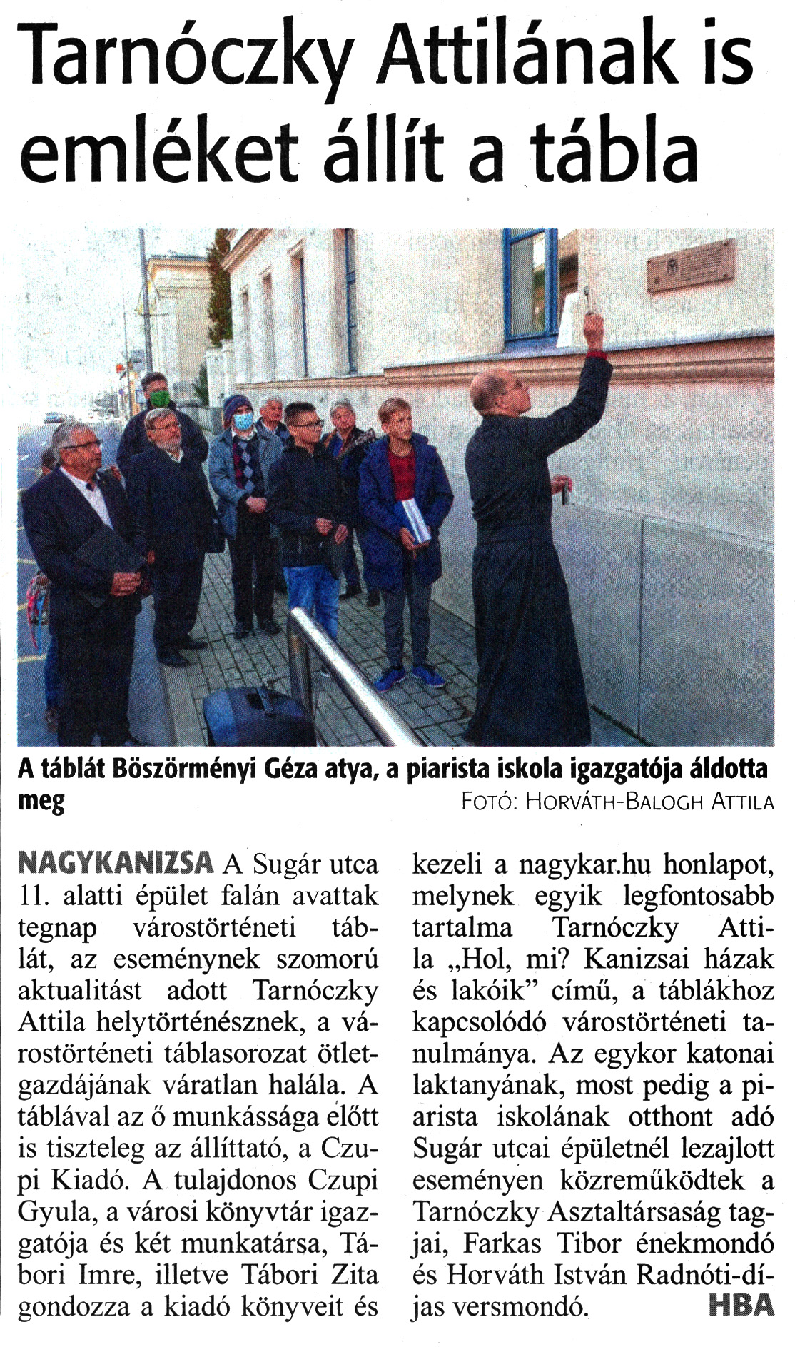 Nyilvános 1236 | 2112 | Zalai Hírlap 2020. október 22. 248. szám 1. oldal | Tarnóczky Attilának is emléket állít a tábla A táblát Böszörményi Géza atya, a piarista iskola igazgatója áldotta meg Fotó: Horváth-Balogh Attila NAGYKANIZSA A Sugár utca 11. alatti épület falán avattak tegnap várostörténeti táblát, az eseménynek szomorú aktualitást adott Tarnóczky Attila helytörténésznek, a várostörténeti táblasorozat ötletgazdájának váratlan halála. A táblával az ő munkássága előtt is tiszteleg az állíttató, a Czupi Kiadó. A tulajdonos Czupi Gyula, a városi könyvtár igazgatója és két munkatársa, Tábori Imre, illetve Tábori Zita gondozza a kiadó könyveit és kezeli a nagykar.hu honlapot, melynek egyik legfontosabb tartalma Tarnóczky Attila „Hol, mi? Kanizsai házak és lakóik" című, a táblákhoz kapcsolódó várostörténeti tanulmánya. Az egykor katonai laktanyának, most pedig a piarista iskolának otthont adó Sugár utcai épületnél lezajlott eseményen közreműködtek a Tarnóczky Asztaltársaság tagjai, Farkas Tibor énekmondó és Horváth István Radnóti-díjas versmondó. HBA |