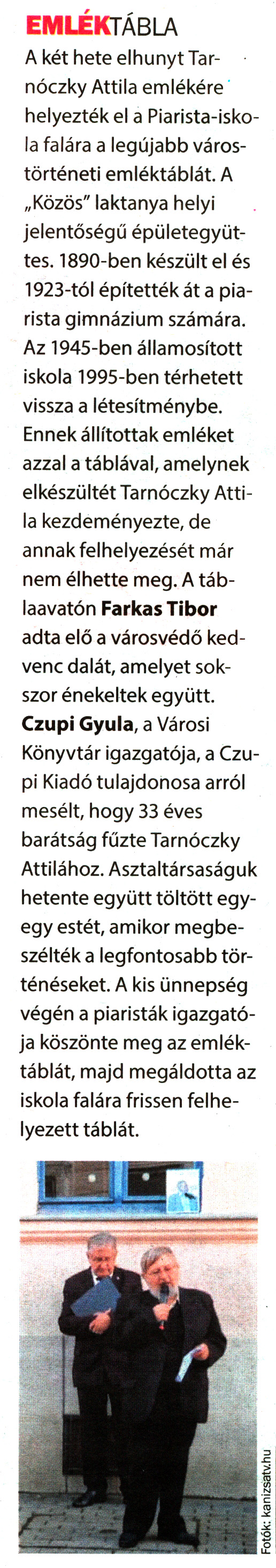Nyilvános 1309 | 1886 | Kanizsa 2020. október 24. 38. szám 3. oldal | EMLÉKTÁBLA A két hete elhunyt Tarnóczky Attila emlékére helyezték el a Piarista-iskola falára a legújabb várostörténeti emléktáblát. A „Közös" laktanya helyi jelentőségű épületegyüttes. 1890-ben készült el és 1923-tól építették át a piarista gimnázium számára. Az 1945-ben államosított iskola 1995-ben térhetett vissza a létesítménybe. Ennek állítottak emléket azzal a táblával, amelynek elkészültét Tarnóczky Attila kezdeményezte, de annak felhelyezését már nem élhette meg. A táb-laavatón Farkas Tibor adta elő a városvédő kedvenc dalát, amelyet sokszor énekeltek együtt. Czupi Gyula, a Városi Könyvtár igazgatója, a Czupi Kiadó tulajdonosa arról mesélt, hogy 33 éves barátság fűzte Tarnóczky Attilához. Asztaltársaságuk hetente együtt töltött egy-egy estét, amikor megbeszélték a legfontosabb történéseket. A kis ünnepség végén a piaristák igazgatója köszönte meg az emléktáblát, majd megáldotta az iskola falára frissen felhelyezett táblát. |