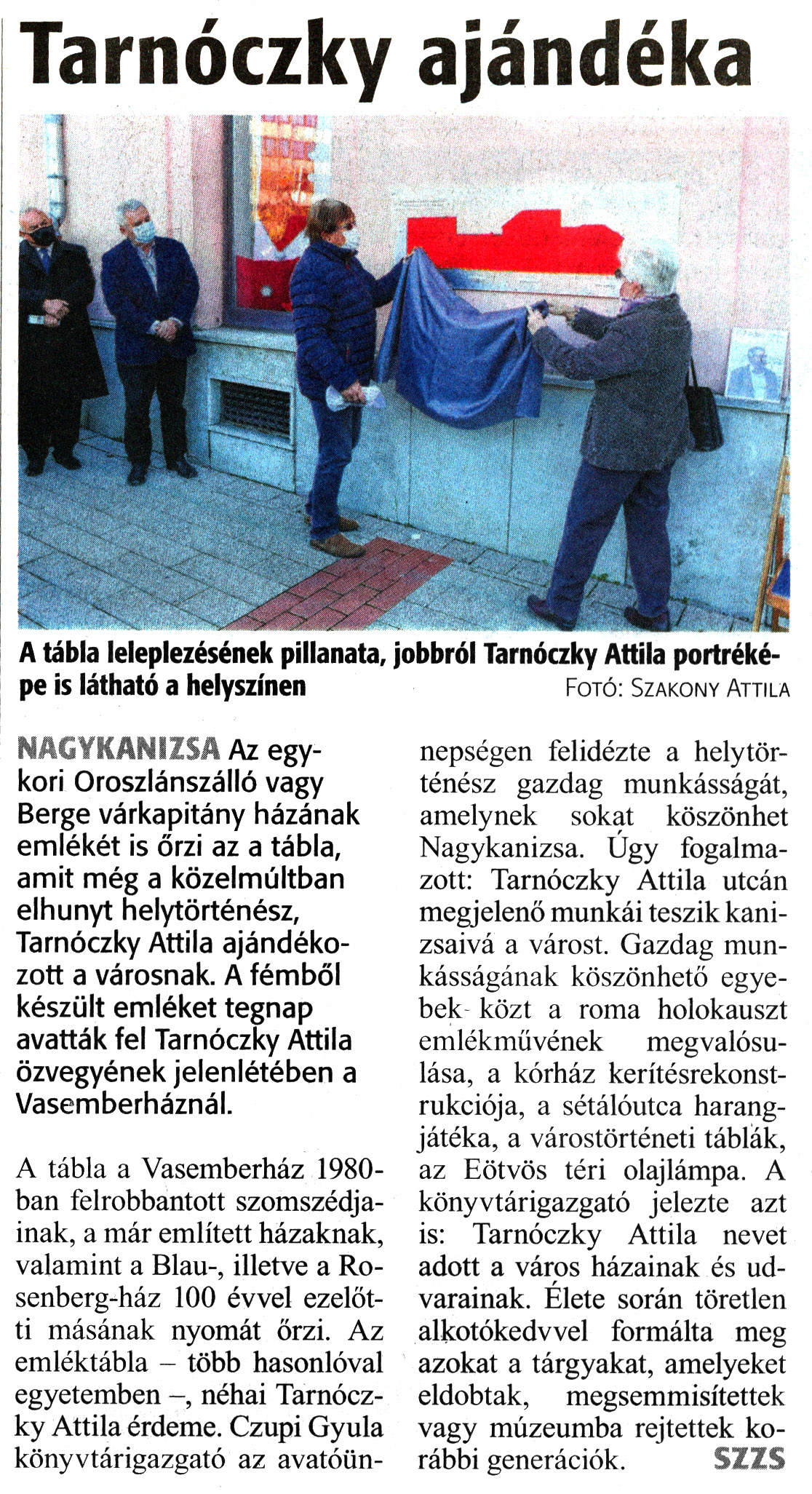 Nyilvános 1136 | 1548 | Zalai Hírlap 2020. november 7. 261. szám 1. oldal | Tarnóczky ajándéka A tábla leleplezésének pillanata, jobbról Tarnóczky Attila portréképe is látható a helyszínen Fotó: Szakony Attila NAGYKANIZSA Az egykori Oroszlánszálló vagy Berge várkapitány házának emlékét is őrzi az a tábla, amit még a közelmúltban elhunyt helytörténész, Tarnóczky Attila ajándékozott a városnak. A fémből készült emléket tegnap avatták fel Tarnóczky Attila özvegyének jelenlétében a Vasemberháznál. A tábla a Vasemberház 1980-ban felrobbantott szomszédjainak, a már említett házaknak, valamint a Blau-, illetve a Rosenberg-ház 100 évvel ezelőtti másának nyomát őrzi. Az emléktábla - több hasonlóval egyetemben -, néhai Tarnóczky Attila érdeme. Czupi Gyula könyvtárigazgató az avatóünnepségen felidézte a helytörténész gazdag munkásságát, amelynek sokat köszönhet Nagykanizsa. Úgy fogalmazott: Tarnóczky Attila utcán megjelenő munkái teszik kanizsaivá a várost. Gazdag munkásságának köszönhető egyebek közt a roma holokauszt emlékmüvének megvalósulása, a kórház kerítésrekonstrukciója, a sétálóutca harangjátéka, a várostörténeti táblák, az Eötvös téri olajlámpa. A könyvtárigazgató jelezte azt is: Tarnóczky Attila nevet adott a város házainak és udvarainak. Elete során töretlen alkotókedvvel formálta meg azokat a tárgyakat, amelyeket eldobtak, megsemmisítettek vagy múzeumba rejtettek korábbi generációk. SZZS |