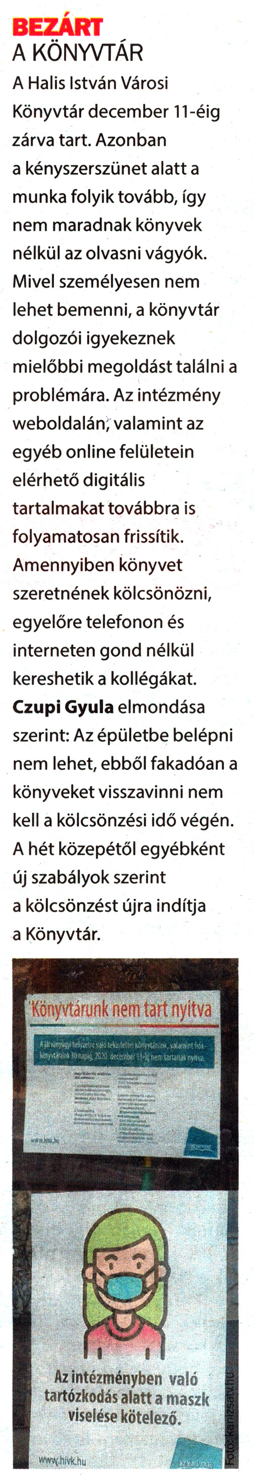 Nyilvános 1274 | 1791 | Kanizsa 2020. november 20. 42. szám 3. oldal | BEZÁRT A KÖNYVTÁR A Halis István Városi Könyvtár december 11-éig zárva tart. Azonban a kényszerszünet alatt a munka folyik tovább, így nem maradnak könyvek nélkül az olvasni vágyók. Mivel személyesen nem lehet bemenni, a könyvtár dolgozói igyekeznek mielőbbi megoldást találni a problémára. Az intézmény weboldalán; valamint az egyéb online felületein elérhető digitális tartalmakat továbbra is folyamatosan frissítik. Amennyiben könyvet szeretnének kölcsönözni, egyelőre telefonon és interneten gond nélkül kereshetik a kollégákat. Czupi Gyula elmondása szerint: Az épületbe belépni nem lehet, ebből fakadóan a könyveket visszavinni nem kell a kölcsönzési idő végén. A hét közepétől egyébként új szabályok szerint a kölcsönzést újra indítja a Könyvtár. |