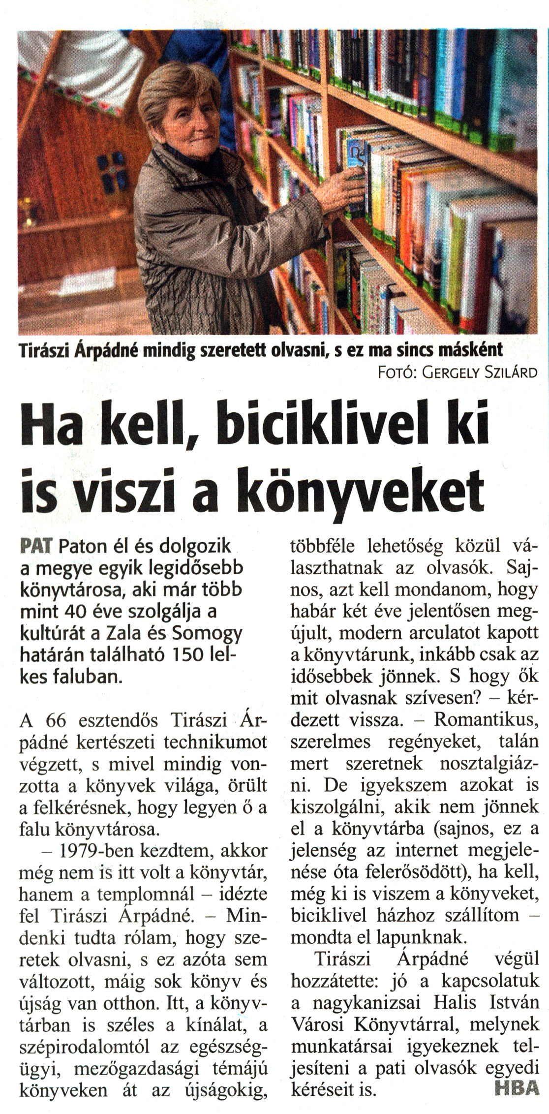 Nyilvános 1217 | 1677 | Zalai Hírlap 2020. december 28. 302. szám 5. oldal | Fotó: Gergely Szilárd Ha kell, biciklivel ki is viszi a könyveket Tirászi Árpádné mindig szeretett olvasni, s ez ma sincs másként PAT Paton él és dolgozik a megye egyik legidősebb könyvtárosa, aki már több mint 40 éve szolgálja a kultúrát a Zala és Somogy határán található 150 lelkes faluban. A 66 esztendős Tirászi Árpádné kertészeti technikumot végzett, s mivel mindig vonzotta a könyvek világa, örült a felkérésnek, hogy legyen ő a falu könyvtárosa. - 1979-ben kezdtem, akkor még nem is itt volt a könyvtár, hanem a templomnál - idézte fel Tirászi Arpádné. - Mindenki tudta rólam, hogy szeretek olvasni, s ez azóta sem változott, máig sok könyv és újság van otthon. Itt, a könyvtárban is széles a kínálat, a szépirodalomtól az egészségügyi, mezőgazdasági témájú könyveken át az újságokig, többféle lehetőség közül választhatnak az olvasók. Sajnos, azt kell mondanom, hogy habár két éve jelentősen megújult, modern arculatot kapott a könyvtárunk, inkább csak az idősebbek jönnek. S hogy ők mit olvasnak szívesen? - kérdezett vissza. - Romantikus, szerelmes regényeket, talán mert szeretnek nosztalgiázni. De igyekszem azokat is kiszolgálni, akik nem jönnek el a könyvtárba (sajnos, ez a jelenség az internet megjelenése óta felerősödött), ha kell, még ki is viszem a könyveket, biciklivel házhoz szállítom - mondta el lapunknak. Tirászi Arpádné végül hozzátette: jó a kapcsolatuk a nagykanizsai Halis István Városi Könyvtárral, melynek munkatársai igyekeznek teljesíteni a pati olvasók egyedi kéréseit is. HBA |