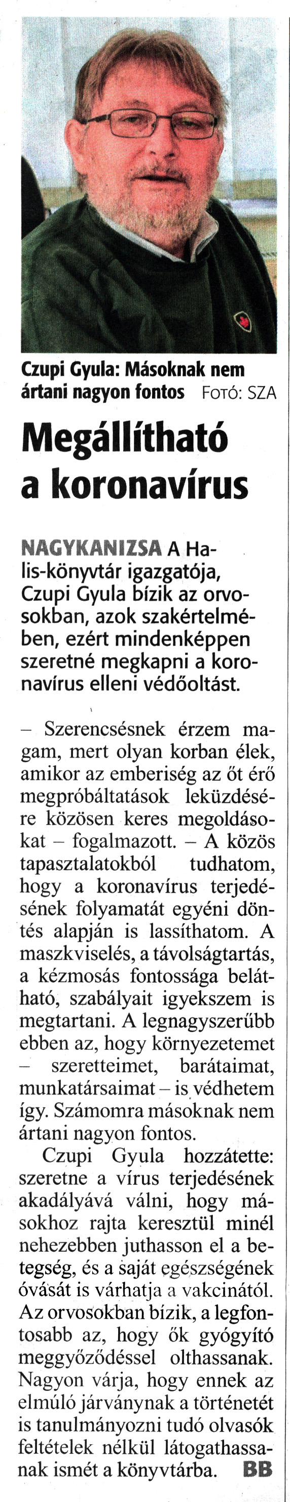 Nyilvános 1732 | 1601 | Zalai Hírlap 2021. február 5. 30. szám 3. oldal | Czupi Gyula: Másoknak nem ártani nagyon fontos Fotó: SZA Megállítható a koronavírus NAGYKANIZSA A Halis-könyvtár igazgatója, Czupi Gyula bízik az orvosokban, azok szakértelmében, ezért mindenképpen szeretné megkapni a koronavírus elleni védőoltást. - Szerencsésnek érzem magam, mert olyan korban élek, amikor az emberiség az őt érő megpróbáltatások leküzdésére közösen keres megoldásokat - fogalmazott. - A közös tapasztalatokból tudhatom, hogy a koronavírus terjedésének folyamatát egyéni döntés alapján is lassíthatom. A maszkviselés, a távolságtartás, a kézmosás fontossága belátható, szabályait igyekszem is megtartani. A legnagyszerűbb ebben az, hogy környezetemet - szeretteimet, barátaimat, munkatársaimat - is védhetem így. Számomra másoknak nem ártani nagyon fontos. Czupi Gyula hozzátette: szeretne a vírus terjedésének akadályává válni, hogy másokhoz rajta keresztül minél nehezebben juthasson el a betegség, és a saját egészségének óvását is várhatja a vakcinától. Az orvosokban bízik, a legfontosabb az, hogy ők gyógyító meggyőződéssel olthassanak. Nagyon várja, hogy ennek az elmúló járványnak a történetét is tanulmányozni tudó olvasók feltételek nélkül látogathassanak ismét a könyvtárba. BB |