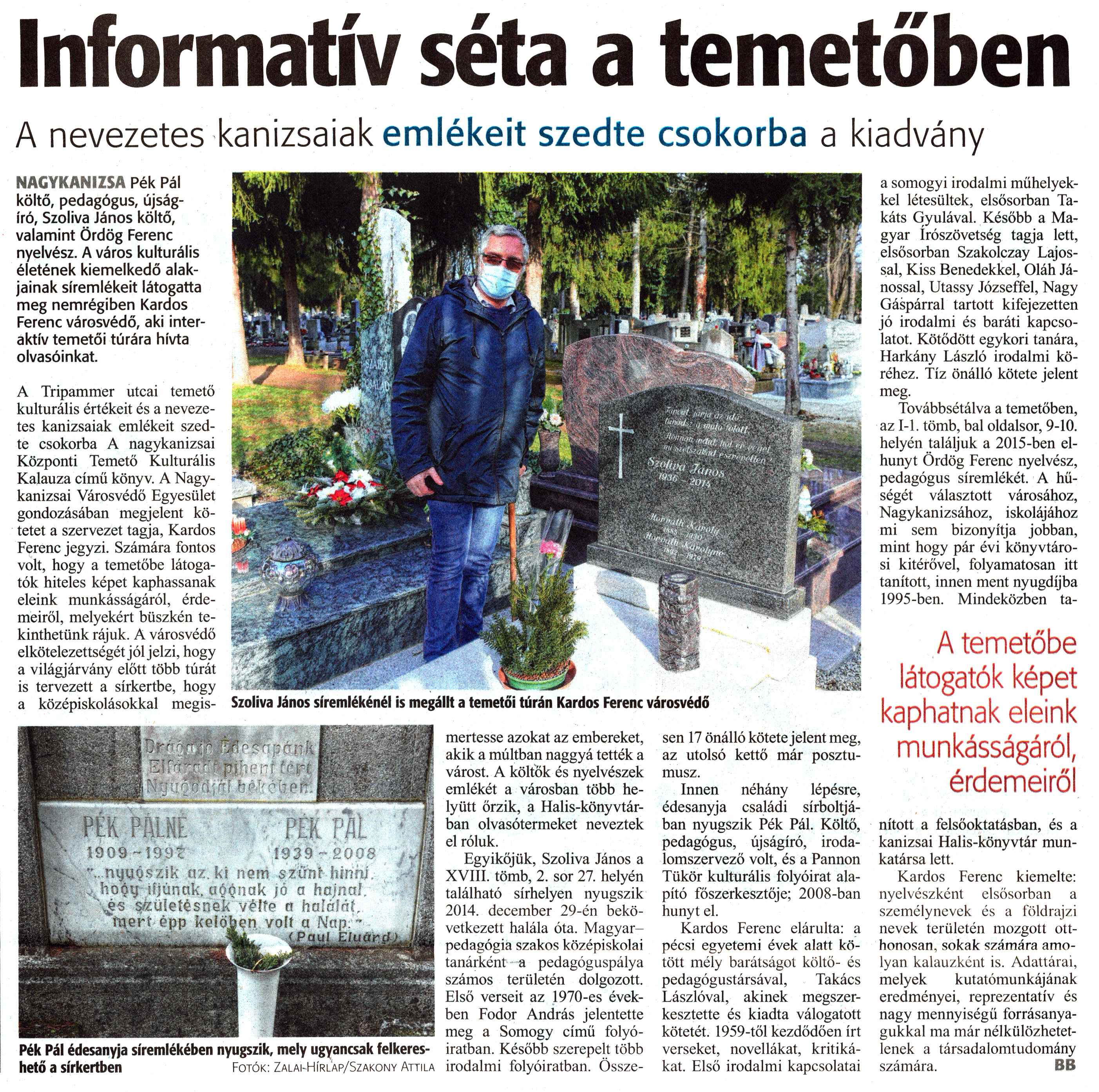 Nyilvános 1151 | 1483 | Zalai Hírlap 2021. április 7. 79. szám 10. oldal | Informatív séta a temetőben A nevezetes kanizsaiak emlékeit szedte csokorba a kiadvány NAGYKANIZSA Pék Pál költő, pedagógus, újságíró, Szoliva János költő, valamint Ördög Ferenc nyelvész. A város kulturális életének kiemelkedő alakjainak síremlékeit látogatta meg nemrégiben Kardos Ferenc városvédő, aki interaktív temetői túrára hívta olvasóinkat. A Tripammer utcai temető kulturális értékeit és a nevezetes kanizsaiak emlékeit szedte csokorba A nagykanizsai Központi Temető Kulturális Kalauza című könyv. A Nagykanizsai Városvédő Egyesület gondozásában megjelent kötetet a szervezet tagja, Kardos Ferenc jegyzi. Számára fontos volt, hogy a temetőbe látogatók hiteles képet kaphassanak eleink munkásságáról, érdemeiről, melyekért büszkén tekinthetünk rájuk. A városvédő elkötelezettségét jól jelzi, hogy a világjárvány előtt több túrát is tervezett a sírkertbe, hogy a középiskolásokkal megismertesse azokat az embereket, akik a múltban naggyá tették a várost. A költők és nyelvészek emlékét a városban több helyütt őrzik, a Halis-könyvtárban olvasótermeket neveztek el róluk. Egyikőjük, Szoliva János a XVIII. tömb, 2. sor 27. helyén található sírhelyen nyugszik 2014. december 29-én bekövetkezett halála óta. Magyarpedagógia szakos középiskolai tanárként a pedagóguspálya számos területén dolgozott. Első verseit az 1970-es években Fodor András jelentette meg a Somogy című folyóiratban. Később szerepelt több irodalmi folyóiratban. Összesen 17 önálló kötete jelent meg, az utolsó kettő már posztumusz. Innen néhány lépésre, édesanyja családi sírboltjában nyugszik Pék Pál. Költő, pedagógus, újságíró, irodalomszervező volt, és a Pannon Tükör kulturális folyóirat alapító főszerkesztője; 2008-ban hunyt el. Kardos Ferenc elárulta: a pécsi egyetemi évek alatt kötött mély barátságot költő- és pedagógustársával, Takács Lászlóval, akinek megszerkesztette és kiadta válogatott kötetét. 1959-től kezdődően írt verseket, novellákat, kritikákat. Első irodalmi kapcsolatai a somogyi irodalmi műhelyekkel létesültek, elsősorban Ta-káts Gyulával. Később a Magyar írószövetség tagja lett, elsősorban Szakolczay Lajossal, Kiss Benedekkel, Oláh Jánossal, Utassy Józseffel, Nagy Gáspárral tartott kifejezetten jó irodalmi és baráti kapcsolatot. Kötődött egykori tanára, Harkány László irodalmi köréhez. Tíz önálló kötete jelent meg. Továbbsétálva a temetőben, az 1-1. tömb, bal oldalsor, 9-10. helyén találjuk a 2015-ben elhunyt Ördög Ferenc nyelvész, pedagógus síremlékét. A hűségét választott városához, Nagykanizsához, iskolájához mi sem bizonyítja jobban, mint hogy pár évi könyvtárosi kitérővel, folyamatosan itt tanított, innen ment nyugdíjba 1995-ben. Mindeközben tanított a felsőoktatásban, és a kanizsai Halis-könyvtár munkatársa lett. Kardos Ferenc kiemelte: nyelvészként elsősorban a személynevek és a földrajzi nevek területén mozgott otthonosan, sokak számára amolyan kalauzként is. Adattárai, melyek kutatómunkájának eredményei, reprezentatív és nagy mennyiségű forrásanyagukkal ma már nélkülözhetetlenek a társadalomtudomány számára. BB Szoliva János síremlékénél is megállt a temetői túrán Kardos Ferenc városvédő Pék Pál édesanyja síremlékében nyugszik, mely ugyancsak felkereshető a sírkertben Fotók: Zalai-Hírl''ap/Szakony Attila |
