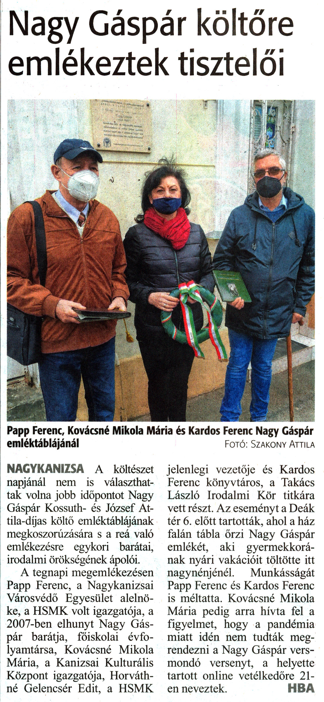 Nyilvános 1231 | 1653 | Zalai Hírlap 2021. április 12. 83. szám 3. oldal | Nagy Gáspár költőre emlékeztek tisztelői Papp Ferenc, Kovácsné Mikola Mária és Kardos Ferenc Nagy Gáspár emléktáblájánál Fotó: Szakony Attila NAGYKANIZSA A költészet napjánál nem is választhattak volna jobb időpontot Nagy Gáspár Kossuth- és József Attila-díjas költő emléktáblájának megkoszorúzására s a reá való emlékezésre egykori barátai, irodalmi örökségének ápolói. A tegnapi megemlékezésen Papp Ferenc, a Nagykanizsai Városvédő Egyesület alelnöke, a HSMK volt igazgatója, a 2007-ben elhunyt Nagy Gáspár barátja, főiskolai évfolyamtársa, Kovácsné Mikola Mária, a Kanizsai Kulturális Központ igazgatója, Horváthné Gelencsér Edit, a HSMK jelenlegi vezetője és Kardos Ferenc könyvtáros, a Takács László Irodalmi Kör titkára vett részt. Az eseményt a Deák tér 6. előtt tartották, ahol a ház falán tábla őrzi Nagy Gáspár emlékét, aki gyermekkorának nyári vakációit töltötte itt nagynénjénél. Munkásságát Papp Ferenc és Kardos Ferenc is méltatta. Kovácsné Mikola Mária pedig arra hívta fel a figyelmet, hogy a pandémia miatt idén nem tudták megrendezni a Nagy Gáspár versmondó versenyt, a helyette tartott online vetélkedőre 21-en neveztek. HBA |