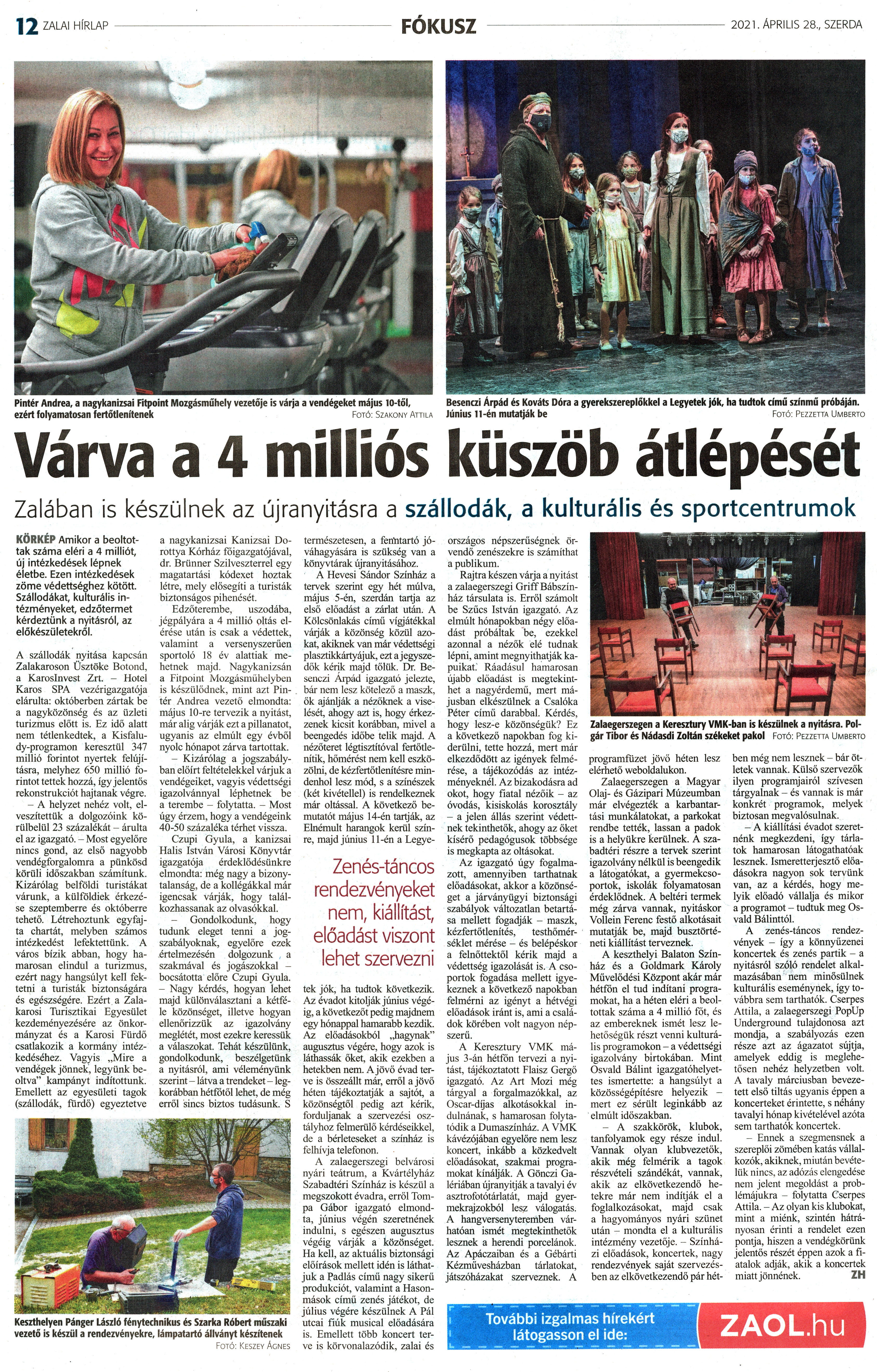 Nyilvános 1318 | 2044 | Zalai Hírlap 2021. április 28. 97. szám 12. oldal | Várva a 4 milliós küszöb átlépését Zalában is készülnek az újranyitásra a szállodák, a kulturális és sportcentrumok KÖRKÉP Amikor a beoltottak száma eléri a 4 milliót, új intézkedések lépnek életbe. Ezen intézkedések zöme védettséghez kötött. Szállodákat, kulturális intézményeket, edzőtermet kérdeztünk a nyitásról, az előkészületekről. A szállodák nyitása kapcsán Zalakaroson Üsztöke Botond, a Karoslnvest Zrt. - Hotel Karos SPA vezérigazgatója elárulta: októberben zártak be a nagyközönség és az üzleti turizmus előtt is. Ez idő alatt nem tétlenkedtek, a Kisfaludy-programon keresztül 347 millió forintot nyertek felújításra, melyhez 650 millió forintot tettek hozzá, így jelentős rekonstrukciót hajtanak végre. - A helyzet nehéz volt, elveszítettük a dolgozóink körülbelül 23 százalékát - árulta el az igazgató. - Most egyelőre nincs gond, az első nagyobb vendégforgalomra a pünkösd körüli időszakban számítunk. Kizárólag belföldi turistákat várunk, a külföldiek érkezése szeptemberre és októberre tehető. Létrehoztunk egyfajta chartát, melyben számos intézkedést lefektettünk. A város bízik abban, hogy hamarosan elindul a turizmus, ezért nagy hangsúlyt kell fektetni a turisták biztonságára és egészségére. Ezért a Zalakarosi Turisztikai Egyesület kezdeményezésére az önkormányzat és a Karosi Fürdő csatlakozik a kormány intézkedéséhez. Vagyis „Mire a vendégek jönnek, legyünk beoltva" kampányt indítottunk. Emellett az egyesületi tagok (szállodák, fürdő) egyeztetve a nagykanizsai Kanizsai Dorottya Kórház főigazgatójával, dr. Brünner Szilveszterrel egy magatartási kódexet hoztak létre, mely elősegíti a turisták biztonságos pihenését. Edzőterembe, uszodába, jégpályára a 4 millió oltás elérése után is csak a védettek, valamint a versenyszerűen sportoló 18 év alattiak mehetnek majd. Nagykanizsán a Fitpoint Mozgásmühelyben is készülődnek, mint azt Pintér Andrea vezető elmondta: május 10-re tervezik a nyitást, már alig várják ezt a pillanatot, ugyanis az elmúlt egy évből nyolc hónapot zárva tartottak. - Kizárólag a jogszabályban előírt feltételekkel várjuk a vendégeiket, vagyis védettségi igazolvánnyal léphetnek be a terembe - folytatta. - Most úgy érzem, hogy a vendégeink 40-50 százaléka térhet vissza. Czupi Gyula, a kanizsai Halis István Városi Könyvtár igazgatója érdeklődésünkre elmondta: még nagy a bizonytalanság, de a kollégákkal már igencsak várják, hogy találkozhassanak az olvasókkal. - Gondolkodunk, hogy tudunk eleget tenni a jogszabályoknak, egyelőre ezek értelmezésén dolgozunk a szakmával és jogászokkal - bocsátotta előre Czupi Gyula. - Nagy kérdés, hogyan lehet majd különválasztani a kétféle közönséget, illetve hogyan ellenőrizzük az igazolvány meglétét, most ezekre keressük a válaszokat. Tehát készülünk, gondolkodunk, beszélgetünk a nyitásról, ami véleményünk szerint - látva a trendeket - legkorábban hétfőtől lehet, de még erről sincs biztos tudásunk. S természetesen, a fenntartó jóváhagyására is szükség van a könyvtárak újranyitásához. A Hevesi Sándor Színház a tervek szerint egy hét múlva, május 5-én, szerdán tartja az első előadást a zárlat után. A Kölcsönlakás című vígjátékkal várják a közönség közül azokat, akiknek van már védettségi plasztikkártyájuk, ezt a jegyszedők kérik majd tőlük. Dr. Besenczi Árpád igazgató jelezte, bár nem lesz kötelező a maszk, ők ajánlják a nézőknek a viselését, ahogy azt is, hogy érkezzenek kicsit korábban, mivel a beengedés időbe telik majd. A nézőteret légtisztítóval fertőtlenítik, hőmérést nem kell eszközölni, de kézfertőtlenítésre mindenhol lesz mód, s a színészek (két kivétellel) is rendelkeznek már oltással. A következő bemutatót május 14-én tartják, az Elnémult harangok kerül színre, majd június 11-én a Legyetek jók, ha tudtok következik. Az évadot kitolják június végéig, a következőt pedig majdnem egy hónappal hamarabb kezdik. Az előadásokból „hagynak" augusztus végére, hogy azok is láthassák őket, akik ezekben a hetekben nem. A jövő évad terve is összeállt már, erről a jövő héten tájékoztatják a sajtót, a közönségtől pedig azt kérik, forduljanak a szervezési osztályhoz felmerülő kérdéseikkel, de a bérleteseket a színház is felhívja telefonon. A zalaegerszegi belvárosi nyári teátrum, a Kvártélyház Szabadtéri Színház is készül a megszokott évadra, erről Tompa Gábor igazgató elmondta, június végén szeretnének indulni, s egészen augusztus végéig várják a közönséget. Ha kell, az aktuális biztonsági előírások mellett idén is láthatjuk a Padlás című nagy sikerű produkciót, valamint a Hasonmások című zenés játékot, de július végére készülnek A Pál utcai fiúk musical előadására is. Emellett több koncert terve is körvonalazódik, zalai és országos népszerűségnek örvendő zenészekre is számíthat a publikum. Rajtra készen várja a nyitást a zalaegerszegi Griff Bábszínház társulata is. Erről számolt be Szűcs István igazgató. Az elmúlt hónapokban négy előadást próbáltak be, ezekkel azonnal a nézők élé tudnak lépni, amint megnyithatják kapuikat." Ráadásul hamarosan újabb előadást is megtekinthet a nagyérdemű, mert májusban elkészülnek a Csalóka Péter című darabbal. Kérdés, hogy lesz-e közönségük? Ez a következő napokban fog kiderülni, tette hozzá, mert már elkezdődött az igények felmérése, a tájékozódás az intézményeknél. Az bizakodásra ad okot, hogy fiatal nézőik - az óvodás, kisiskolás korosztály - a jelen állás szerint védettnek t