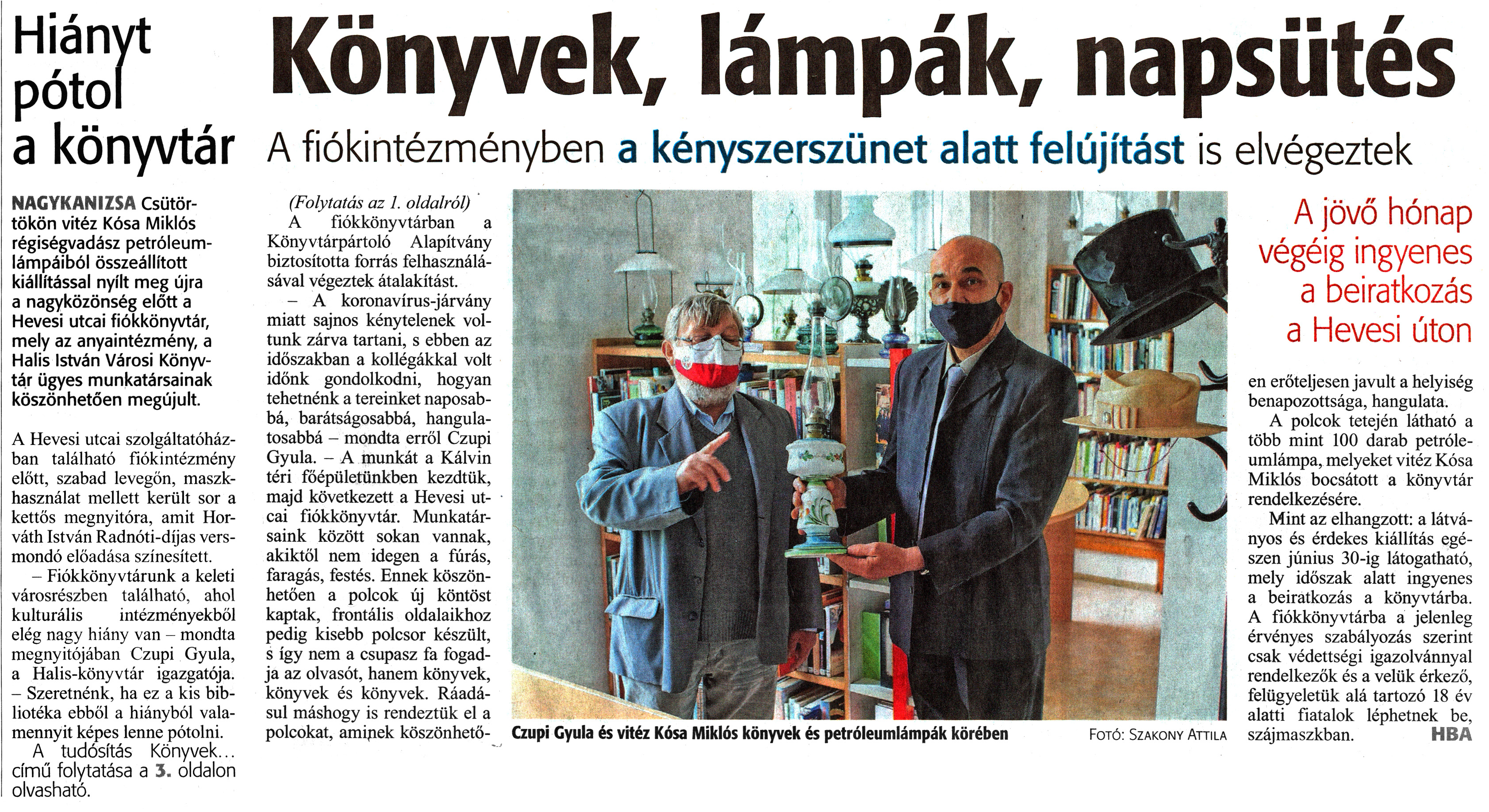 Nyilvános 1195 | 1985 | Zalai Hírlap 2021. május 21. 116. szám 1, 3. oldal | Hiányt pótol a könyvtár Könyvek, lámpák, napsütés NAGYKANIZSA Csütörtökön vitéz Kósa Miklós régiségvadász petróleumlámpáiból összeállított kiállítással nyílt meg újra a nagyközönség előtt a Hevesi utcai fiókkönyvtár, mely az anyaintézmény, a Halis István Városi Könyvtár ügyes munkatársainak köszönhetően megújult. A Hevesi utcai szolgáltatóházban található fiókintézmény előtt, szabad levegőn, maszkhasználat mellett került sor a kettős megnyitóra, amit Horváth István Radnóti-díjas versmondó előadása színesített. - Fiókkönyvtárunk a keleti városrészben található, ahol kulturális intézményekből elég nagy hiány van - mondta megnyitójában Czupi Gyula, a Halis-könyvtár igazgatója. - Szeretnénk, ha ez a kis bibliotéka ebből a hiányból valamennyit képes lenne pótolni. A fiókkönyvtárban a Könyvtárpártoló Alapítvány biztosította forrás felhasználásával végeztek átalakítást. - A koronavírus-járvány miatt sajnos kénytelenek voltunk zárva tartani, s ebben az időszakban a kollégákkal volt időnk gondolkodni, hogyan tehetnénk a tereinket naposabbá, barátságosabbá, hangulatosabbá - mondta erről Czupi Gyula. - A munkát a Kálvin téri főépületünkben kezdtük, majd következett a Hevesi utcai fiókkönyvtár. Munkatársaink között sokan vannak, akiktől nem idegen a fúrás, faragás, festés. Ennek köszönhetően a polcok új köntöst kaptak, frontális oldalaikhoz pedig kisebb polcsor készült, s így nem a csupasz fa fogadja az olvasót, hanem könyvek, könyvek és könyvek. Ráadásul máshogy is rendeztük el a polcokat, aminek köszönhetően erőteljesen javult a helyiség benapozottsága, hangulata. A polcok tetején látható a több mint 100 darab petróleumlámpa, melyeket vitéz Kósa Miklós bocsátott a könyvtár rendelkezésére. Mint az elhangzott: a látványos és érdekes kiállítás egészen június 30-ig látogatható, mely időszak alatt ingyenes a beiratkozás a könyvtárba. A fiókkönyvtárba a jelenleg érvényes szabályozás szerint csak védettségi igazolvánnyal rendelkezők és a velük érkező, felügyeletük alá tartozó 18 év alatti fiatalok léphetnek be, szájmaszkban. HBA Czupi Gyula és vitéz Kósa Miklós könyvek és petróleumlámpák körében Fotó: Szakony Attila |
