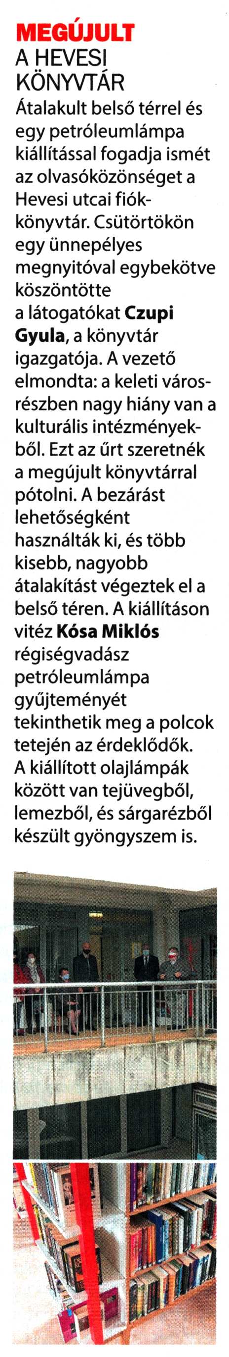 Nyilvános 1225 | 1851 | Kanizsa 2021. május 21. 8. szám 3. oldal | MEGÚJULT A HEVESI KÖNYVTÁR Átalakult belső térrel és egy petróleumlámpa kiállítással fogadja ismét az olvasóközönséget a Hevesi utcai fiókkönyvtár. Csütörtökön egy ünnepélyes megnyitóval egybekötve köszöntötte a látogatókat Czupi Gyula, a könyvtár igazgatója. A vezető elmondta: a keleti városrészben nagy hiány van a kulturális intézményekből. Ezt az űrt szeretnék a megújult könyvtárral pótolni. A bezárást lehetőségként használták ki, és több kisebb, nagyobb átalakítást végeztek el a belső téren. A kiállításon vitéz Kósa Miklós régiségvadász petróleumlámpa gyűjteményét tekinthetik meg a polcok tetején az érdeklődők. A kiállított olajlámpák között van tejüvegből, lemezből, és sárgarézből készült gyöngyszem is. |
