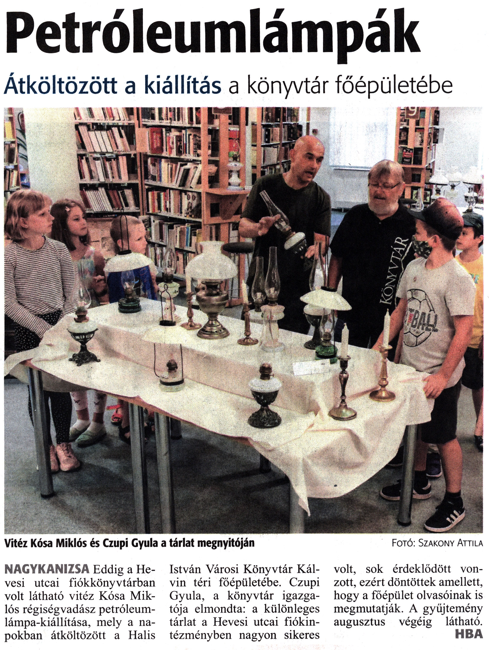 Nyilvános 1209 | 1709 | Zalai Hírlap 2021. július 7. 155. szám 16. oldal | Petróleumlámpák Átköltözött a kiállítás a könyvtár főépületébe Vitéz Kósa Miklós és Czupi Gyula a tárlat megnyitóján Fotó: Szakony Attila NAGYKANIZSA Eddig a Hevesi utcai fiókkönyvtárban volt látható vitéz Kósa Miklós régiségvadász petróleumlámpa-kiállítása, mely a napokban átköltözött a Halis István Városi Könyvtár Kálvin téri főépületébe. Czupi Gyula, a könyvtár igazgatója elmondta: a különleges tárlat a Hevesi utcai fiókintézményben nagyon sikeres volt, sok érdeklődött vonzott, ezért döntöttek amellett, hogy a főépület olvasóinak is megmutatják. A gyűjtemény augusztus végéig látható. HBA |